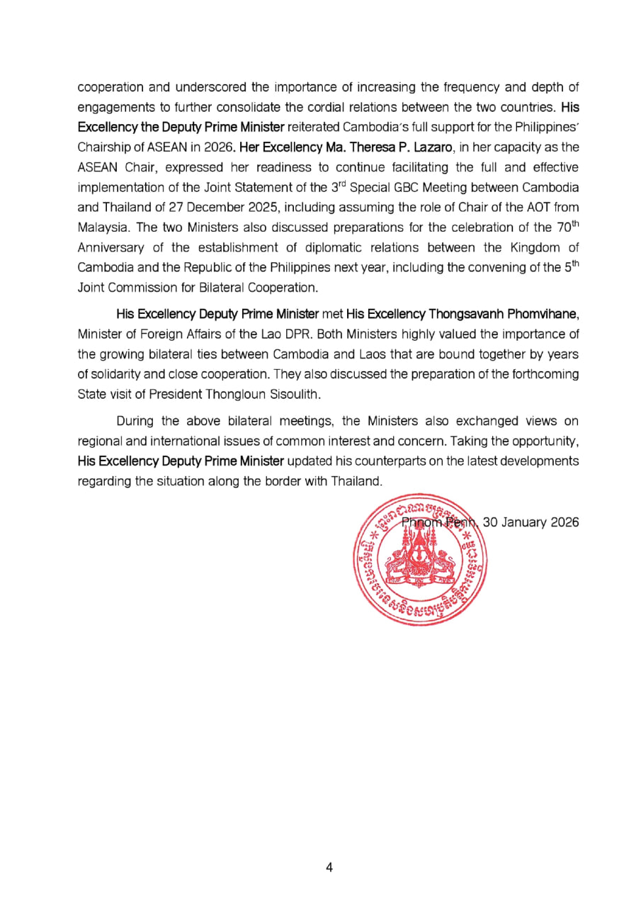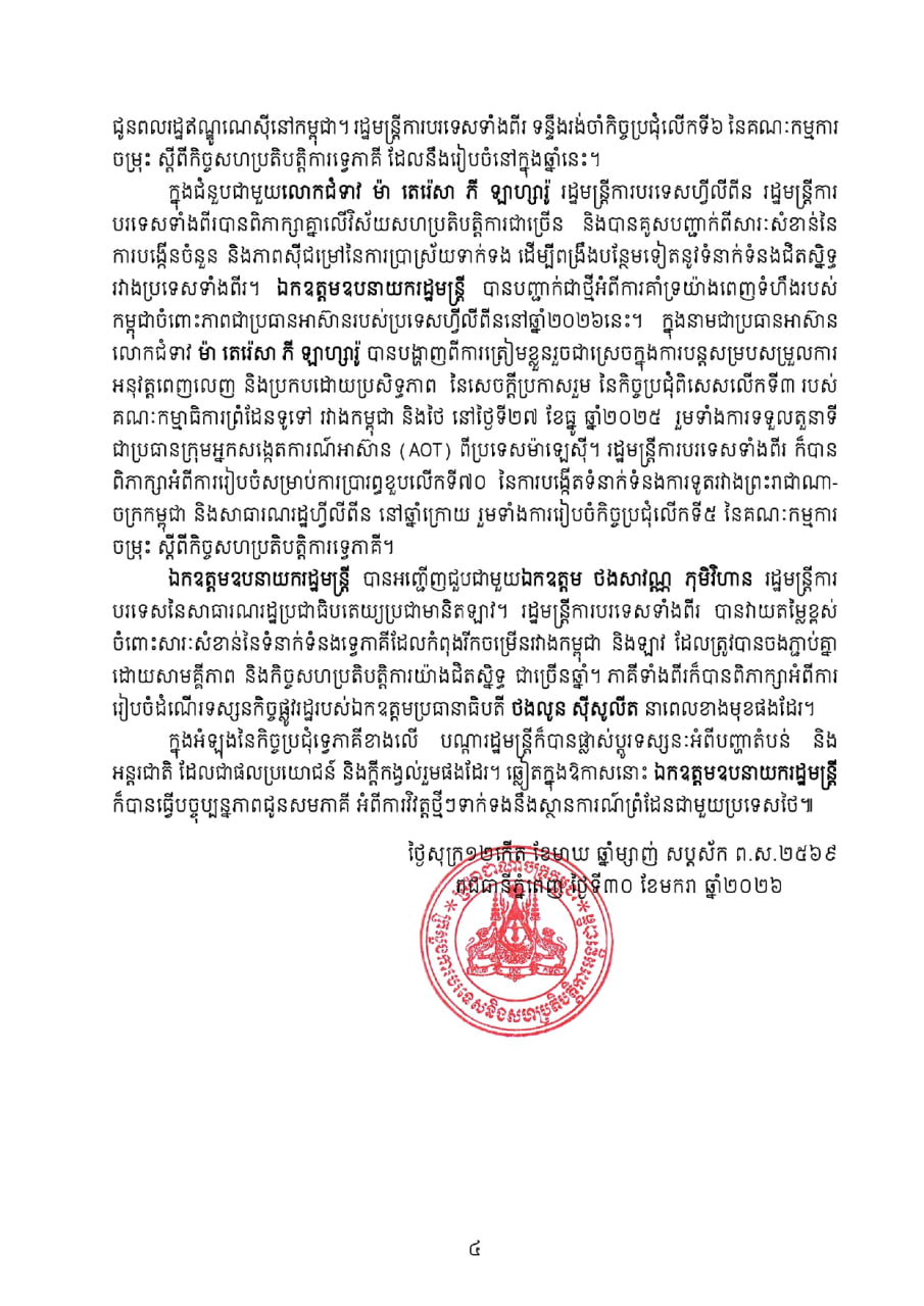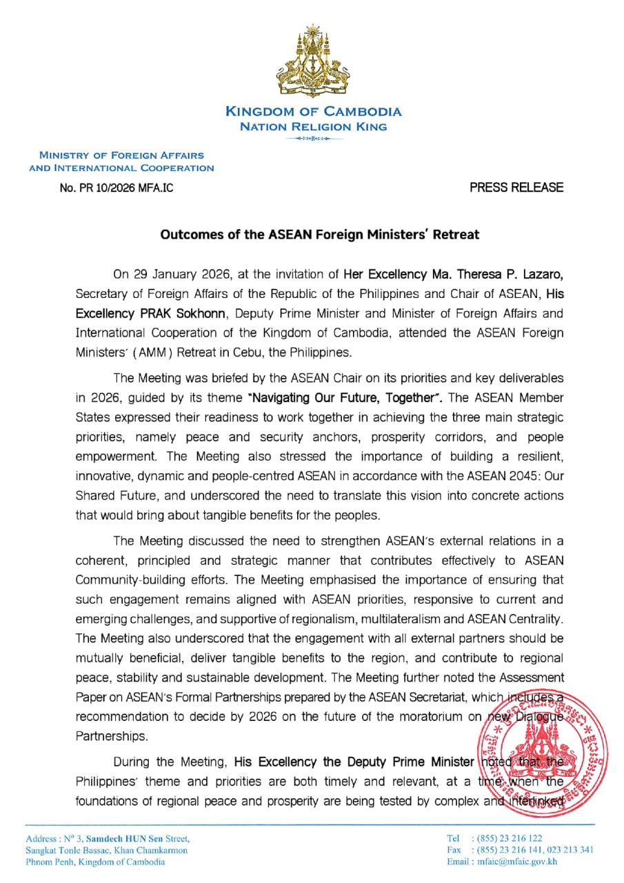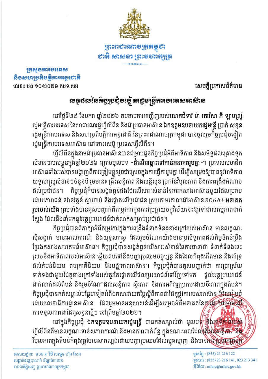 (ភ្នំពេញ)៖ យោងតាមសេចក្ដីប្រកាសលទ្ធផលនៃកិច្ចប្រជុំចង្អៀតរដ្ឋមន្ត្រីការបរទេសអាស៊ាន បានឱ្យដឹងថា លោកឧបនាយករដ្ឋមន្ត្រី ប្រាក់ សុខុន រដ្ឋមន្ត្រីក្រសួងការបរទេស និងសហប្រតិបត្តិការអន្តរជាតិ បានលើកឡើង៣ចំណុចសំខាន់ទៅអាស៊ាន ដើម្បីដោះស្រាយភាពតានតឹងក្នុងតំបន់។