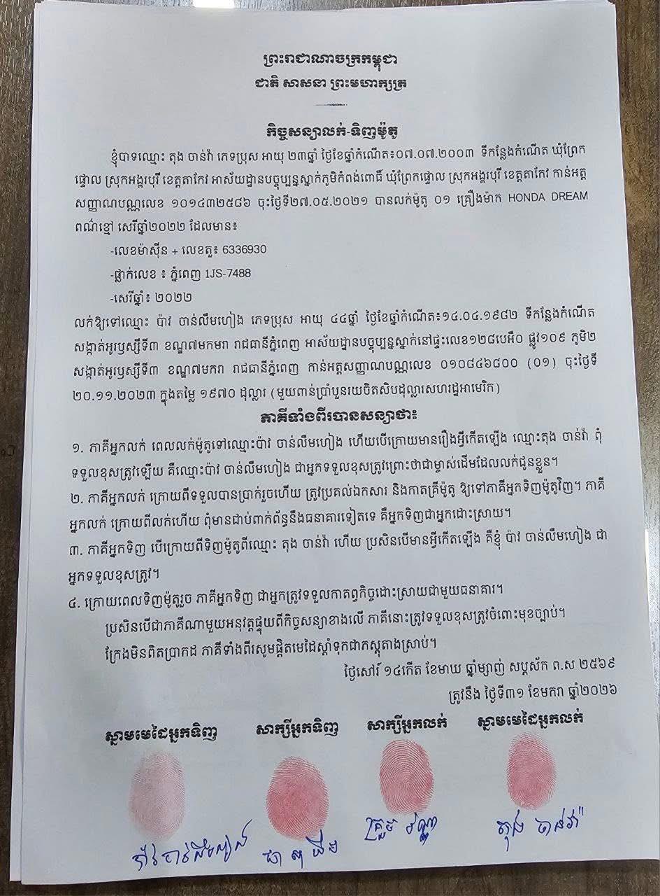 ក្រោយពី លោក ឧត្តមសេនីយ៏ឯក ជួន ណា រិន្ទ អគ្គស្នងការរងនិងជា ស្នងការដ្ឋាននគរបាលរាជធានីភ្នំពេញ ប្រកាសអោយមន្ត្រីជំនាញ ស្រាវជ្រាវ ពេលនេះ អ្នកលក់ម៉ូតូ បង់រំលស់មិនទាន់ដាច់ លក់ អោយគេ. ភាគីទាំងពីរបានព្រមព្រៀងគ្នាដោះស្រាយបញ្ចប់ហេីយនៅយប់ថ្ងៃទី31មករា2026។