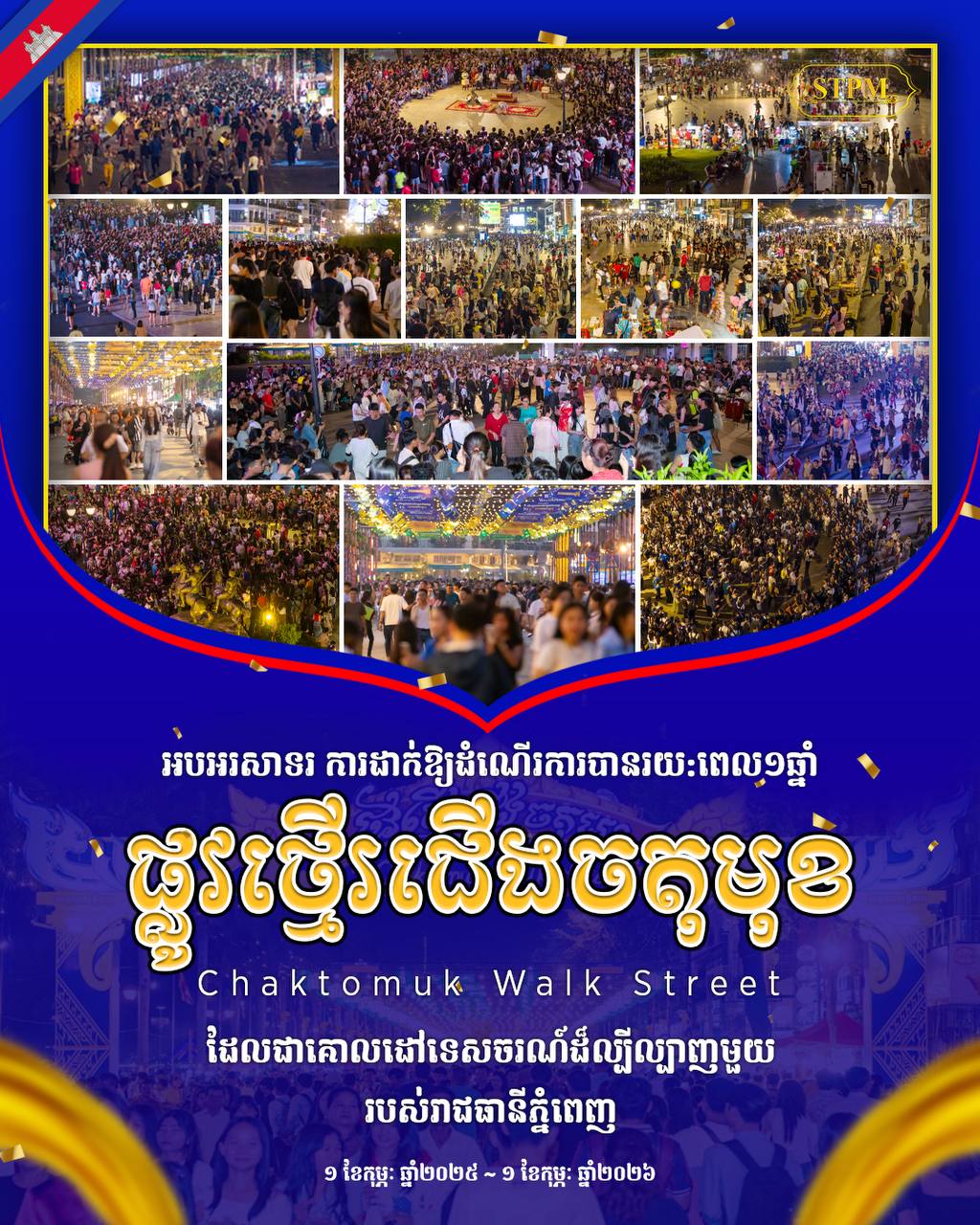 (ភ្នំពេញ)៖ សម្តេចបវរធិបតី ហ៊ុន ម៉ាណែត នាយករដ្ឋមន្ត្រីនៃកម្ពុជា នៅថ្ងៃទី១ ខែកុម្ភៈ ឆ្នាំ២០២៦នេះ បានបង្ហោះសារអបអរសាទរ «ផ្លូវថ្មើរជើងចតុមុខ» ជាគោលដៅទេសចរណ៍ដ៏ល្បីល្បាញមួយរបស់រាជធានីភ្នំពេញ បានដាក់ឱ្យដំណើរការរយៈពេល១ឆ្នាំហើយ។