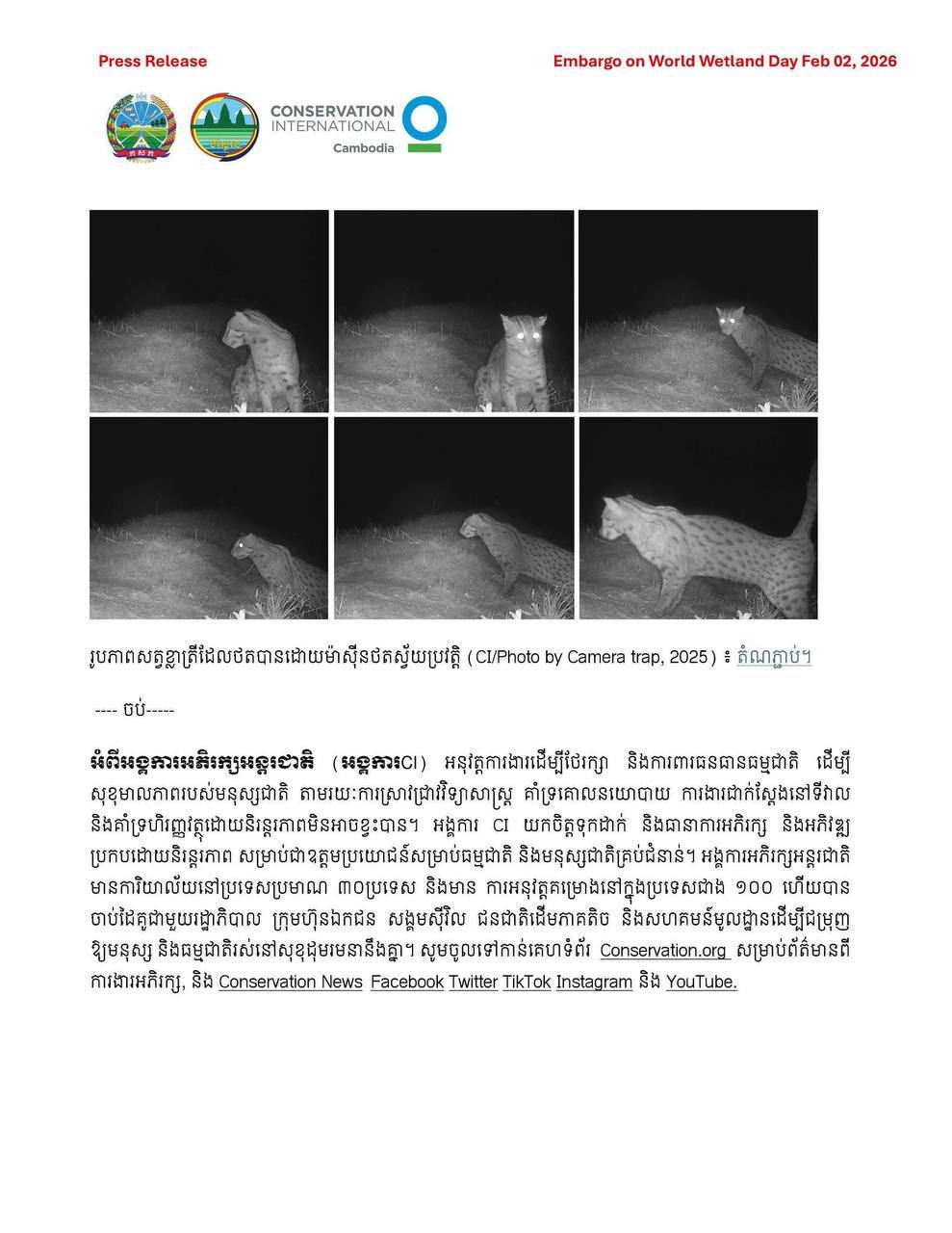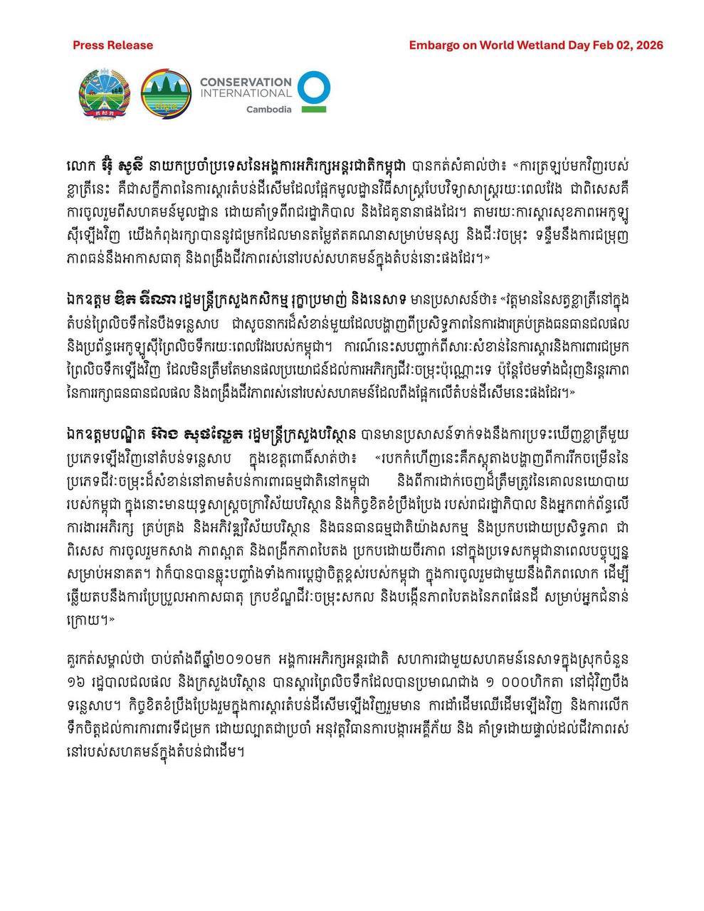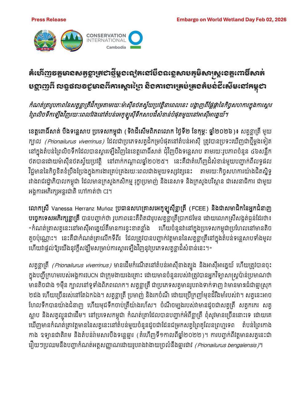 សេចក្តីប្រកាសព័ត៌មាន ស្តីពីគំហើញវត្តមានសត្វខ្លាត្រីជាថ្មីម្តងទៀត នៅបឹងទន្លេសាបភូមិសាស្រ្តខេត្តពោធិ៍សាត់ បង្ហាញពី លទ្ធផលវិជ្ជមានពីការស្តារព្រៃ និងការងារគ្រប់គ្រងតំបន់ដីសើមនៅកម្ពុជា ៕