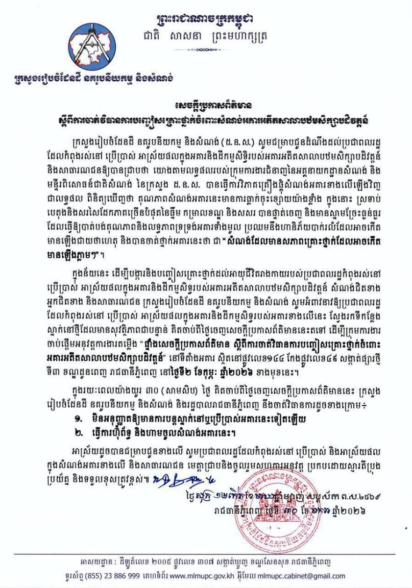 ក្រសួងបញ្ជាក់ថា ក្នុងន័យនេះ ដើម្បីបង្ការ និងបញ្ចៀសគ្រោះថ្នាក់ដល់អាយុជីវិតរាងកាយរបស់ប្រជាពលរដ្ឋកំពុងរស់នៅប្រើប្រាស់ អាស្រ័យផលក្នុងអគារនិងដីកម្មសិទ្ធរបស់អគារអតីតសាលាបឋមសិក្សាបដិវត្តន៍ សំណង់ជិតខាង អ្នកជិតខាង និងសាធារណជន ក្រសួងរៀបចំដែនដី នគរូបនីយកម្ម និងសំណង់ បានអំពាវនាវឱ្យប្រជាពលរដ្ឋ ដែលកំពុងរស់នៅ ប្រើប្រាស់ អាស្រ័យផលក្នុងអគារនិងដីកម្មសិទ្ធរបស់អគារខាងលើនេះ ស្វែងរកទីកន្លែងស្នាក់នៅថ្មីដែលមានសុវត្ថិភាពជាបន្ទាន់ គិតចាប់ពីថ្ងៃចេញសេចក្តីប្រកាសព័ត៌មាននេះតទៅ ដើម្បីក្រុមការងារ ចាប់ផ្តើមអនុវត្តការងារតម្លើង «ផ្ទាំងសេចក្តីប្រកាសព័ត៌មាន ស្តីពីការចាត់វិធានការបញ្ចៀសគ្រោះថ្នាក់ចំពោះ អគារអតីតសាលាបឋមសិក្សាបដិវត្តន៍» នៅទីតាំងអគារ ស្ថិតនៅផ្លូវលេខ១៤៤ កែងផ្លូវលេខ៤៩ សង្កាត់ផ្សារថ្មីទី៣ ខណ្ឌដូនពេញ រាជធានីភ្នំពេញ នៅថ្ងៃទី២ ខែកុម្ភៈ ឆ្នាំ២០២៦ ខាងមុខនេះ។