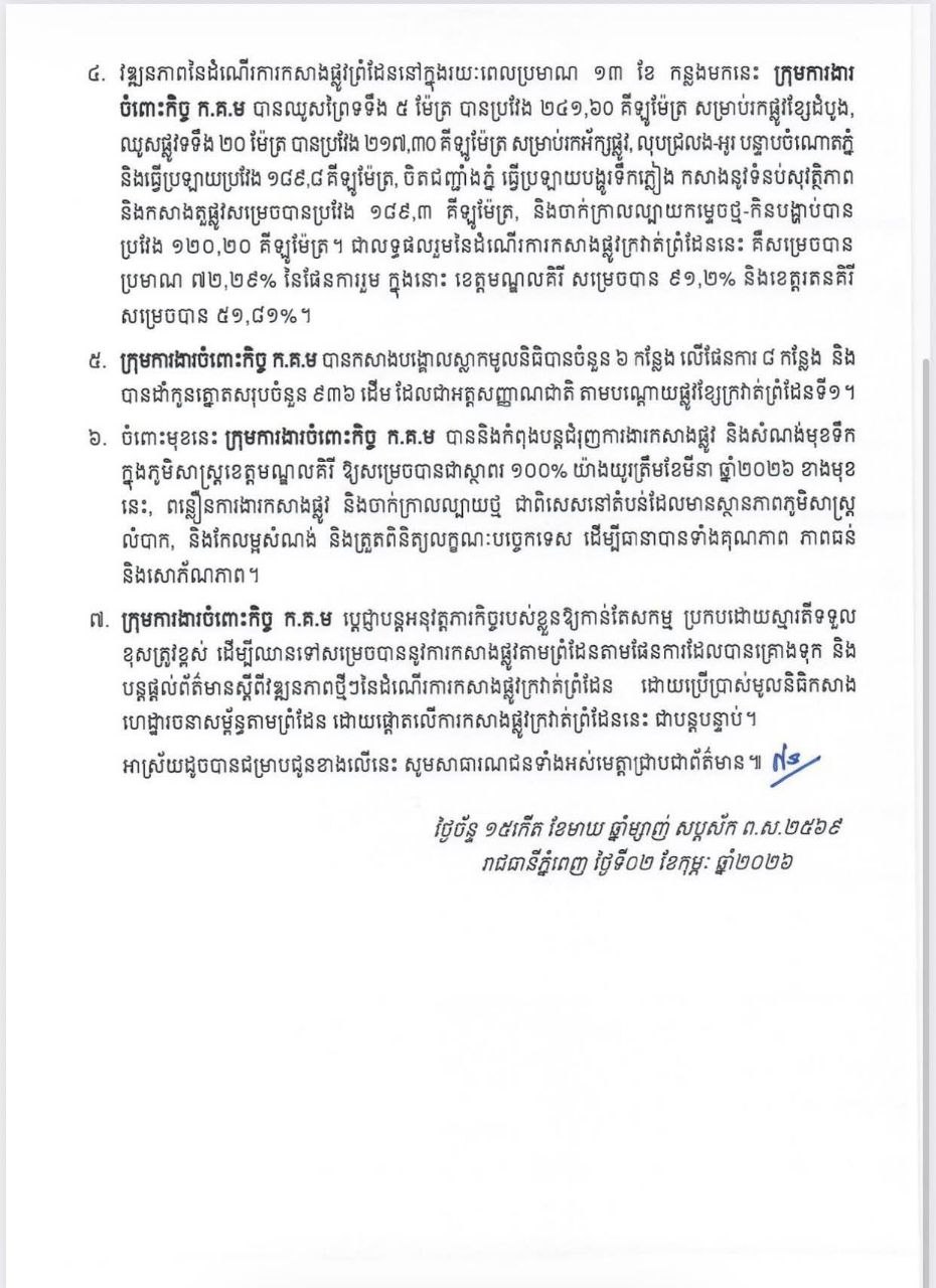 សេចក្តីប្រកាសព័ត៌មាន ស្តីពី វឌ្ឍនភាព នៃការកសាងផ្លូវក្រវាត់ព្រំដែន ដោយប្រើប្រាស់ មូលនិធិកសាងហេដ្ឋារចនាសម្ព័ន្ធតាមព្រំដែន ដោយផ្តោតលើការកសាងផ្លូវក្រវាត់ព្រំដែន។