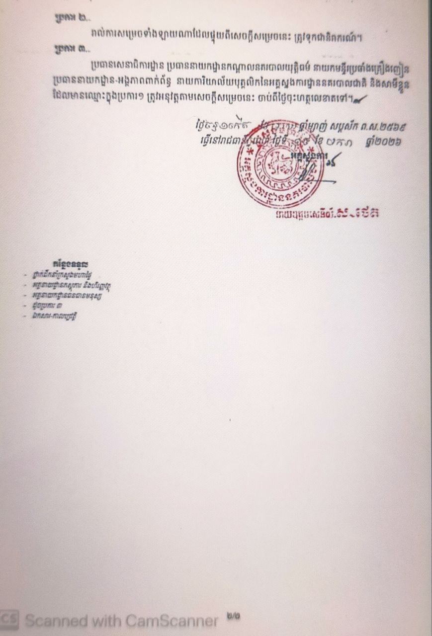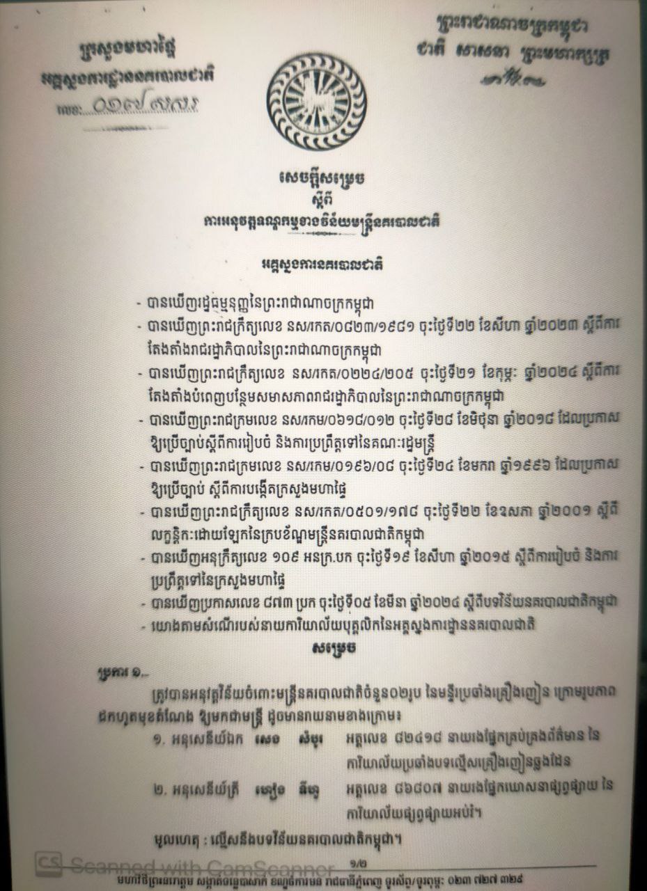 នាយឧត្តមសេនីយ៍ ស ថេត អគ្គស្នងការនគរបាលជាតិ បានចេញសេចក្តីសម្រេចអនុវត្តវិន័យចំពោះមន្ត្រីនគរបាលជាតិចំនួន ២រូប នៃមន្ទីរប្រឆាំងគ្រឿងញៀន ក្រោមរូបភាពដកហូតមុខតំណែងឲ្យមកជាមន្ត្រី ៕