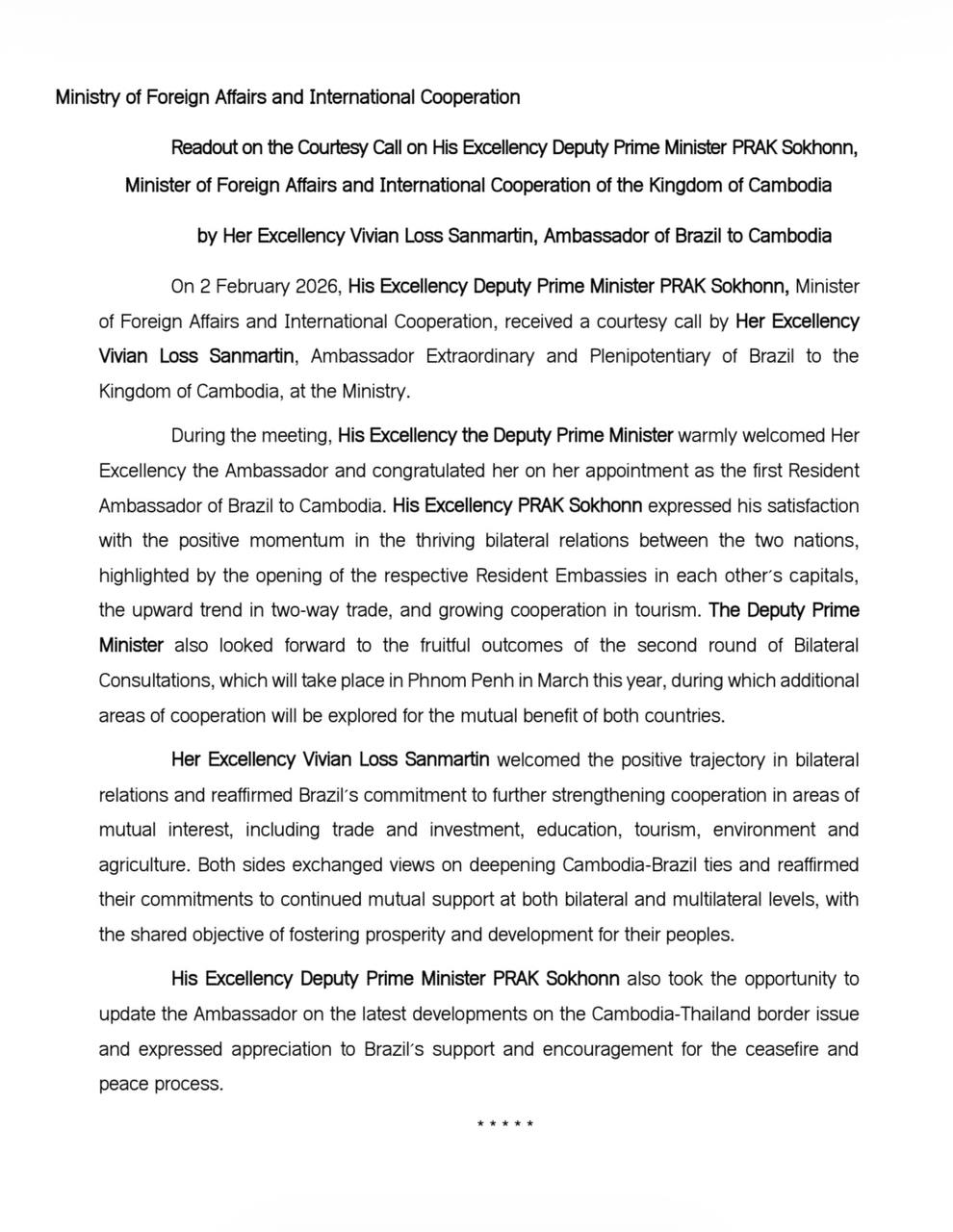 ក្នុងអំឡុងពេលនៃកិច្ចប្រជុំ លោកឧបនាយករដ្ឋមន្ត្រី បានស្វាគមន៍យ៉ាងកក់ក្តៅ និងអបអរសាទរ ចំពោះការតែងតាំងលោកស្រី ជាឯកអគ្គរដ្ឋទូតដំបូងរបស់ប្រទេសប្រេស៊ីលប្រចាំកម្ពុជា ដែលមាន និវេសនដ្ឋាននៅទីក្រុងភ្នំពេញ។
