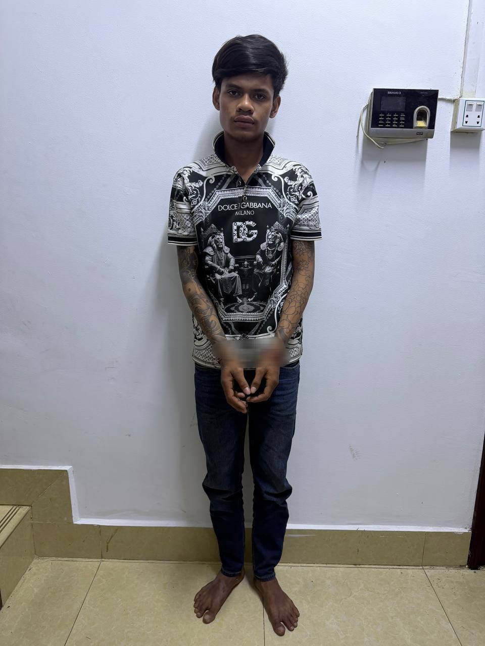 ៤-ឈ្មោះ ថុល វិចិត្រ ភេទប្រុស អាយុ១៨ឆ្នាំ ជនជាតិខ្មែរ មុខរបរកម្មកររោងចក្រ ស្នាក់នៅភូមិសរបាំង ឃុំក្រាំងម្កាក់ ស្រុកអង្គស្នួល ខេត្តកណ្ដាល (ឃាត់ខ្លួន គ្មានសារធាតុញៀន) ។