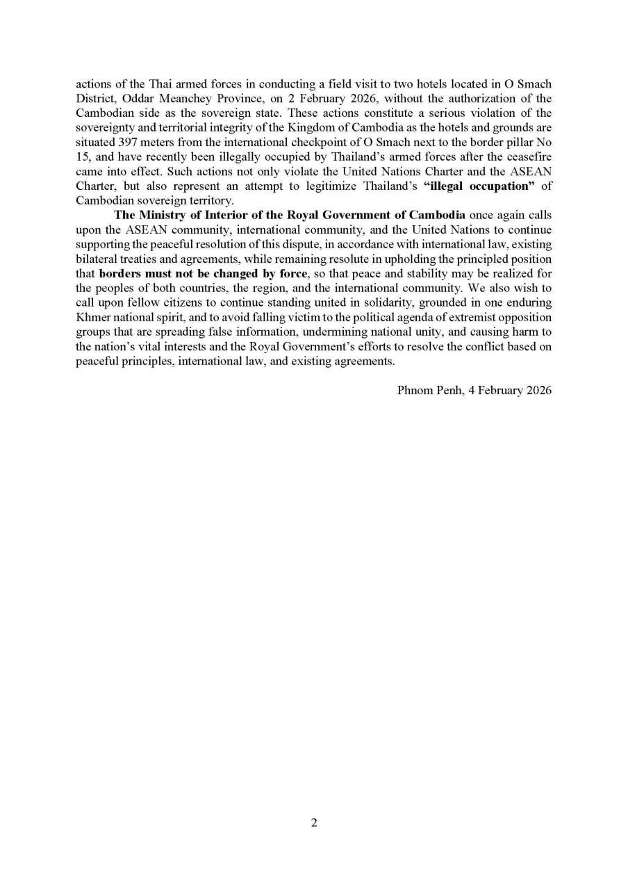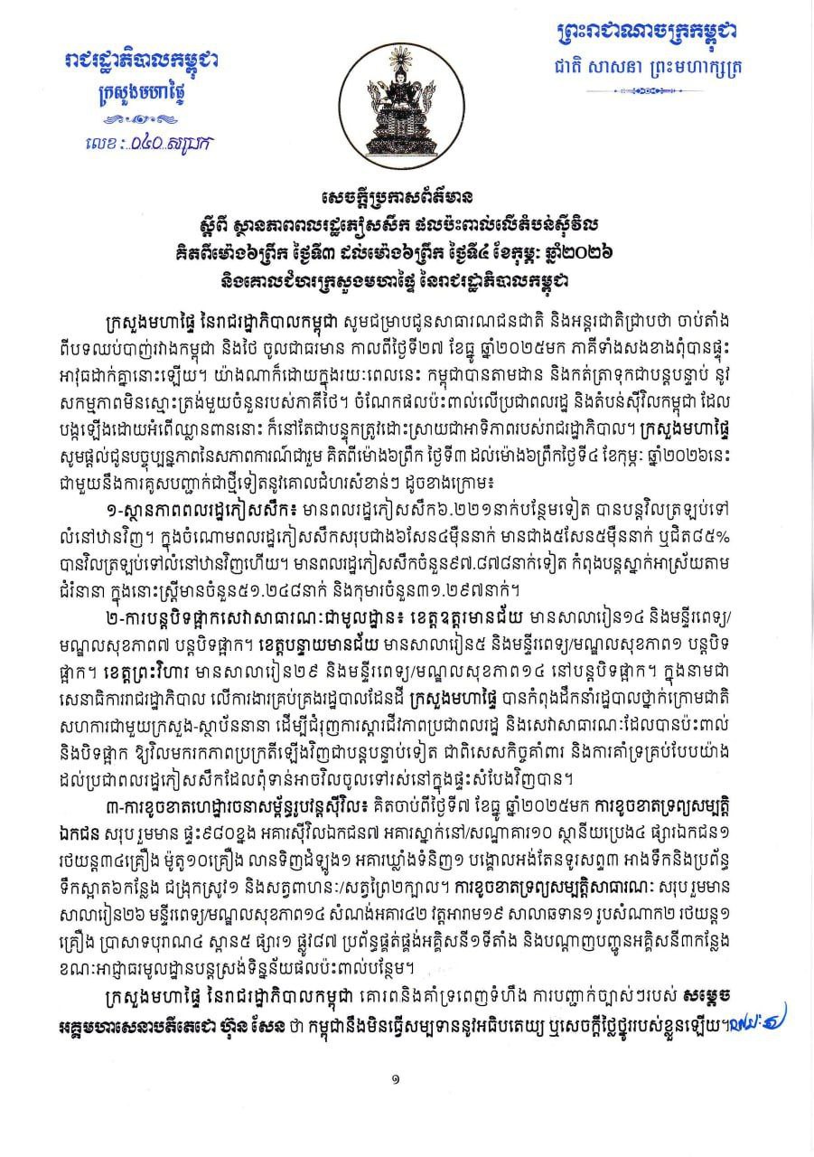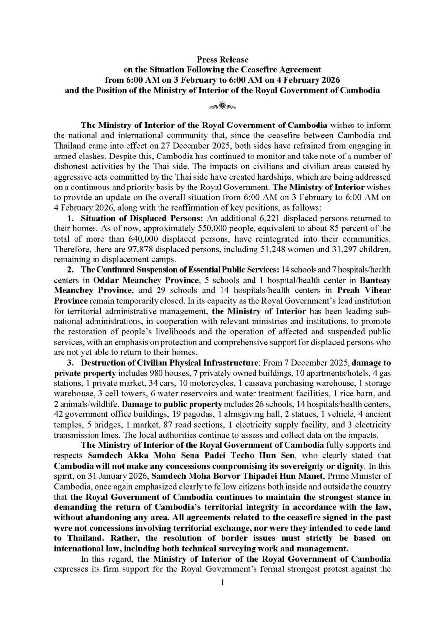 គិតត្រឹមព្រឹកថ្ងៃទី៤ ខែកុម្ភៈនេះ មានពលរដ្ឋភៀសសឹក ៦.២២១នាក់ទៀតបានវិលទៅលំនៅឋាន។ ក្នុងចំណោមពលរដ្ឋភៀសសឹកជាងប៦សែន ៤ម៉ឺននាក់ មានប្រមាណ ៨៥ភាគរយហើយបានវិលទៅលំនៅឋានវិញ។
