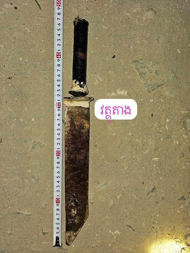 វត្ថុតាងចាបយក រួមមាន: កាំបិតដងដែកប្រវែង ជិតកន្លះម៉ែត្រ ( ០,៤៧ មែត្រ) , ម៉ូតូចំនួន០១គ្រឿងម៉ាកហុងដាឌ្រីមពណ៌ក្រហមពាក់ស្លាកលេខភ្នំពេញ1JP-8249 ជារបស់ជនរងគ្រោះរងការខូចខាត ។