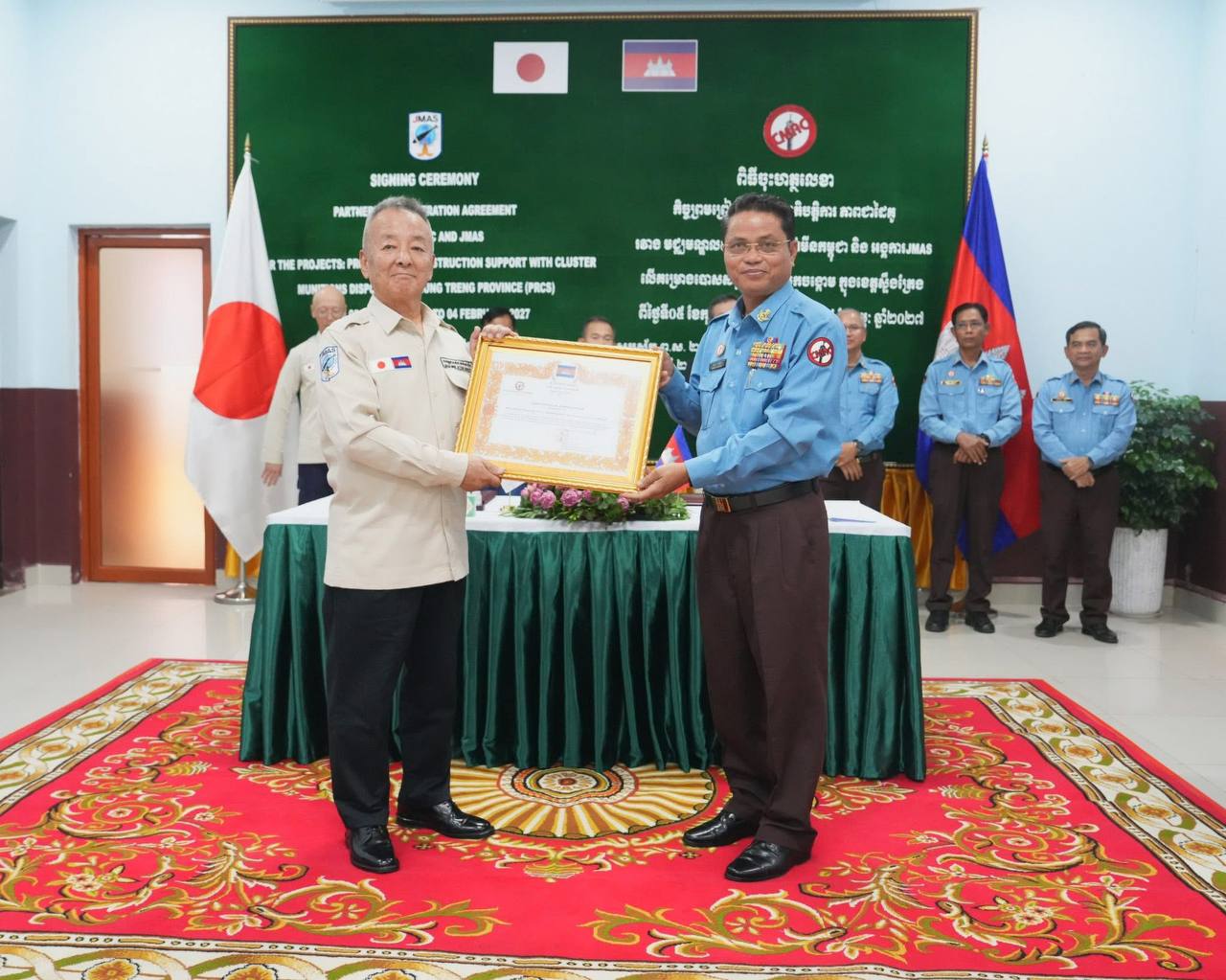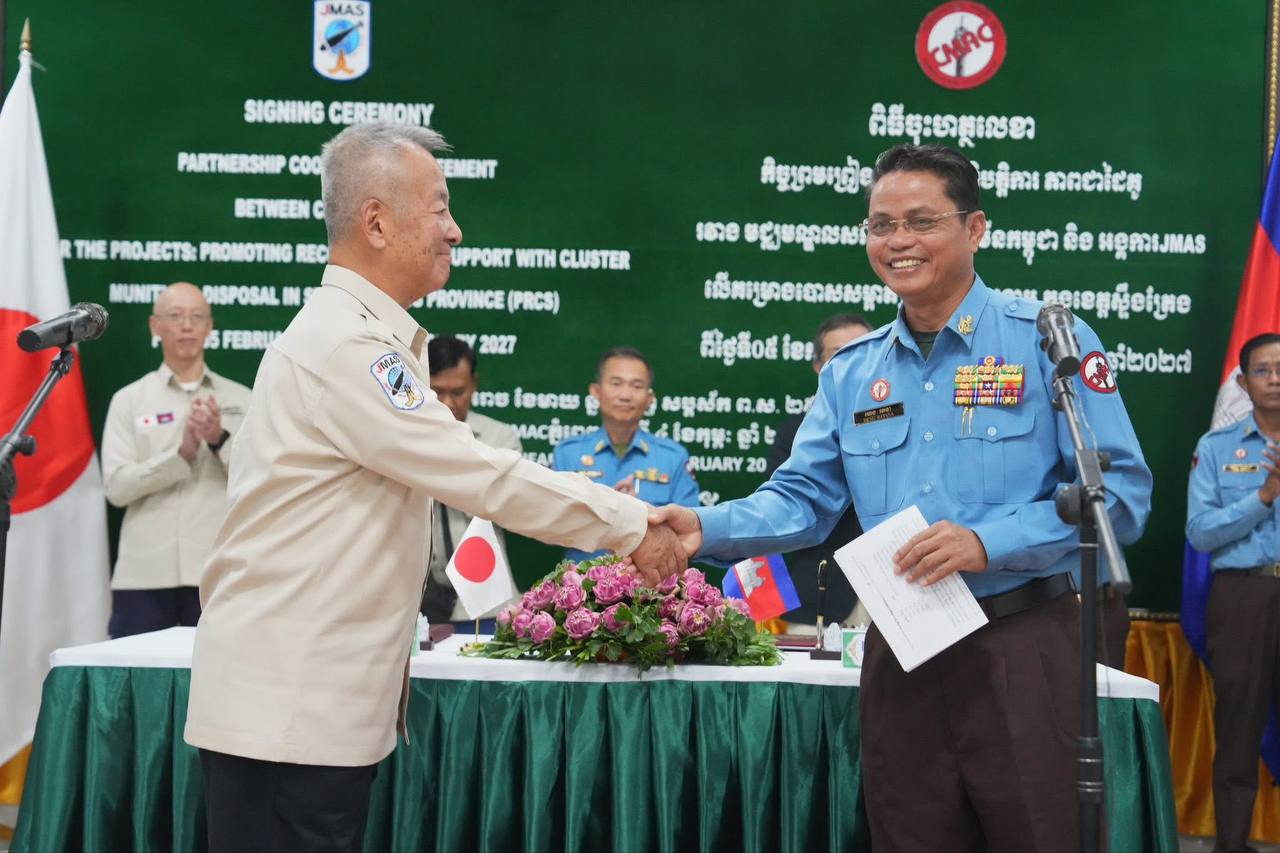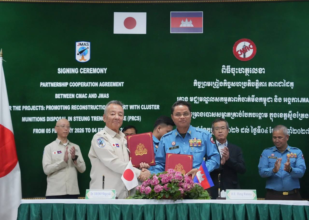 ភ្នំពេញ៖ នៅរសៀលថ្ងៃទី៤ ខែកុម្ភៈ ឆ្នាំ២០២៦ នៅទីបញ្ជាការស៊ីម៉ាក់ភ្នំពេញ ឯកឧត្តម ហេង រតនា ប្រតិភូរាជរដ្ឋាភិបាលទទួលបន្ទុកជាអគ្គនាយកស៊ីម៉ាក់ និងលោកបណ្ឌិត UNRAN Shigeyuki ប្រធានអង្គការJMAS ប្រចាំកម្ពុជាបានចុះហត្ថលេខាលើកិច្ចសហប្រតិបត្តិការភាពជាដៃគូរវាងមជ្ឈមណ្ឌលសកម្មភាពកំចាត់មីនកម្ពុជា និងអង្គការJMAS ក្នុងការអនុវត្តគម្រោងបោសសម្អាតគ្រាប់បែកចង្កោម សម្រាប់រយៈពេល១២ខែ ពីថ្ងៃទី០៥ ខែកុម្ភៈ ឆ្នាំ២០២៦ ដល់ ថ្ងៃទី០៤ ខែកុម្ភៈ ឆ្នាំ២០២៧ ដែលនឹងត្រូវបោសសម្អាតគ្រាប់បែកចង្កោមលើផ្ទៃដីទំហំប្រមាណជាង៣០០ហិកតា ស្ថិតក្នុងភូមិសាស្រ្តខេត្តស្ទឹងត្រែង ដែលមានថវិកាគម្រោងចំនួន១៨៤.៤៧១ ដុល្លារសហរដ្ឋអាមេរិកនិងថវិកាក្នុងគម្រោងមួយចំនួនទៀតអង្គការJMASជួយអភិវឌ្ឍន៍សហគមន៍ដោយផ្ទាល់។