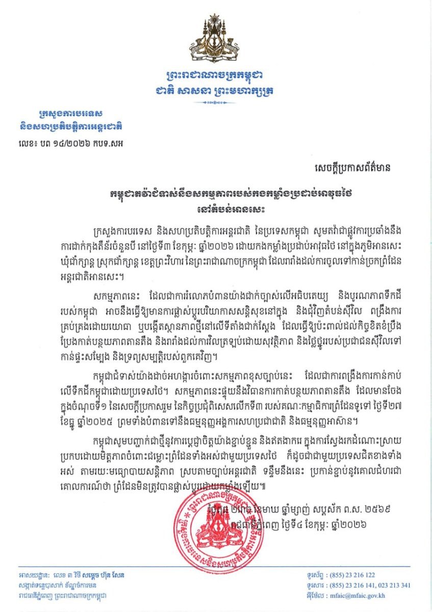 «កម្ពុជាជំទាស់យ៉ាងដាច់អហង្ការចំពោះសកម្មភាពខុសច្បាប់នេះ ដែលជាការពង្រឹងការកាន់កាប់ លើទឹកដីកម្ពុជាដោយប្រទេសថៃ។ សកម្មភាពនេះផ្ទុយនឹងវិធានការកាត់បន្ថយភាពតានតឹង ដែលមានចែង ក្នុងចំណុចទី១ នៃសេចក្តីប្រកាសរួម នៃកិច្ចប្រជុំពិសេសលើកទី៣ របស់គណៈកម្មាធិការព្រំដែនទូទៅ ថ្ងៃទី២៧ ខែធ្នូ ឆ្នាំ២០២៥ ព្រមទាំងបំពានទៅនឹងធម្មនុញ្ញអង្គការសហប្រជាជាតិ និងធម្មនុញ្ញអាស៊ាន»។ នេះបើតាមការបញ្ជាក់នៅក្នុងសេចក្ដីប្រកាសព័ត៌មាន។