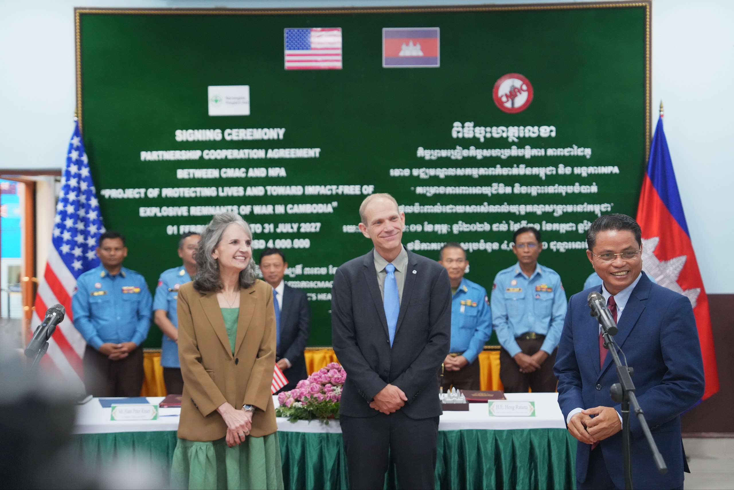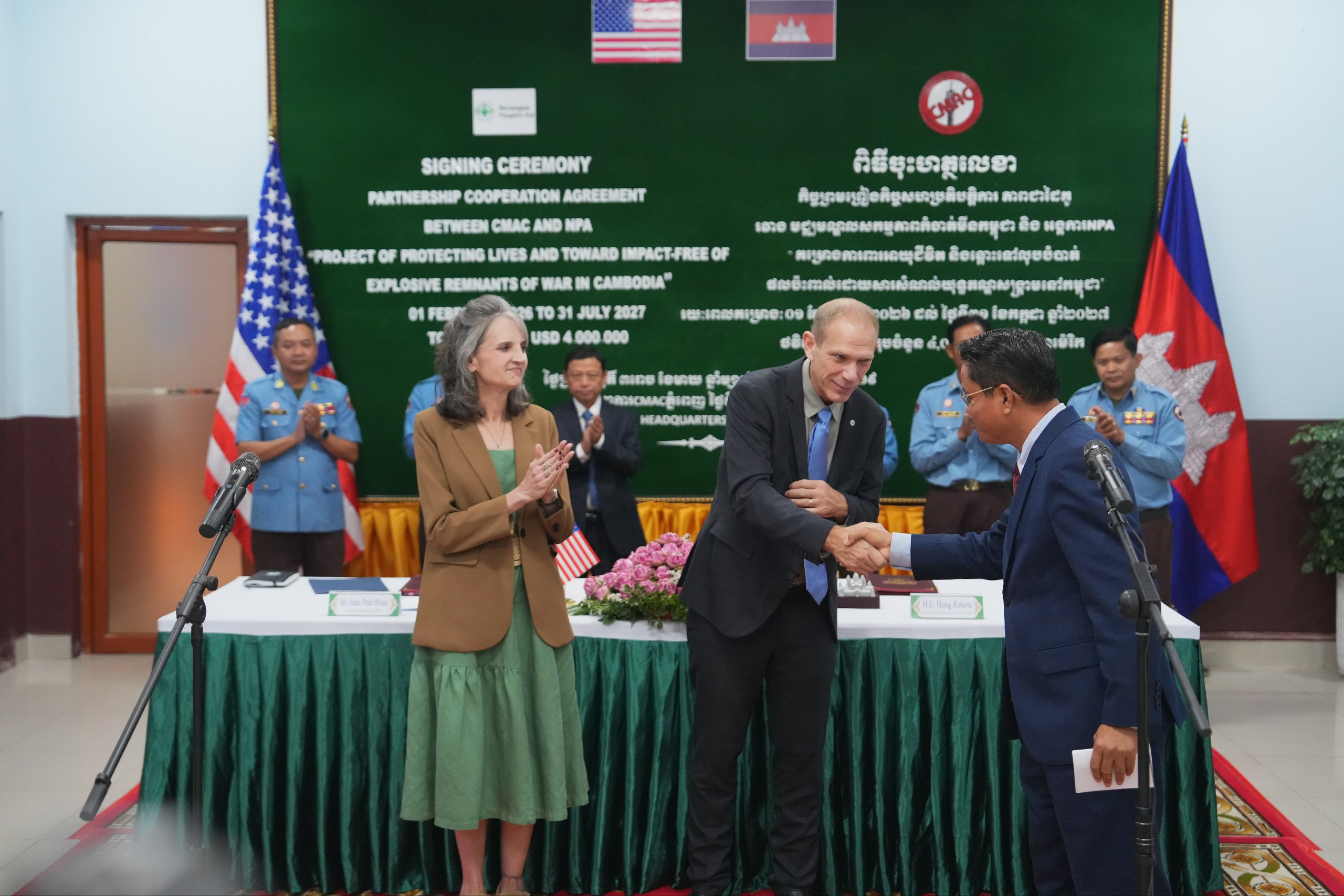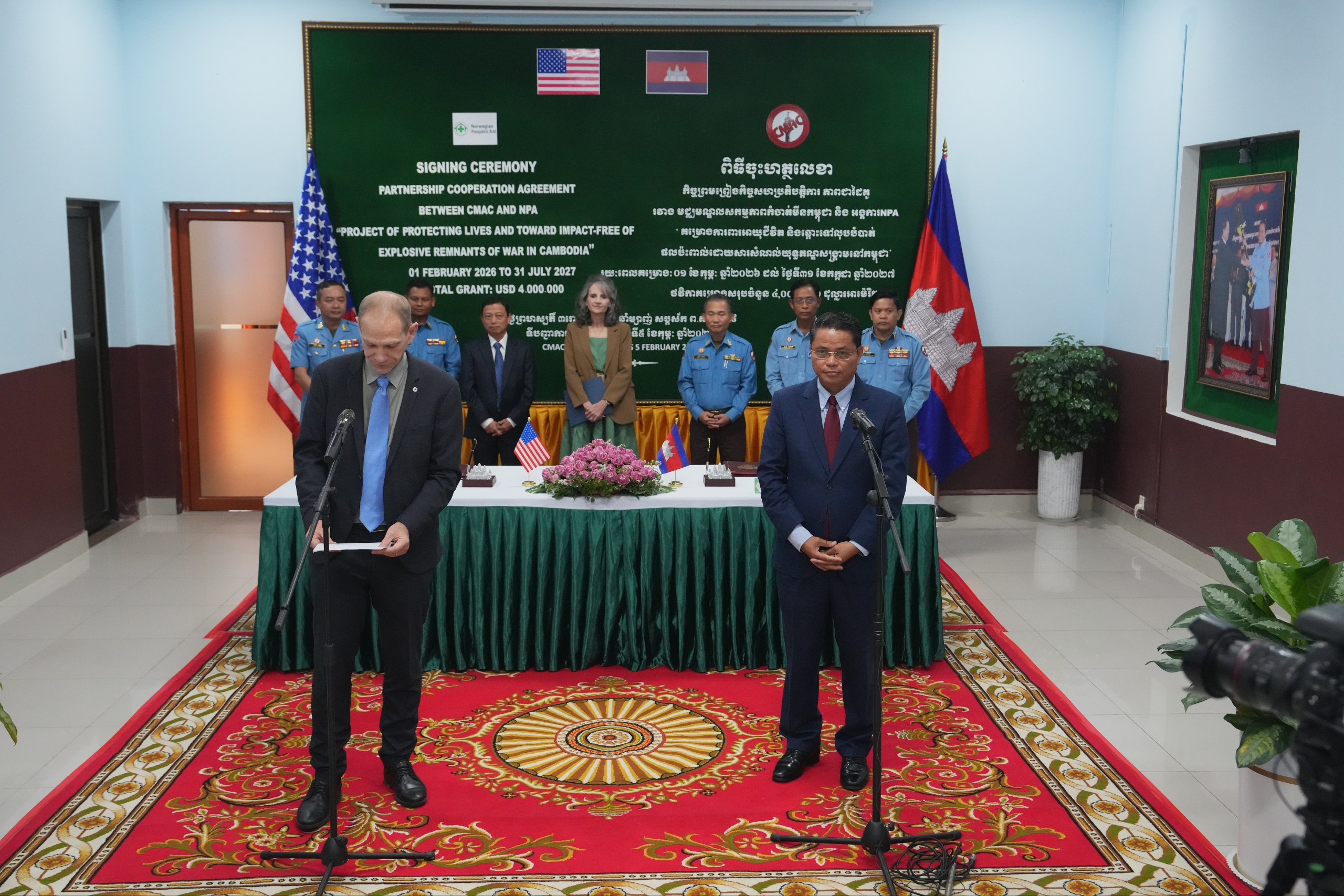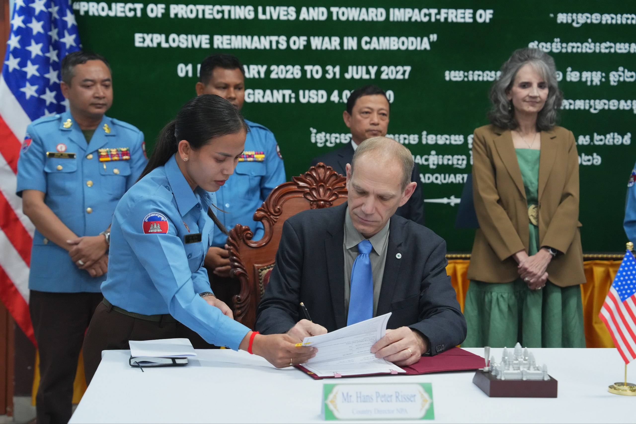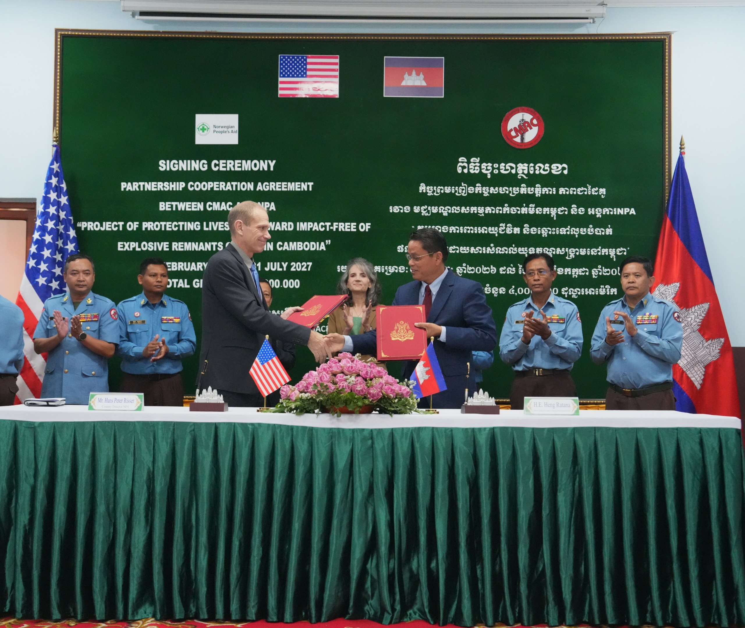 (ភ្នំពេញ)៖ លោក ហេង រតនា ប្រតិភូរាជរដ្ឋាភិបាលទទួលបន្ទុកជាអគ្គនាយកមជ្ឈមណ្ឌលសកម្មភាពកំចាត់មីនកម្ពុជា (CMAC) និងលោក Hans Peter Risser ប្រធានអង្គការ NPA របស់អាមេរិក នៅរសៀលថ្ងៃទី៥ ខែកុម្ភៈ ឆ្នាំ២០២៦ បានចុះហត្ថលេខាលើកិច្ចព្រមព្រៀងកិច្ចសហប្រតិបត្តិការភាពជាដៃគូ CMAC និងអង្គការNPA ក្រោមគម្រោង «ការពារអាយុជីវិត និងឆ្ពោះទៅលុបបំបាត់ផលប៉ះពាល់ ដោយសារសំណល់យុទ្ធភណ្ឌសង្គ្រាមនៅកម្ពុជា»។