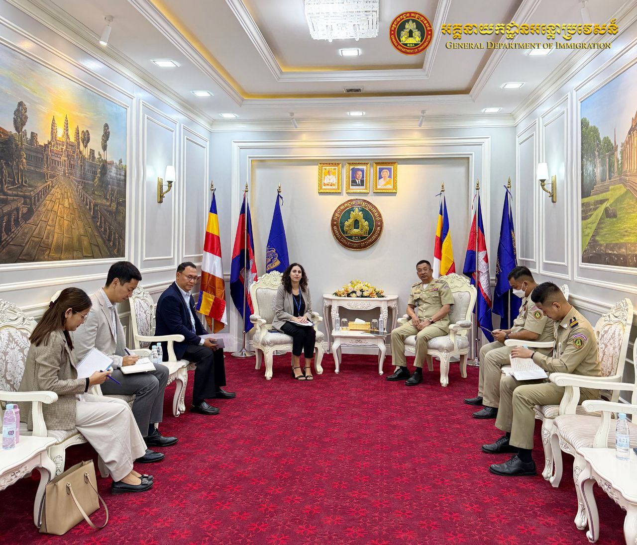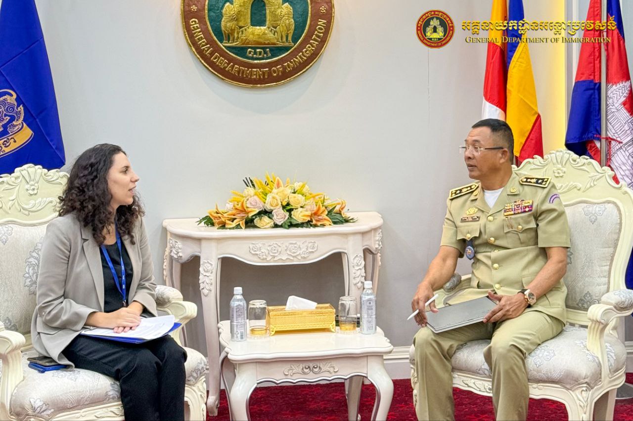ឯកឧត្តម ឧត្តមសេនីយ៍ឯក កែម សារិន អគ្គនាយករងអន្តោប្រវេសន៍ បានជួបសម្តែងការគួរសមជាមួយនឹងលោកស្រី បេនីឌែតា ប៉ូស្ទីកលីអូនី តំណាងអង្គការអន្តរជាតិទេសន្តរប្រវេសន៍ IOM ដើម្បីពិភាក្សាការងារ។