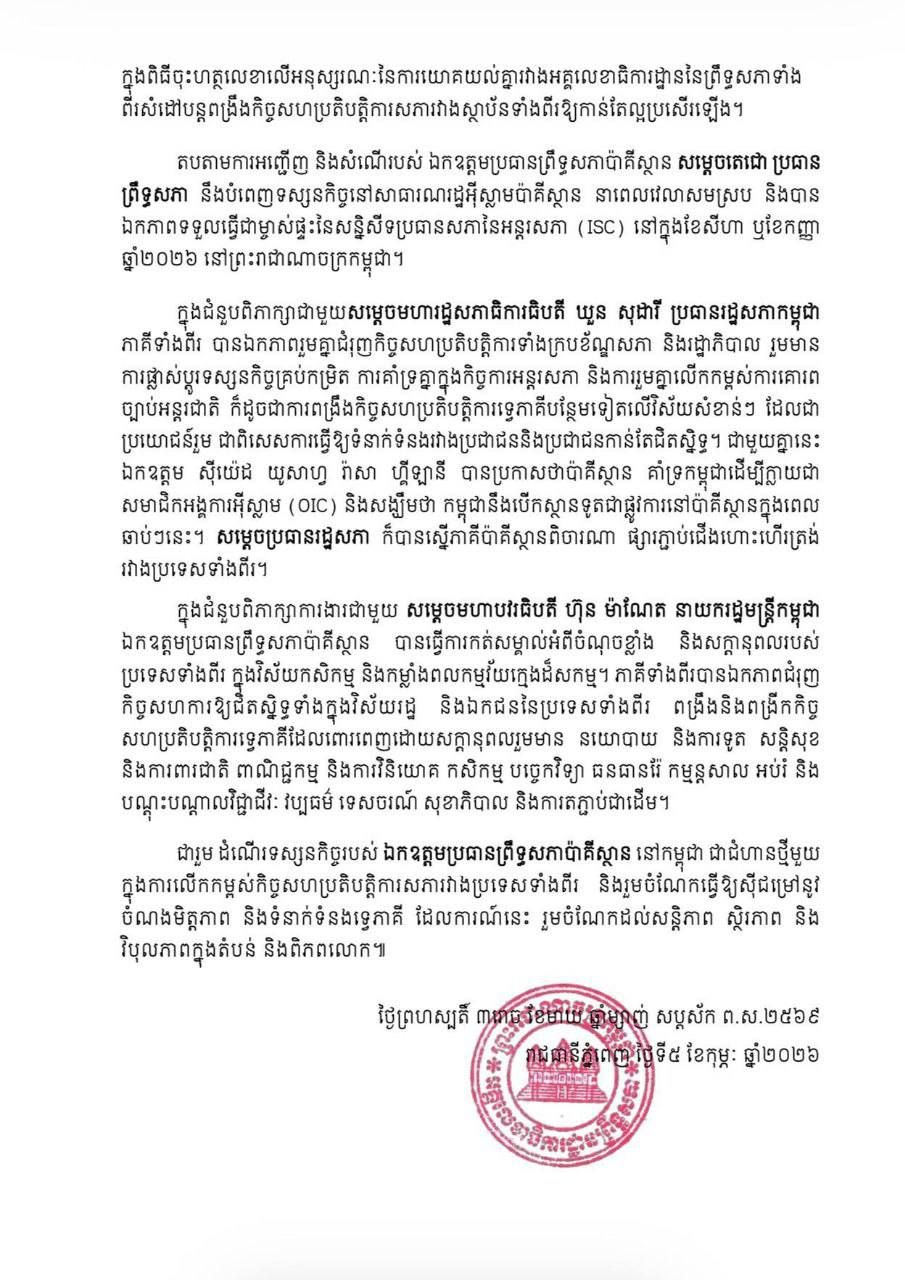 ព្រឹទ្ធសភា ចេញសេចក្តីប្រកាសព័ត៌មានស្តីពី លទ្ធផលនៃដំណើរទស្សនកិច្ចផ្លូវការ របស់ឯកឧត្តម ស៊ីយ៉េដ យូសាហ្វ រ៉ាសា ហ្គីឡានី ប្រធានព្រឹទ្ធសភា នៃសាធារណរដ្ឋអ៊ីស្លាមប៉ាគីស្ថាន នៅព្រះរាជាណាចក្រកម្ពុជា ពីថ្ងៃទី២-៥ ខែកុម្ភៈ ឆ្នាំ២០២៦។