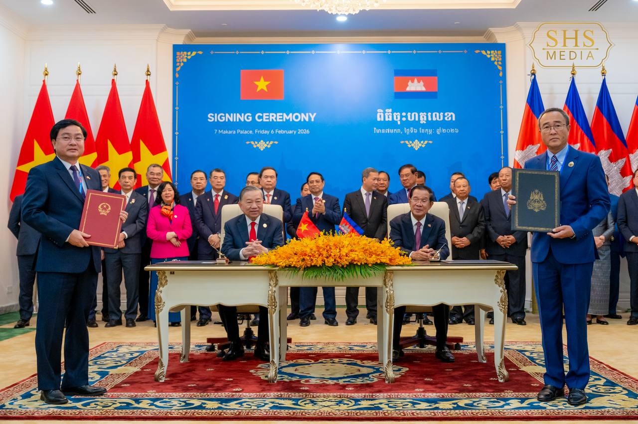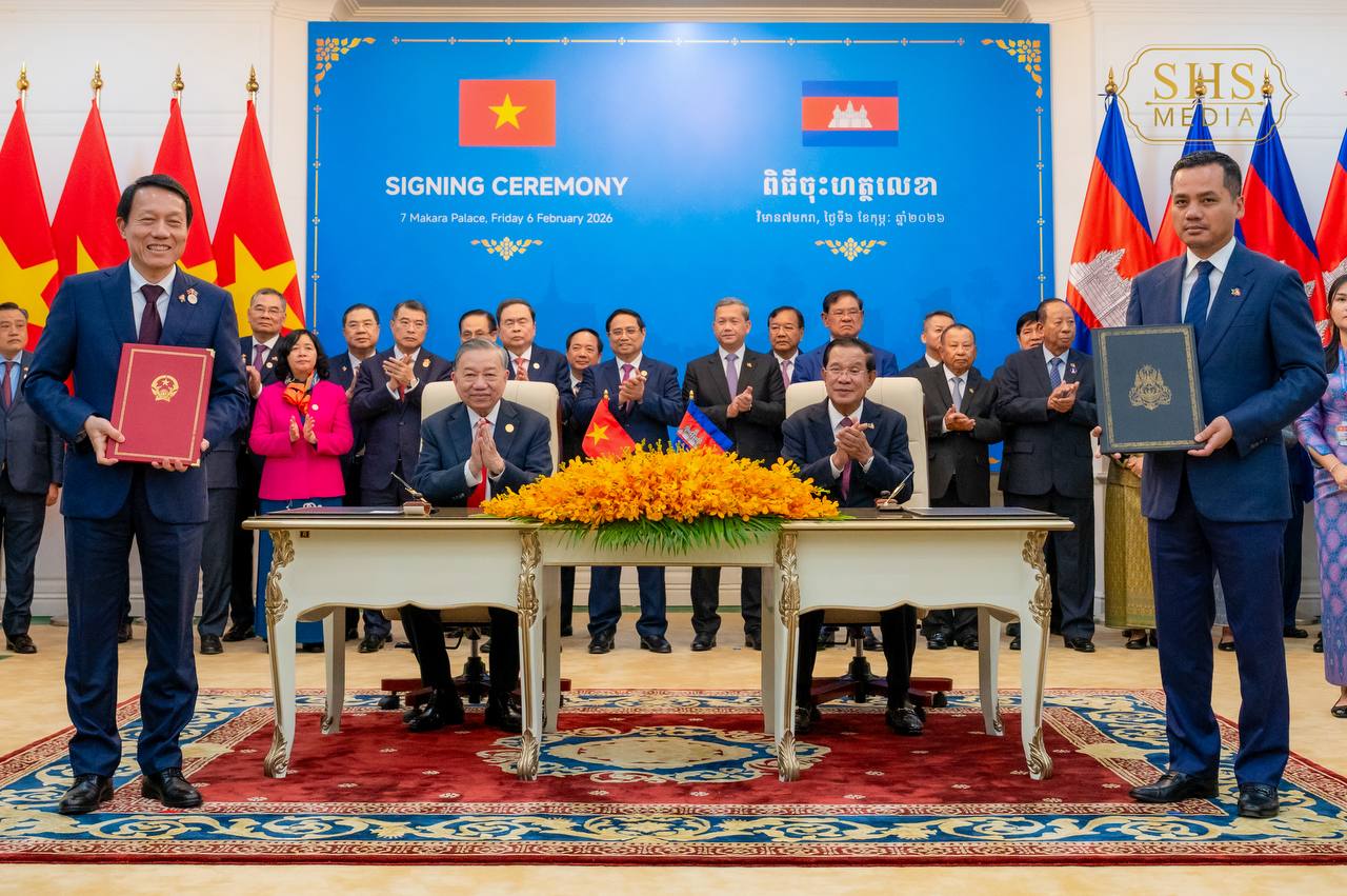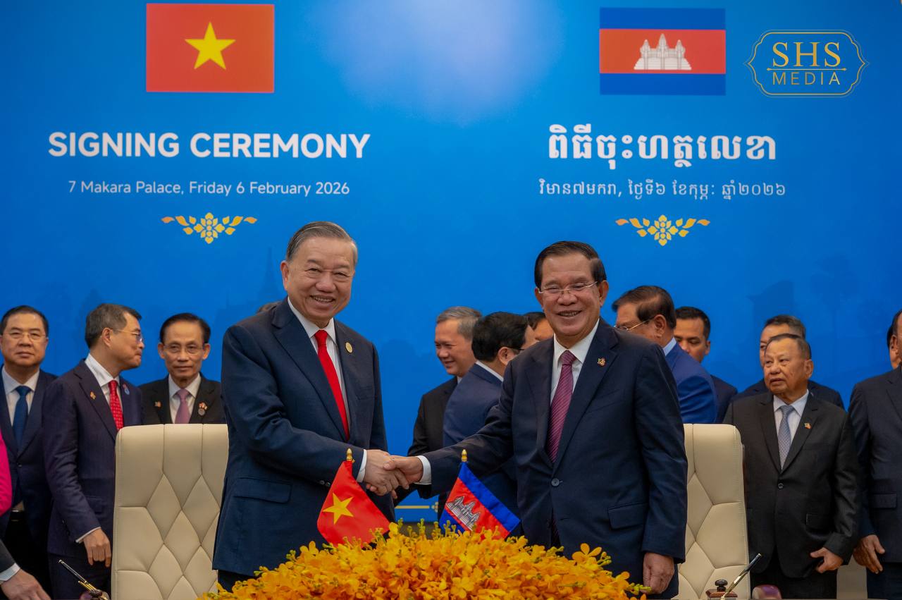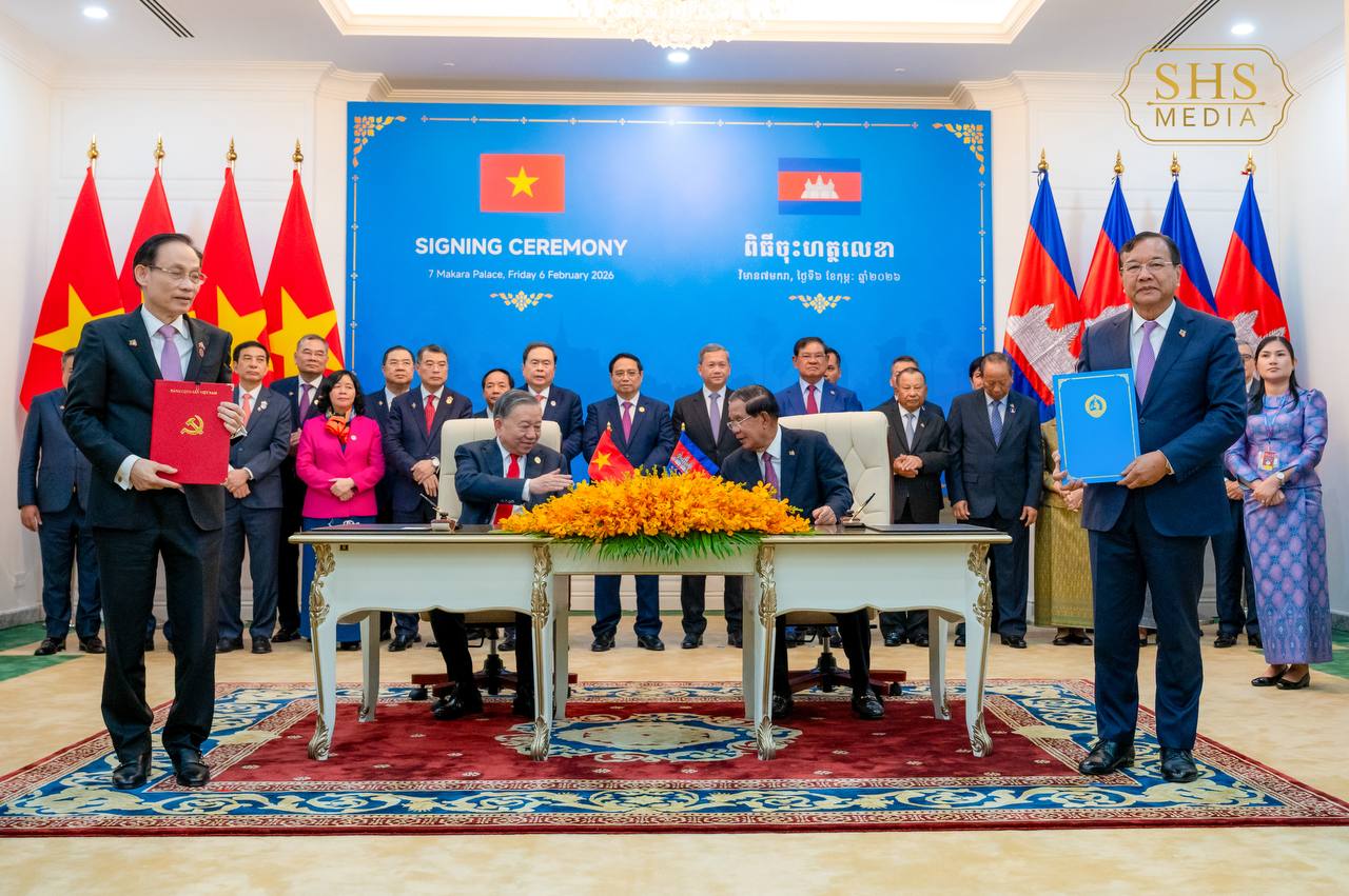 សម្ដេចអគ្គមហាសេនាបតីតេជោ ហ៊ុន សែន ប្រធានគណបក្សប្រជាជនកម្ពុជា និង ឯកឧត្តម តូ ឡឹម អគ្គលេខាធិការបក្សកុម្មុយនីស្តវៀតណាម អញ្ជើញជាអធិបតីក្នុងពិធីចុះហត្ថលេខាលើអនុស្សរណៈនៃការយោគយល់រវាងគណៈទាក់ទងការបរទេស គណបក្សប្រជាជនកម្ពុជា និងគណៈកម្មាធិការបក្សក្រសួងការបរទេសវៀតណាម