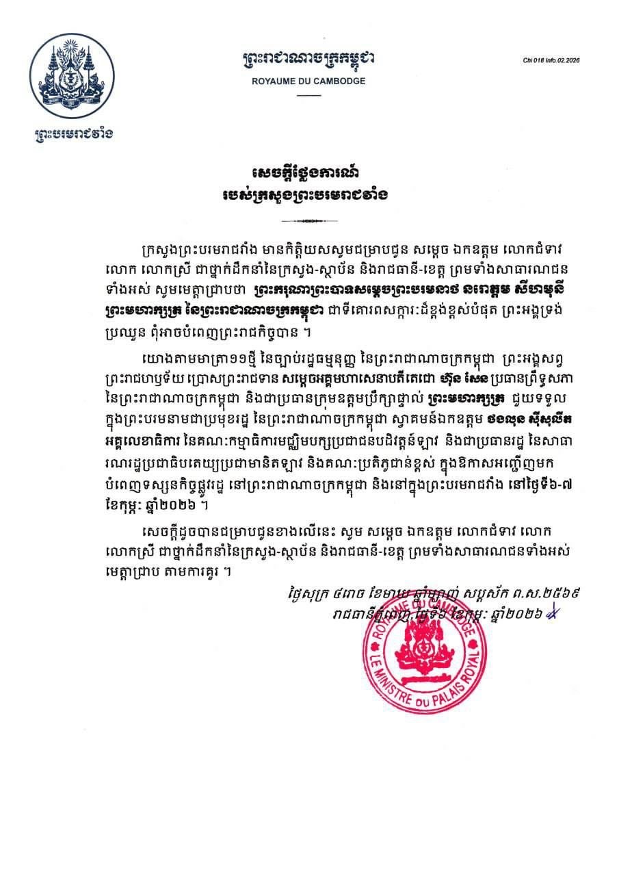 BREAKING: ព្រះមហាក្សត្រកម្ពុជា ព្រះអង្គទ្រង់ប្រឈួន ពុំអាចបំពេញព្រះរាជកិច្ចបាន ប្រគល់ភារកិច្ចជូនសម្តេចតេជោ ហ៊ុន សែន ជាប្រមុខរដ្ឋឱ្យទទួលស្វាគមន៍លោក ថងលុន ស៊ីសុលីត ប្រធានរដ្ឋឡាវ នៅក្នុងព្រះបរមរាជវាំង នៅថ្ងៃទី៦-៧ ខែកុម្ភៈ ឆ្នាំ២០២៦។
