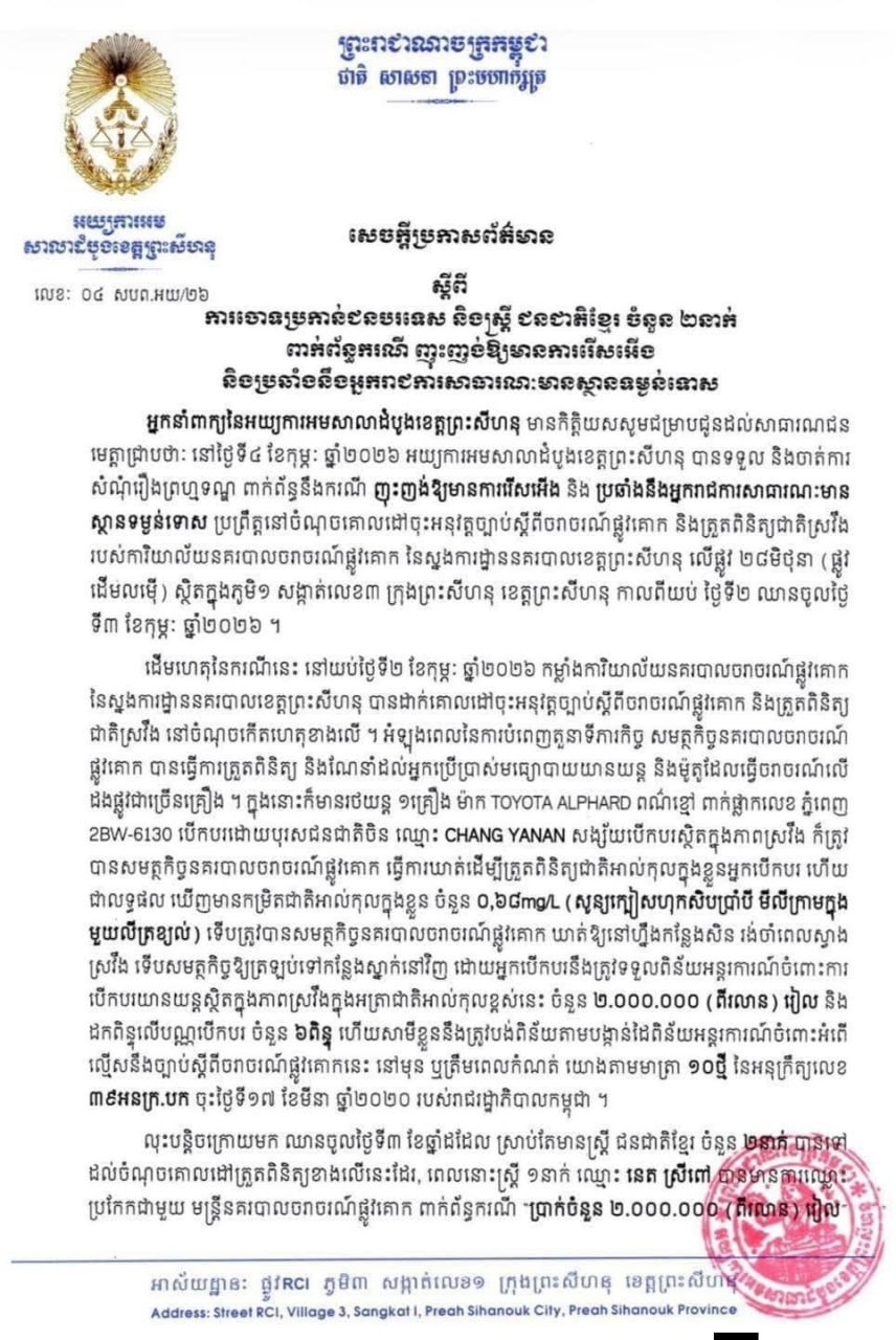 (ព្រះសីហនុ) អ្នកនាំពាក្យនៃអយ្យការអមសាលាដំបូងខេត្តព្រះសីហនុ មានកិត្តិយសសូមជម្រាបជូនដល់សាធារណជន មេត្តាជ្រាបថាៈ នៅថ្ងៃទី៤ ខែកុម្ភៈ ឆ្នាំ២០២៦ អយ្យការអមសាលាដំបូងខេត្តព្រះសីហនុ បានទទួល និងចាត់ការសំណុំរឿងព្រហ្មទណ្ឌពាក់ព័ន្ធនឹងករណី ញុះញង់ឱ្យមានការរើសអើង និង ប្រឆាំងនឹងអ្នករាជការសាធារណៈមានស្ថានទម្ងន់ទោស ប្រព្រឹត្តនៅចំណុចគោលដៅចុះអនុវត្តច្បាប់ស្តីពីចរាចរណ៍ផ្លូវគោក និងត្រួតពិនិត្យជាតិស្រវឹងរបស់ការិយាល័យនគរបាលចរាចរណ៍ផ្លូវគោក នៃស្នងការដ្ឋាននគរបាលខេត្តព្រះសីហនុ លើផ្លូវ ២៨មិថុនា (ផ្លូវដើមលម៉ី) ស្ថិតក្នុងភូមិ១ សង្កាត់លេខ៣ ក្រុងព្រះសីហនុ ខេត្តព្រះសីហនុ កាលពីយប់ ថ្ងៃទី២ ឈានចូលថ្ងៃទី៣ ខែកុម្ភៈ ឆ្នាំ២០២៦ ។