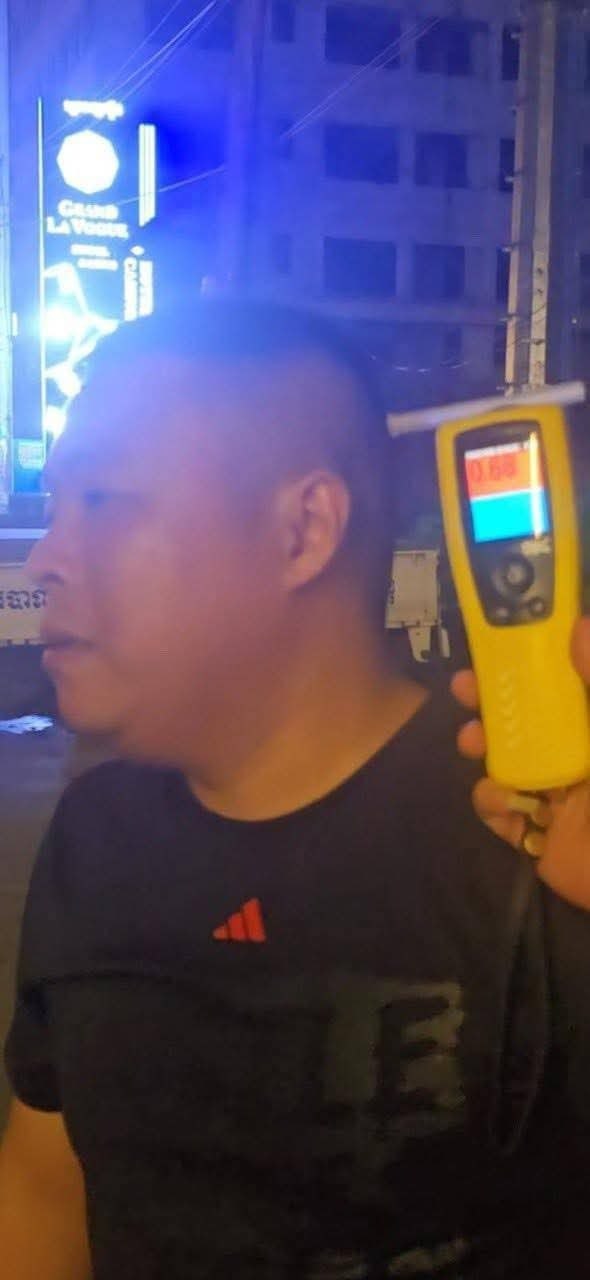 ក្នុងនោះក៏មានរថយន្ត ១គ្រឿង ម៉ាក TOYOTA ALPHARD ពណ៌ខ្មៅ ពាក់ផ្លាកលេខ ភ្នំពេញ2BW-6130 បើកបរដោយបុរសជនជាតិចិន ឈ្មោះ CHANG YANAN សង្ស័យបើកបរស្ថិតក្នុងភាពស្រវឹង ក៏ត្រូវបានសមត្ថកិច្ចនគរបាលចរាចរណ៍ផ្លូវគោក ធ្វើការឃាត់ដើម្បីត្រួតពិនិត្យជាតិអាល់កុលក្នុងខ្លួនអ្នកបើកបរ ហើយជាលទ្ធផល ឃើញមានកម្រិតជាតិអាល់កុលក្នុងខ្លួន ចំនួន ០,៦៨mg/L (សូន្យក្បៀសហុកសិបប្រាំបី មីលីក្រាមក្នុងមួយលីត្រខ្យល់) ទើបត្រូវបានសមត្ថកិច្ចនគរបាលចរាចរណ៍ផ្លូវគោក ឃាត់ឱ្យនៅហ្នឹងកន្លែងសិន រង់ចាំពេលស្វាងស្រវឹង ទើបសមត្ថកិច្ចឱ្យត្រឡប់ទៅកន្លែងស្នាក់នៅវិញ ដោយអ្នកបើកបរនឹងត្រូវទទួលពិន័យអន្តរការណ៍ចំពោះការ
