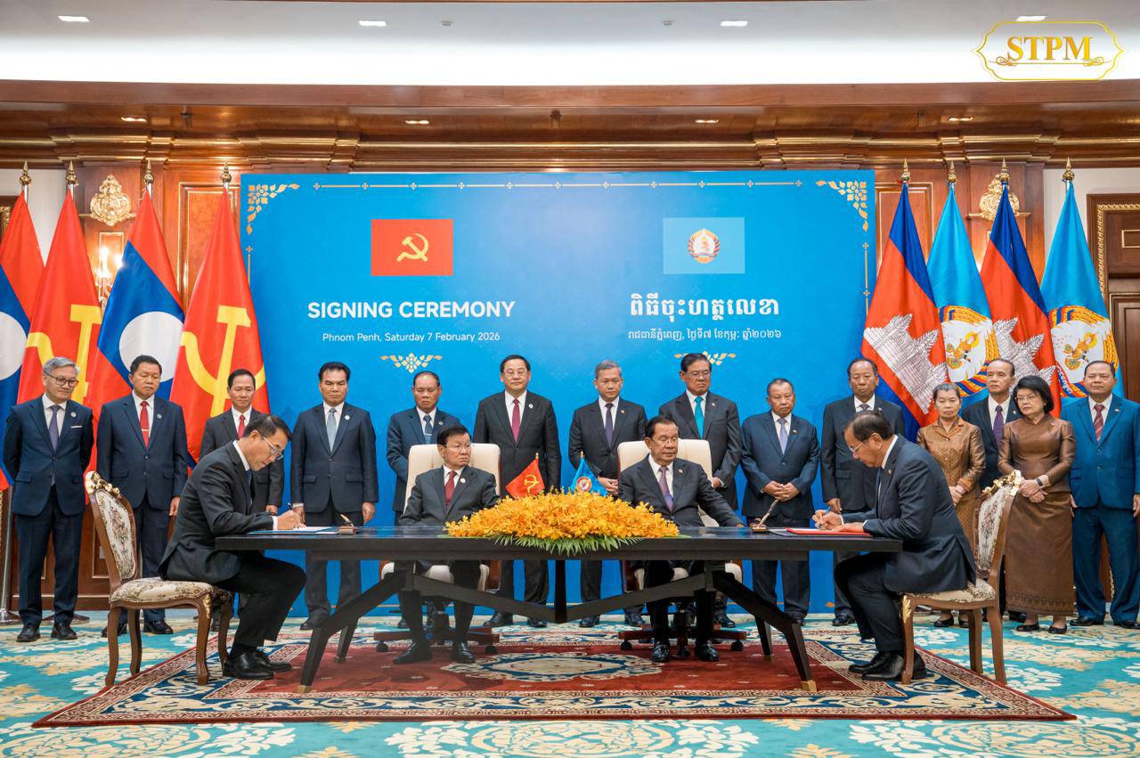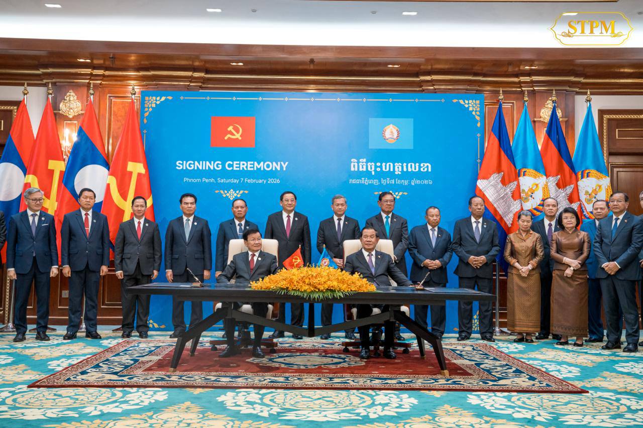 សម្តេចមហាបវរធិបតី ហ៊ុន ម៉ាណែត នាយករដ្ឋមន្ត្រីនៃព្រះរាជាណាចក្រកម្ពុជា ចូលរួមពិធីចុះហត្ថលេខាលើកំណត់ហេតុកិច្ចប្រជុំកំពូលលើកទី១៦ និងកិច្ចព្រមព្រៀង ស្តីពីផែនការសហប្រតិបត្តិការ រវាងគណបក្សប្រជាជនកម្ពុជា និងគណបក្សប្រជាជនបតិវត្តន៍ឡាវ នៅវិមានសាមគ្គីភាព ។ On Feb 7, 2026 រាជធានីភ្នំពេញ ព្រឹកថ្ងៃសៅរ៍ ទី៧ កុម្ភៈ ២០២៦