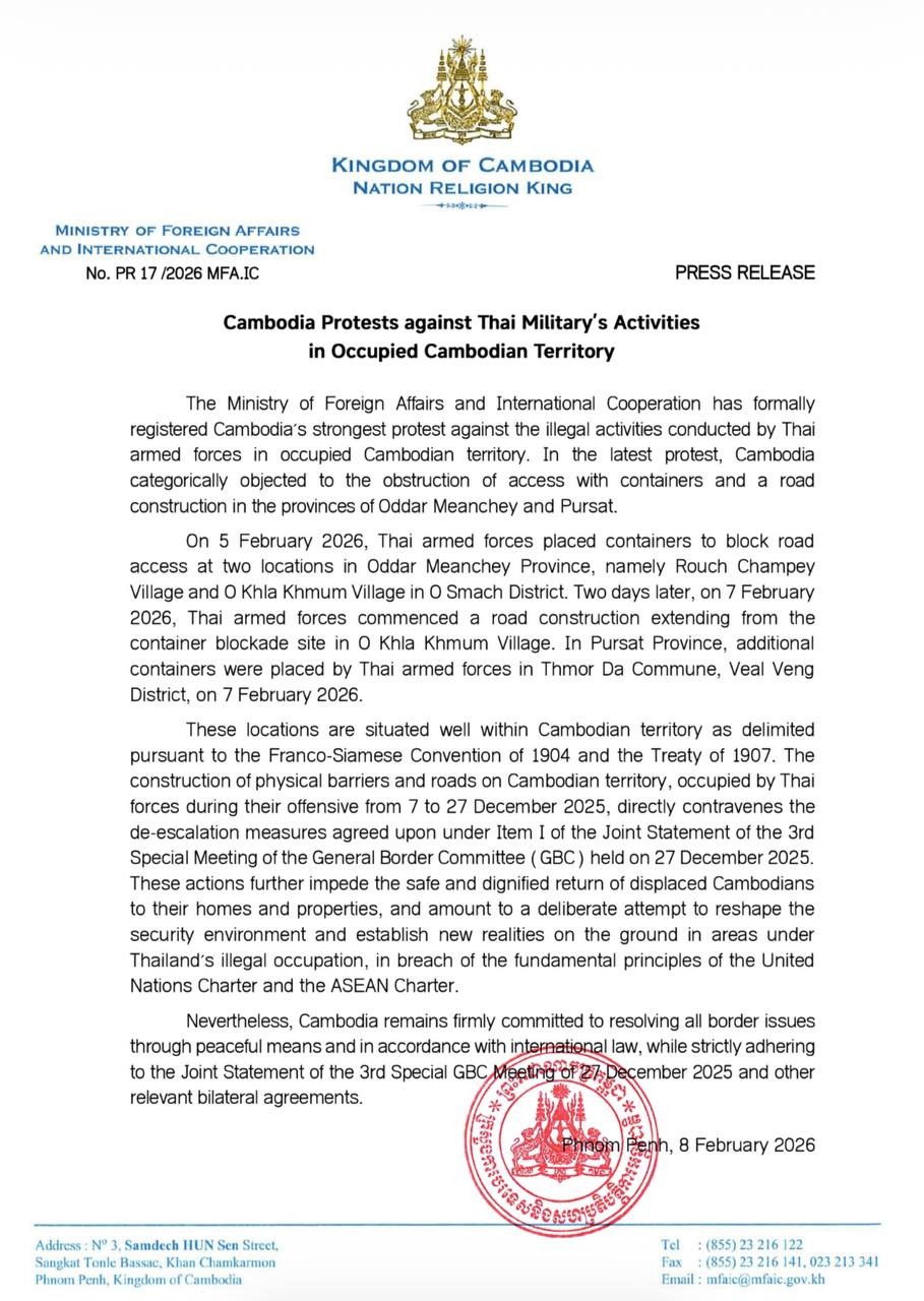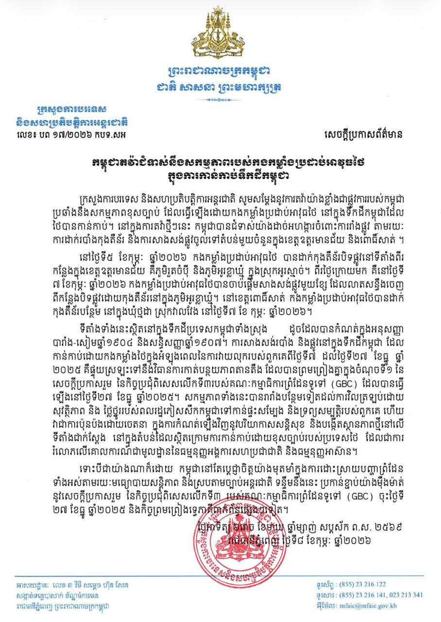 ដូចដែលបានកំណត់ក្នុងអនុសញ្ញា ទីតាំងទាំងនេះស្ថិតនៅក្នុងទឹកដីប្រទេសកម្ពុជាទាំងស្រុង បារាំង-សៀមឆ្នាំ១៩០៤ និងសន្ធិសញ្ញាឆ្នាំ១៩០៧។ ការសាងសង់របាំង និងផ្លូវនៅក្នុងទឹកដីកម្ពុជា ដែល កាន់កាប់ដោយកងកម្លាំងថៃក្នុងអំឡុងពេលនៃការវាយលុករបស់ពួកគេពីថ្ងៃទី៧ ដល់ថ្ងៃទី២៧ ខែធ្នូ ឆ្នាំ ២០២៥ គឺផ្ទុយស្រឡះទៅនឹងវិធានការកាត់បន្ថយភាពតានតឹង ដែលបានព្រមព្រៀងគ្នាក្នុងចំណុចទី១ នៃ សេចក្តីប្រកាសរួម នៃកិច្ចប្រជុំពិសេសលើកទី៣របស់គណៈកម្មាធិការព្រំដែនទូទៅ (GBC) ដែលបានធ្វើ ឡើងនៅថ្ងៃទី២៧ ខែធ្នូ ឆ្នាំ២០២៥។ សកម្មភាពទាំងនេះបានរារាំងបន្ថែមទៀតដល់ការវិលត្រឡប់ដោយ សុវត្ថិភាព និង ថ្លៃថ្នូររបស់ពលរដ្ឋភៀសសឹកកម្ពុជាទៅកាន់ផ្ទះសម្បែង និងទ្រព្យសម្បត្តិរបស់ពួកគេ ហើយ វាជាការប៉ុនប៉ងដោយចេតនា ក្នុងការកំណត់ឡើងវិញនូវបរិយាកាសសន្តិសុខ និងបង្កើតស្ថានភាពថ្មីនៅលើ ទីតាំងជាក់ស្តែង នៅក្នុងតំបន់ដែលស្ថិតក្រោមការកាន់កាប់ដោយខុសច្បាប់របស់ប្រទេសថៃ ដែលជាការ រំលោភលើគោលការណ៏ជាមូលដ្ឋាននៃធម្មនុញ្ញអង្គការសហប្រជាជាតិ និងធម្មនុញ្ញអាស៊ាន។