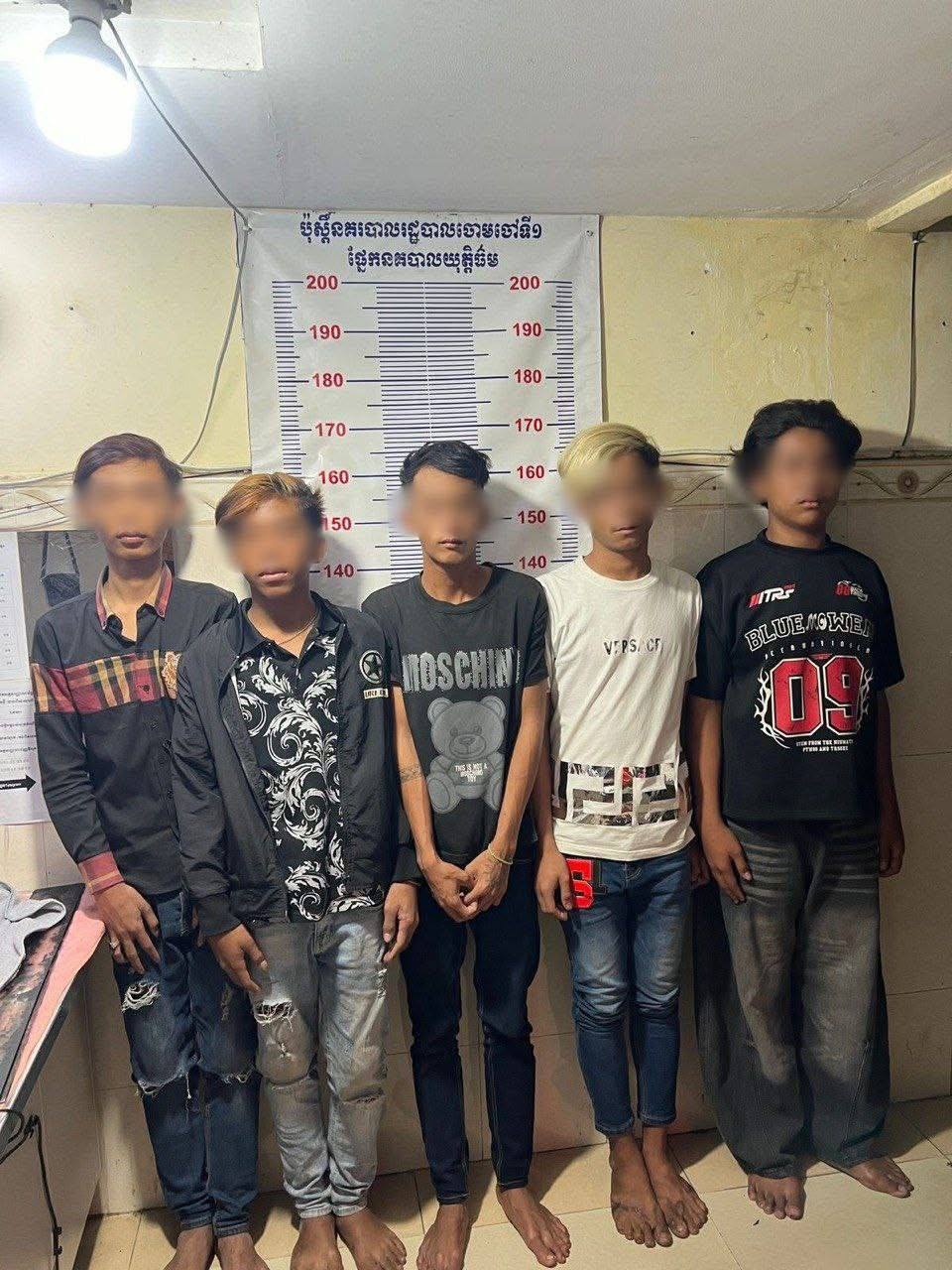 ១. ឈ្មោះរិន សារឹទ្ធិ ភេទប្រុស អាយុ១៩ឆ្នាំ មុខរបរកម្មកររោងចក្រ ស្នាក់នៅបន្ទប់ជួលភូមិត្រពាំងថ្លឹង៣ សង្កាត់ចោមចៅទី១ ខណ្ឌពោធិ៍សែនជ័យ។ ២. ឈ្មោះ យឿន រ៉ាយុទ្ធ ភេទប្រុស អាយុ១៨ឆ្នាំ មុខរបរកម្មកររោងចក្រ ស្នាក់នៅបន្ទប់ជួលភូមិត្រពាំងថ្លឹង៣ សង្កាត់ចោមចៅទី១ ខណ្ឌពោធិ៍សែនជ័យ។ ៣. ឈ្មោះ វ៉ាន ណារី ភេទប្រុស អាយុ១៦ឆ្នាំ មុខរបរមិនពិតប្រាកដ ស្នាក់នៅបន្ទប់ជួល សង្កាត់ចោមចៅទី២ ខណ្ឌពោធិ៍សែនជ័យ។ ៤. ឈ្មោះ ស៊ូ ហ្វារី ភេទប្រុស អាយុ១៥ឆ្នាំ មុខរបរមិនពិតប្រាកដ ស្នាក់នៅបន្ទប់ជួល សង្កាត់ស្ទឹងមានជ័យទី៣ ខណ្ឌមានជ័យ។ ៥. ឈ្មោះ ណាន ចំរើន ភេទប្រុស អាយុ១៨ឆ្នាំ មុខរបរមិនពិតប្រាកដ ស្នាក់នៅបន្ទប់ជួល សង្កាត់ស្ទឹងមានជ័យទី៣ ខណ្ឌមានជ័យ។