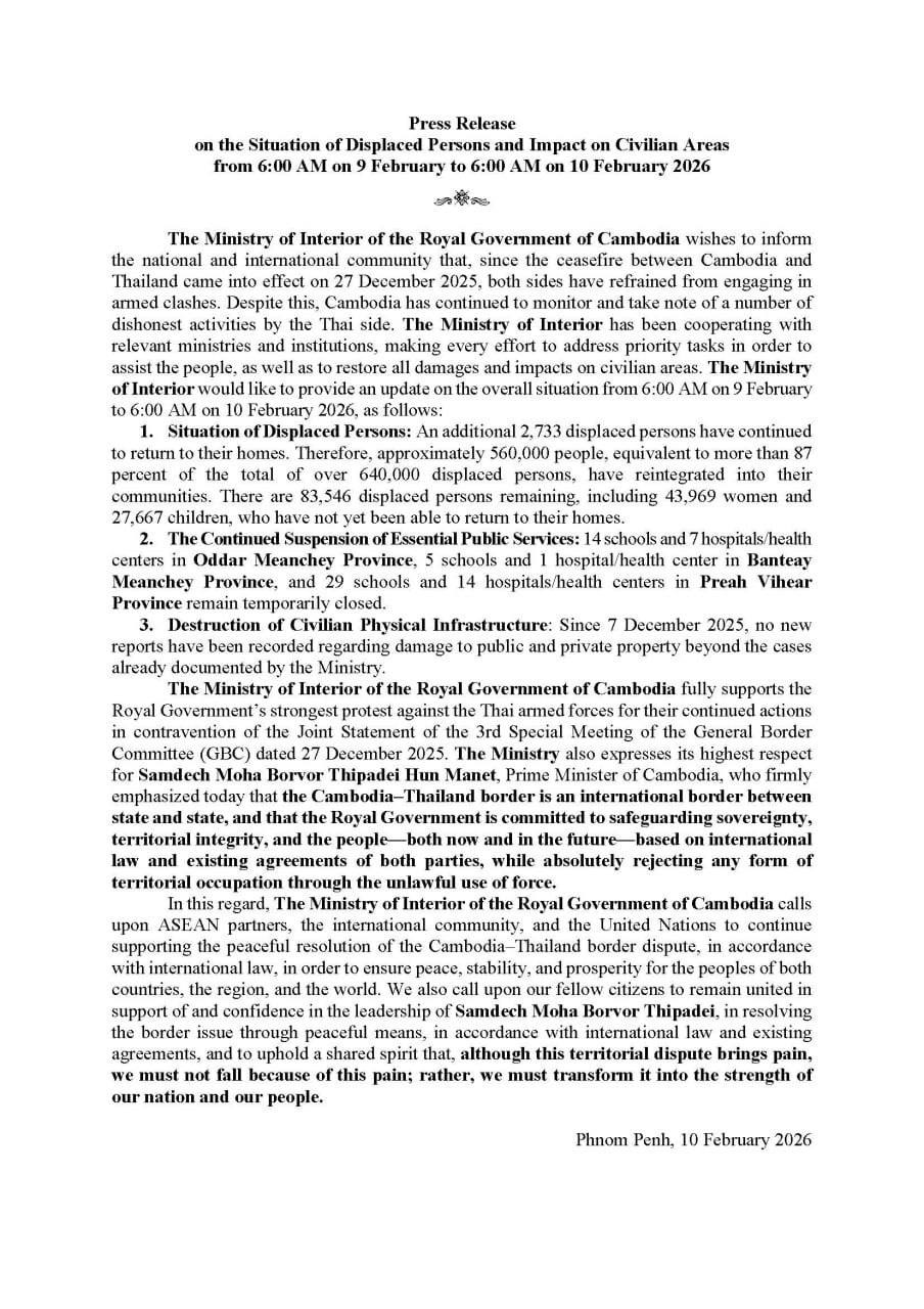 ក្រសួងមហាផ្ទៃ ៖ គិតត្រឹមព្រឹកថ្ងៃទី១០ ខែកុម្ភៈ ឆ្នាំ២០២៦ មានពលរដ្ឋភៀសសឹក ២.៧៣៣នាក់បន្ថែមទៀត បានបន្តវិលត្រឡប់ទៅលំនៅឋានវិញ