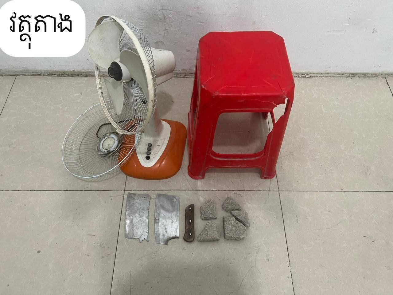 វត្ថុតាងចាប់យក៖ -កាំបិតបុ័ងតោបាក់ដងចំនួន២ដើម, កង្ហា០១គ្រឿង, និងដុំថ្មចំនួន០៤ដុំតូចៗ។