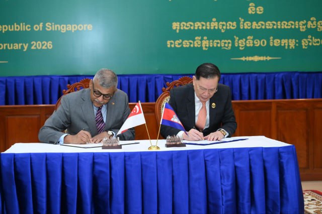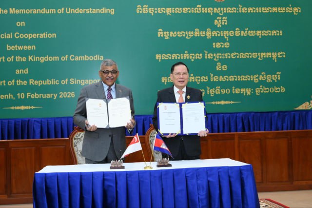 (ភ្នំពេញ)៖ លោក ជីវ កេង ប្រធានតុលាការកំពូលកម្ពុជា និងលោក ស៊ុនដារ៉េស មេណុន (SUNDARESH MENON) ប្រធានតុលាការកំពូលសិង្ហបុរី បានចុះអនុស្សរណៈ នៃការយោគយល់គ្នា (MOU) ស្តីពីកិច្ចសហប្រតិបត្តិការ ក្នុងវិស័យតុលាការ នាព្រឹកថ្ងៃអង្គារ ទី១០ ខែកុម្ភៈ ឆ្នាំ២០២៦។