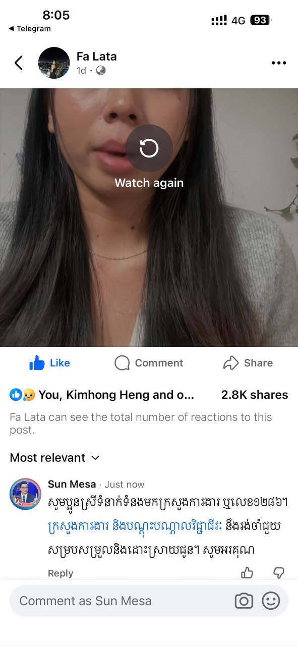 អ្នកនាំពាក្យនៃក្រសួងការងារ លើកទឹកចិត្តដល់ប្អូនស្រី ដែលមានបញ្ហានៅកន្លែងការងារ និងកំពុងមានការចាប់អារម្មណ៍លើបណ្តាញសង្គមឱ្យទាក់ទង ១២៨៦ ដើម្បីក្រសួងជួយរកដំណោះស្រាយ
