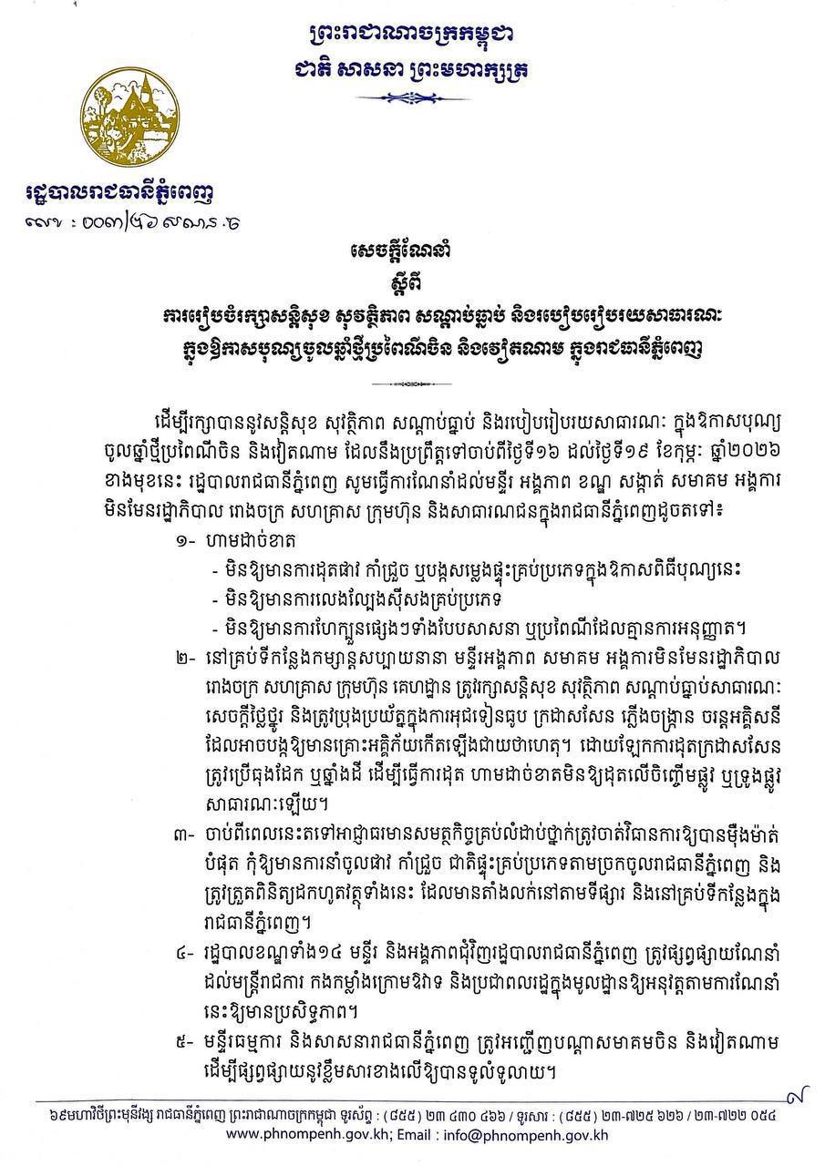 ភ្នំពេញ៖ រដ្ឋបាលរាជធានីភ្នំពេញបានចេញសេចក្ដីណែនាំ ដោយហាមដាច់ខាតមិនឱ្យមានការដុតផាវ កាំជ្រួច ឬបង្កសំឡេងផ្ទុះគ្រប់ប្រភេទក្នុងឱកាសពិធីបុណ្យចូលឆ្នាំចិន និងមិនឱ្យមានការលេងល្បែងស៊ីសងគ្រប់ប្រភេទ។ ដើម្បីរក្សាបាននូវសន្តិសុខ សុវត្ថិភាព សណ្តាប់ធ្នាប់ និងរបៀបរៀបរយសាធារណៈក្នុងឱកាសបុណ្យចូលឆ្នាំថ្មីប្រពៃណីចិននិងវៀតណាម ដែលនឹងប្រព្រឹត្តទៅចាប់ពីថ្ងៃទី១៦ ដល់ថ្ងៃទី១៩ ខែកុម្ភៈ ឆ្នាំ២០២៦ ខាងមុខនេះ រដ្ឋបាលរាជធានីភ្នំពេញសូមធ្វើការណែនាំដល់មន្ទីរ អង្គភាព ខណ្ឌ សង្កាត់ សមាគម អង្គការមិនមែនរដ្ឋាភិបាល រោងចក្រ សហគ្រាស ក្រុមហ៊ុន និងសាធារណជនក្នុងរាជធានីភ្នំពេញដូចតទៅ៖ ទី១-ហាមដាច់ខាតមិនឱ្យមានការដុតផាវ កាំជ្រួច ឬបង្កសំឡេងផ្ទុះគ្រប់ប្រភេទក្នុងឱកាសពិធីបុណ្យនេះ មិនឱ្យមានការលេងល្បែងស៊ីសងគ្រប់ប្រភេទ មិនឱ្យមានការហែក្បួនផ្សេងៗទាំងបែបសាសនា ឬប្រពៃណីដែលគ្មានការអនុញ្ញាត។ ២- នៅគ្រប់ទីកន្លែងកម្សាន្តសប្បាយនានា មន្ទីរអង្គភាព សមាគម អង្គការមិនមែនរដ្ឋាភិបាល រោងចក្រ សហគ្រាស ក្រុមហ៊ុន គេហដ្ឋាន ត្រូវរក្សាសន្តិសុខ សុវត្ថិភាព សណ្តាប់ធ្នាប់សាធារណៈ សេចក្តីថ្លៃថ្នូរ និងត្រូវប្រុងប្រយ័ត្នក្នុងការអុជទៀនធូប ក្រដាសសែន ភ្លើងចង្ក្រាន ចរន្តអគ្គិសនី ដែលអាចបង្កឱ្យមានគ្រោះអគ្គិភ័យកើតឡើងជាយថាហេតុ។ ដោយឡែកការដុតក្រដាសសែន ត្រូវប្រើធុងដែកឬឆ្នាំងដីដើម្បីធ្វើការដុត ហាមដាច់ខាតមិនឱ្យដុតលើចិញ្ចើមផ្លូវ ឬទ្រូងផ្លូវ សាធារណៈឡើយ។ ៣- ចាប់ពីពេលនេះតទៅអាជ្ញាធរមានសមត្ថកិច្ចគ្រប់លំដាប់ថ្នាក់ត្រូវចាត់វិធានការឱ្យបានម៉ឺងម៉ាត់បំផុត កុំឱ្យមានការនាំចូលផាវ កាំជ្រួច ជាតិផ្ទុះគ្រប់ប្រភេទតាមច្រកចូលរាជធានីភ្នំពេញ និងត្រូវត្រួតពិនិត្យដកហូតវត្ថុទាំងនេះដែលមានតាំងលក់នៅតាមទីផ្សារ និងនៅគ្រប់ទីកន្លែងក្នុងរាជធានីភ្នំពេញ។ ៤-រដ្ឋបាលខណ្ឌទាំង១៤ មន្ទីរ និងអង្គភាពជុំវិញរដ្ឋបាលរាជធានីភ្នំពេញ ត្រូវផ្សព្វផ្សាយណែនាំដល់មន្ត្រីរាជការ កងកម្លាំងក្រោមឱវាទនិងប្រជាពលរដ្ឋក្នុងមូលដ្ឋានឱ្យអនុវត្តតាមការណែនាំ នេះឱ្យមានប្រសិទ្ធភាព។ ៥- មន្ទីរធម្មការនិងសាសនារាជធានីភ្នំពេញត្រូវអញ្ជើញបណ្តាសមាគមចិន និងវៀតណាម ដើម្បីផ្សព្វផ្សាយនូវខ្លឹមសារខាងលើឱ្យបានទូលំទូលាយ ៕
