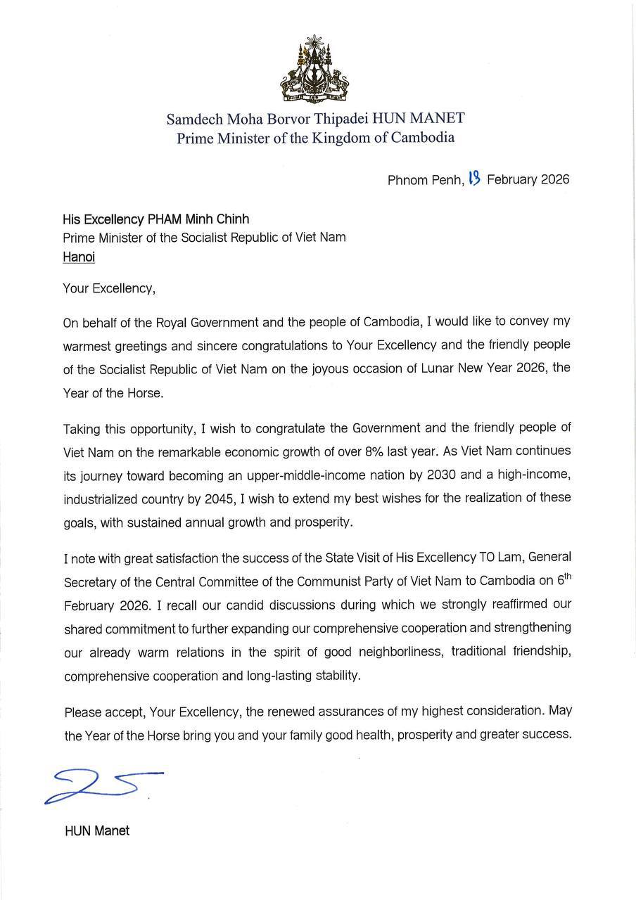 សម្ដេចធិបតី ហ៊ុន ម៉ាណែត ផ្ញើសារលិខិតជូន ឯកឧត្ដម ផាម មិញជីញ នាយករដ្ឋមន្ត្រី នៃសាធារណរដ្ឋសង្គមនិយមវៀតណាម ក្នុងឱកាសបុណ្យចូលឆ្នាំថ្មីប្រពៃណីវៀតណាម ឆ្នាំ២០២៦។