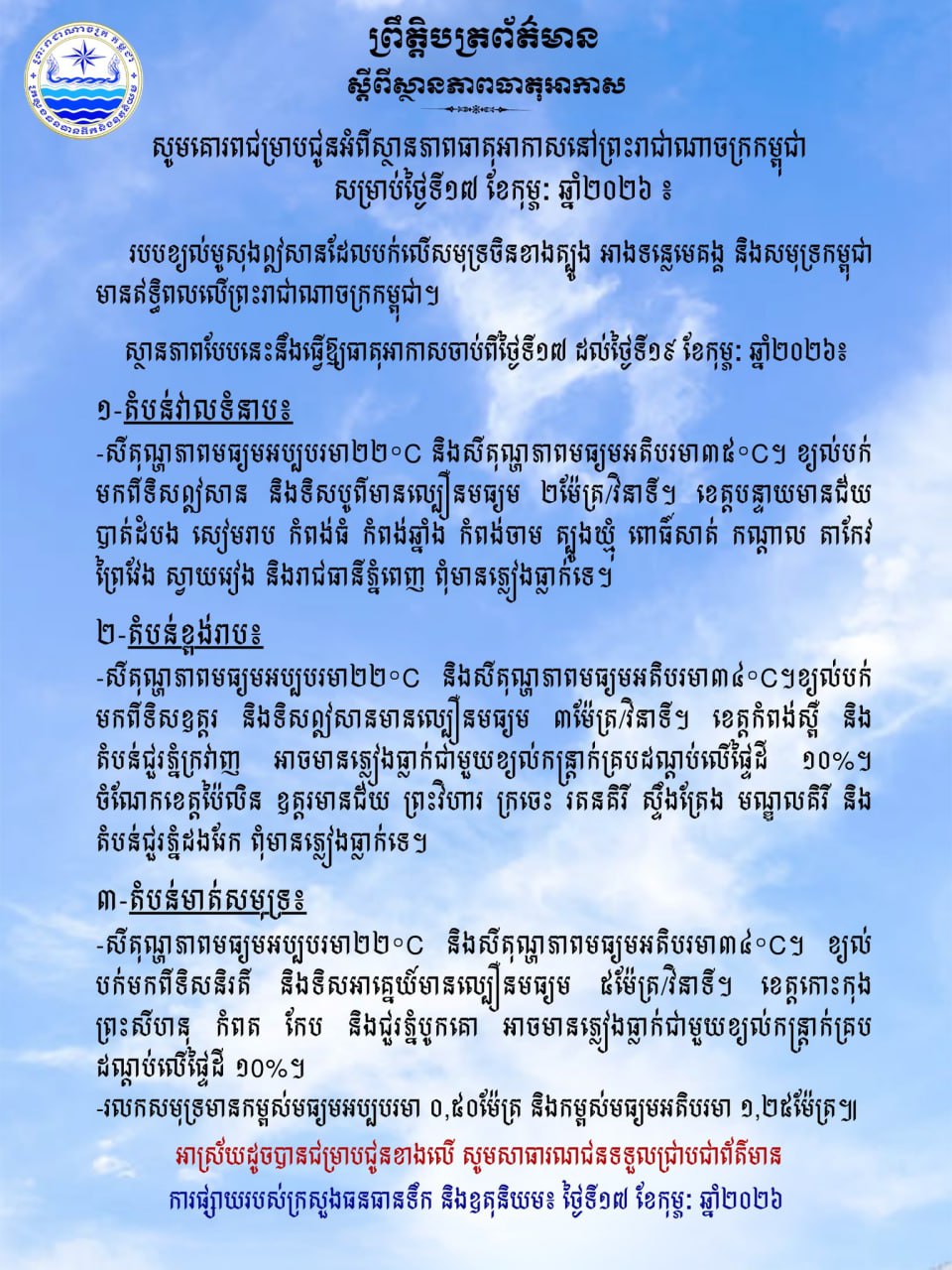 ក្រសួងធនធានទឹក ជូនដំណឹងអំពីស្ថានភាពធាតុអាកាសនៅកម្ពុជា សម្រាប់ថ្ងៃទី១៧ ខែកុម្ភៈ ឆ្នាំ២០២៦