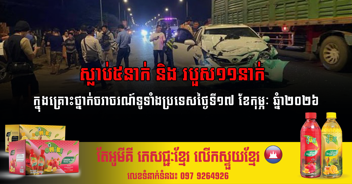 ស្លាប់៥នាក់ និងរបួស១១នាក់ ក្នុងគ្រោះថ្នាក់ចរាចរណ៍ទូទាំងប្រទេសថ្ងៃទី១៧ ខែកុម្ភៈ ឆ្នំា២០២៦