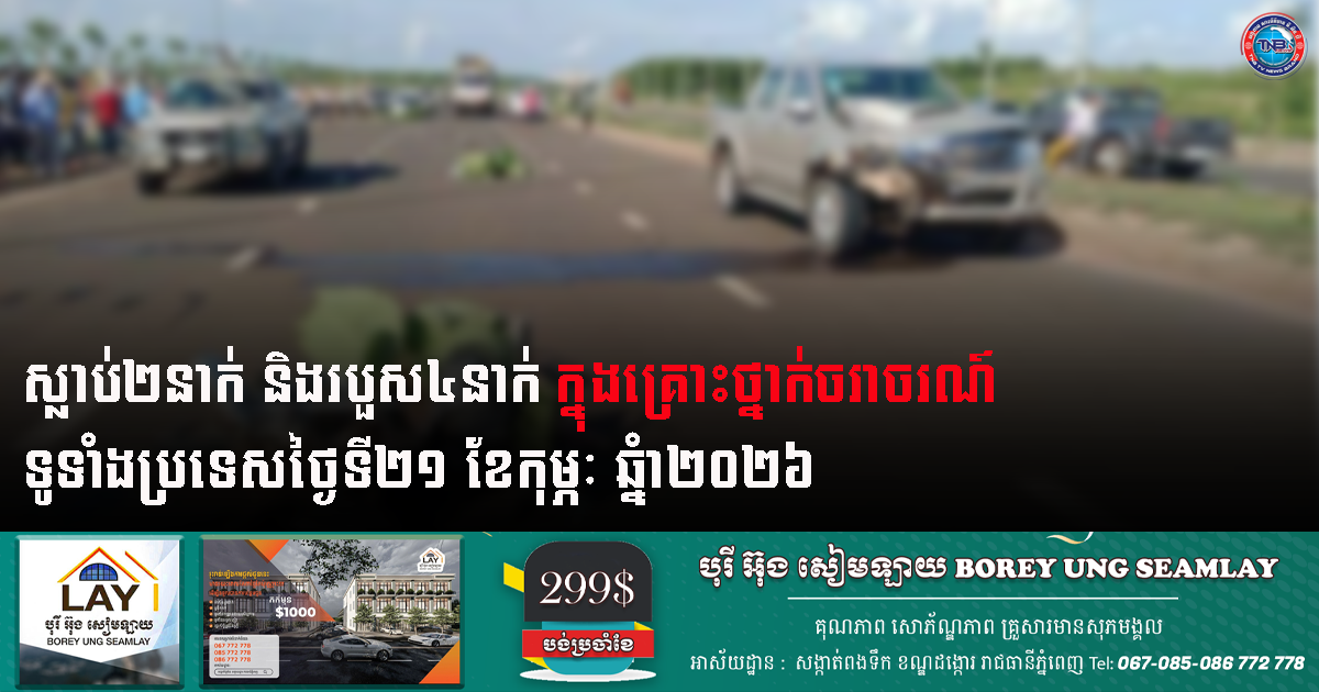 ស្លាប់២នាក់ និងរបួស៤នាក់ ក្នុងគ្រោះថ្នាក់ចរាចរណ៍ទូទាំងប្រទេសថ្ងៃទី២១ ខែកុម្ភៈ ឆ្នំា២០២៦