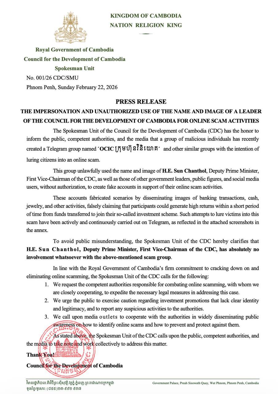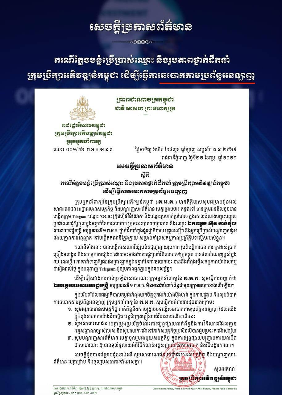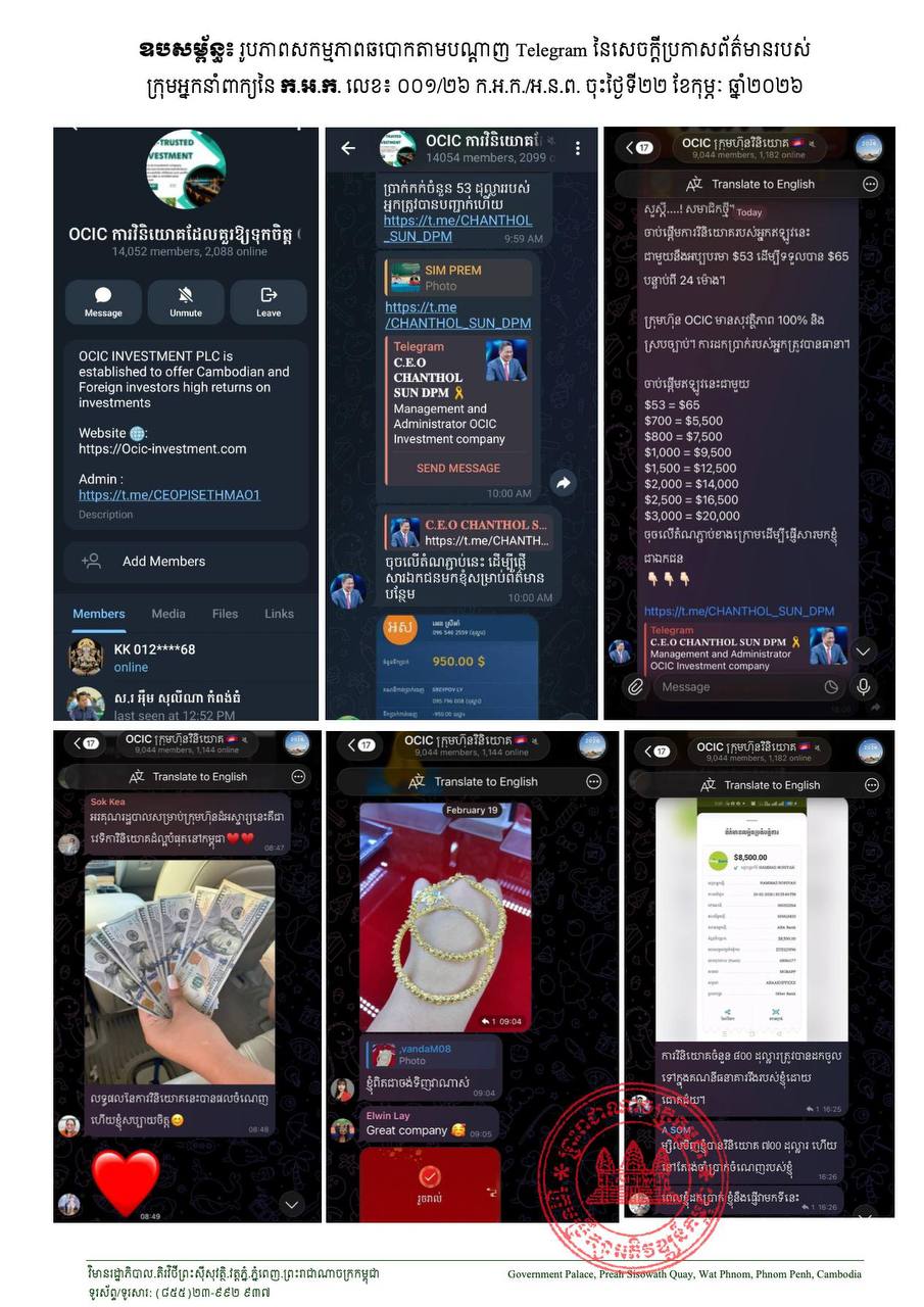 ក្រុមប្រឹក្សាអភិវឌ្ឍន៍កម្ពុជា ចេញសេចក្តីប្រកាសព័ត៌មាន ស្តីពី បណ្តាញសង្គម Telegram ឈ្មោះ “OCIC ក្រុមហ៊ុនវិនិយោគ” ប្រេីប្រាស់ឈ្មោះ និងរូបភាពថ្នាក់ដឹកនាំ ក្រុមប្រឹក្សាអភិវឌ្ឍន៍កម្ពុជា ដេីម្បីប្រព្រឹត្តិបទល្មេីស និងសូមសមត្ថកិច្ច ចាត់វិធានការ តាមផ្លូវច្បាប់