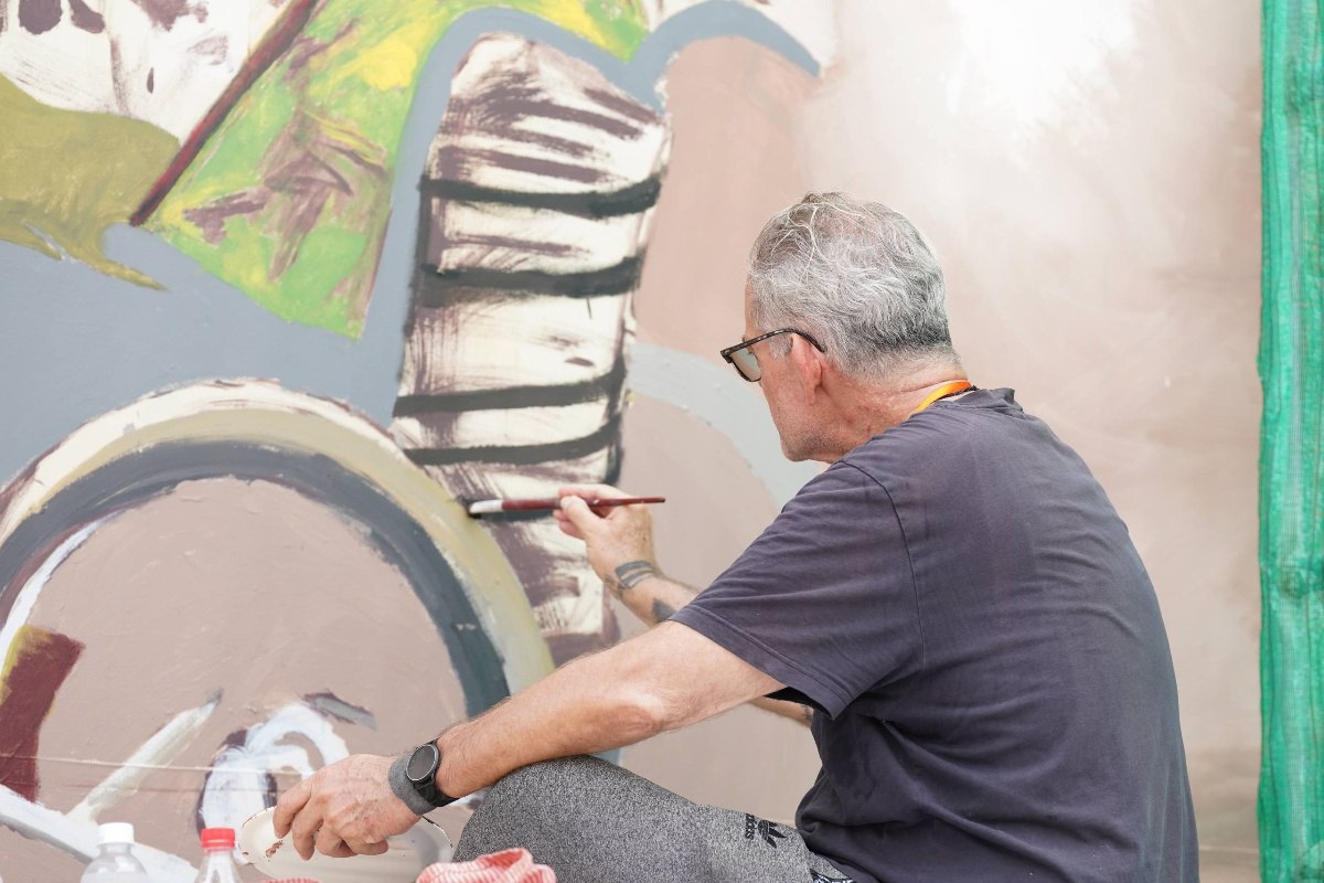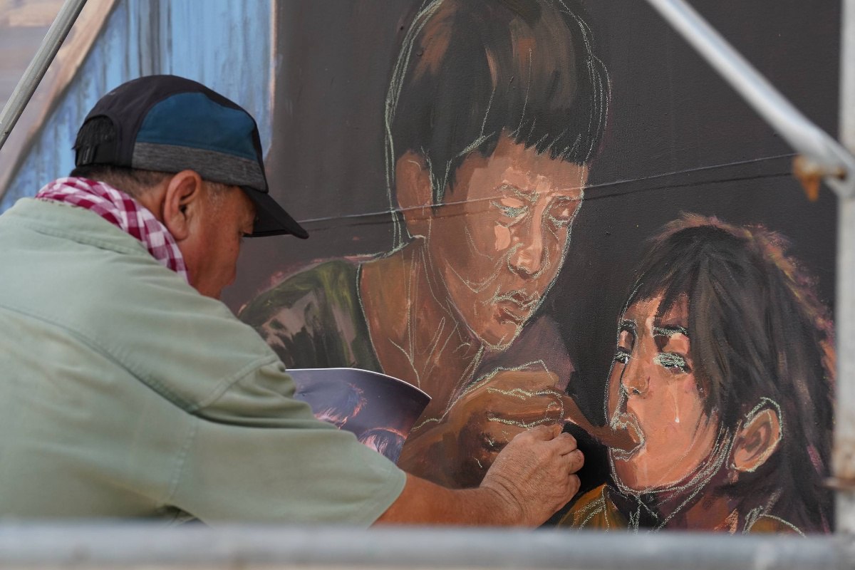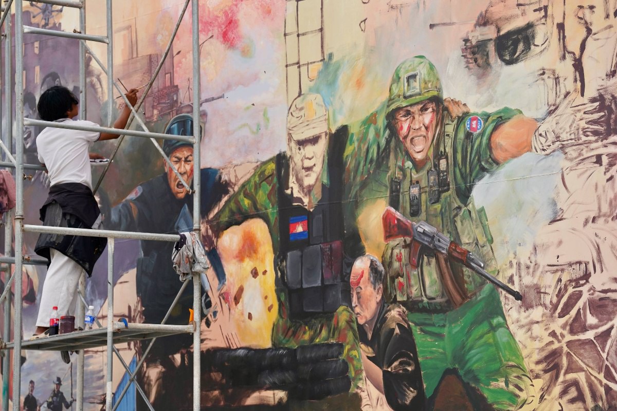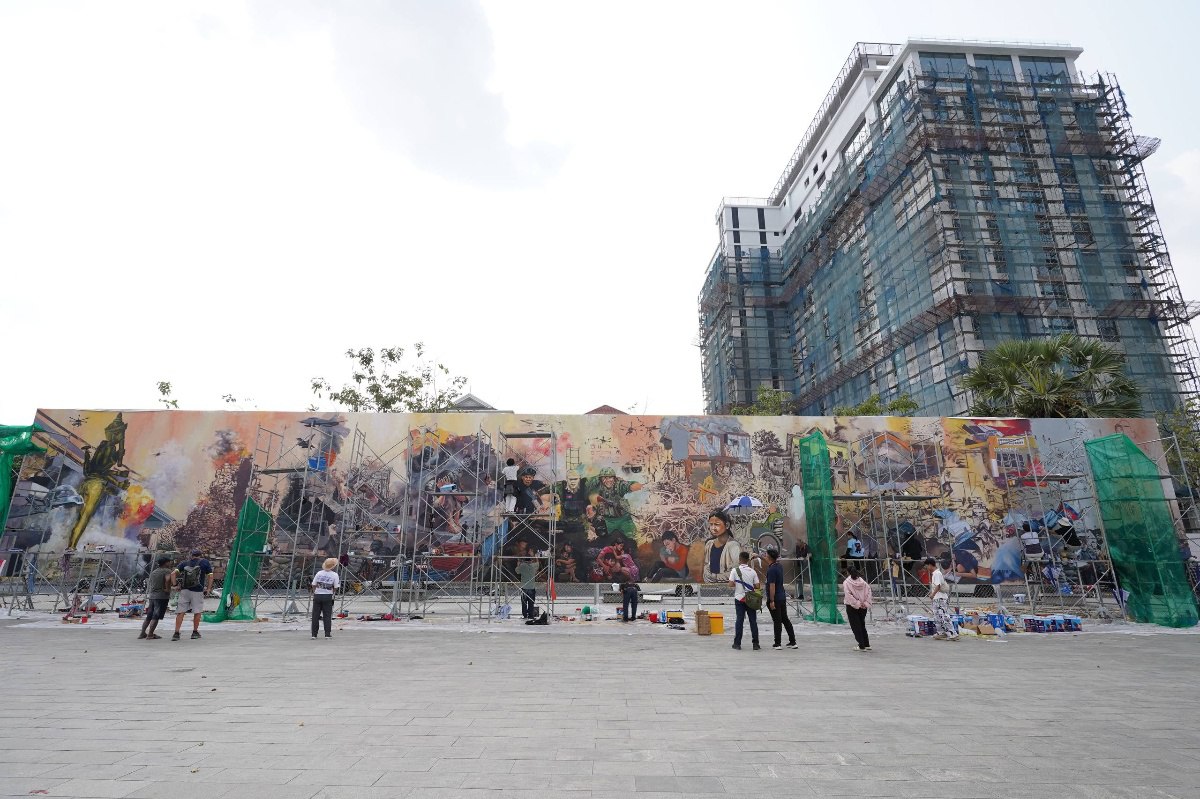 គំនូរសិល្បៈដើម្បីសន្តិភាព លេចចេញជារូបរាងបណ្តើរៗហើយ នៅមុខវត្តបទុមវតី ដែលមានទំហំធំជាងគំនូរនៅខេត្តសៀមរាប