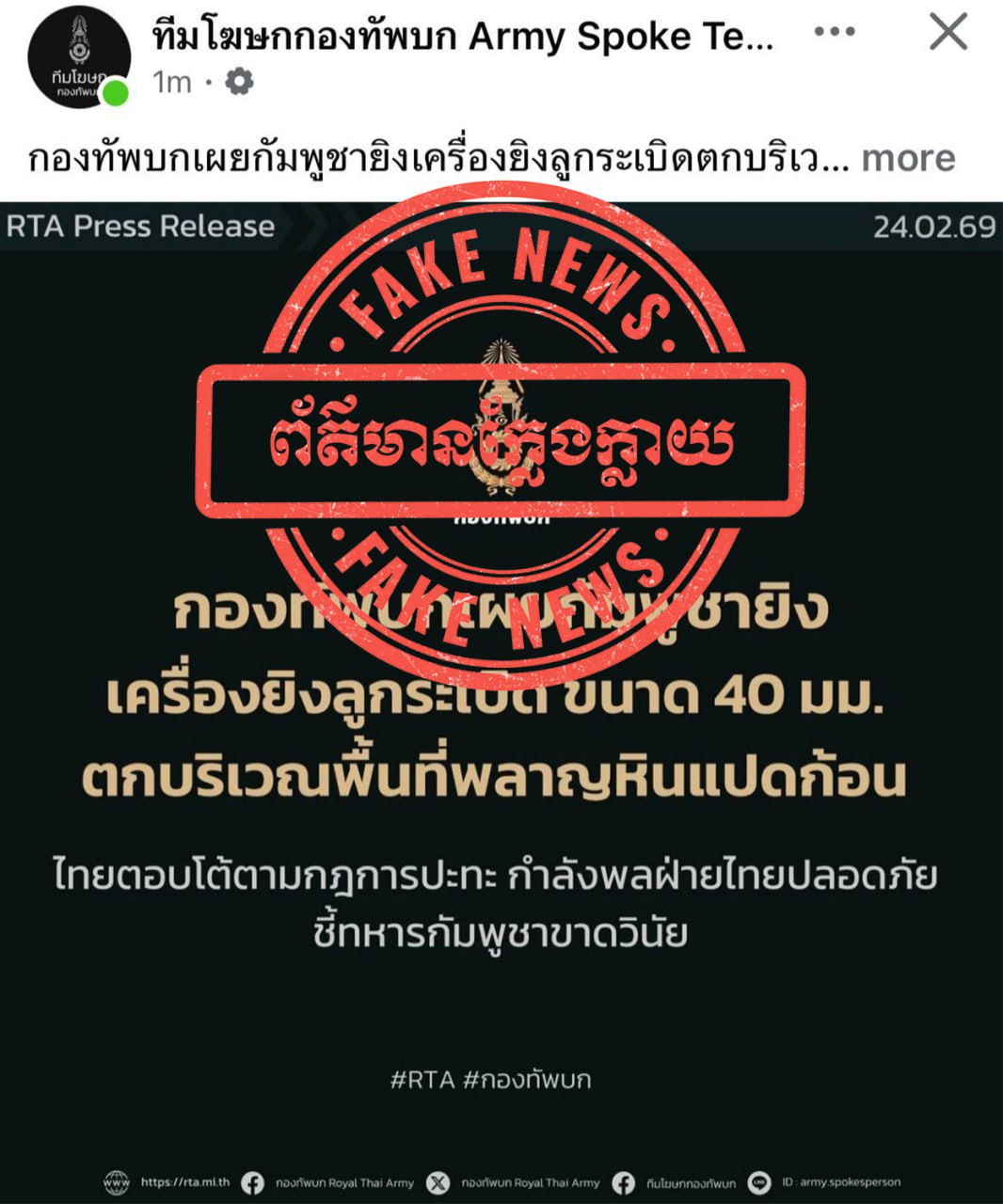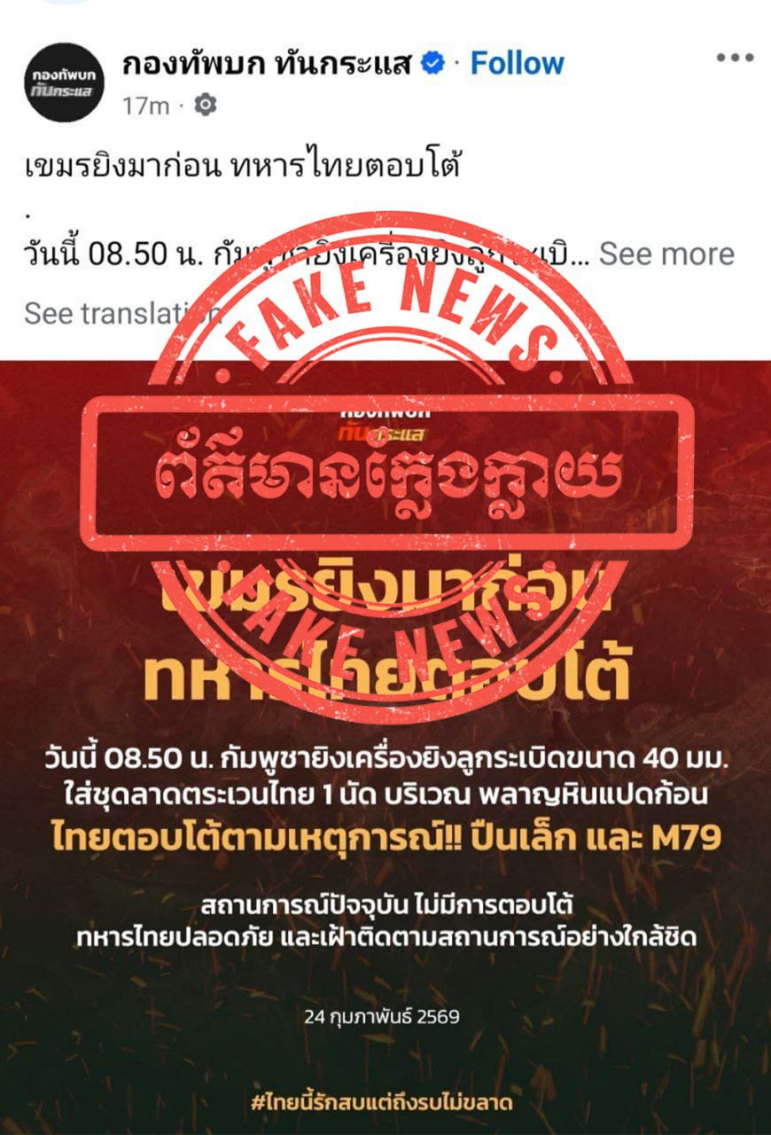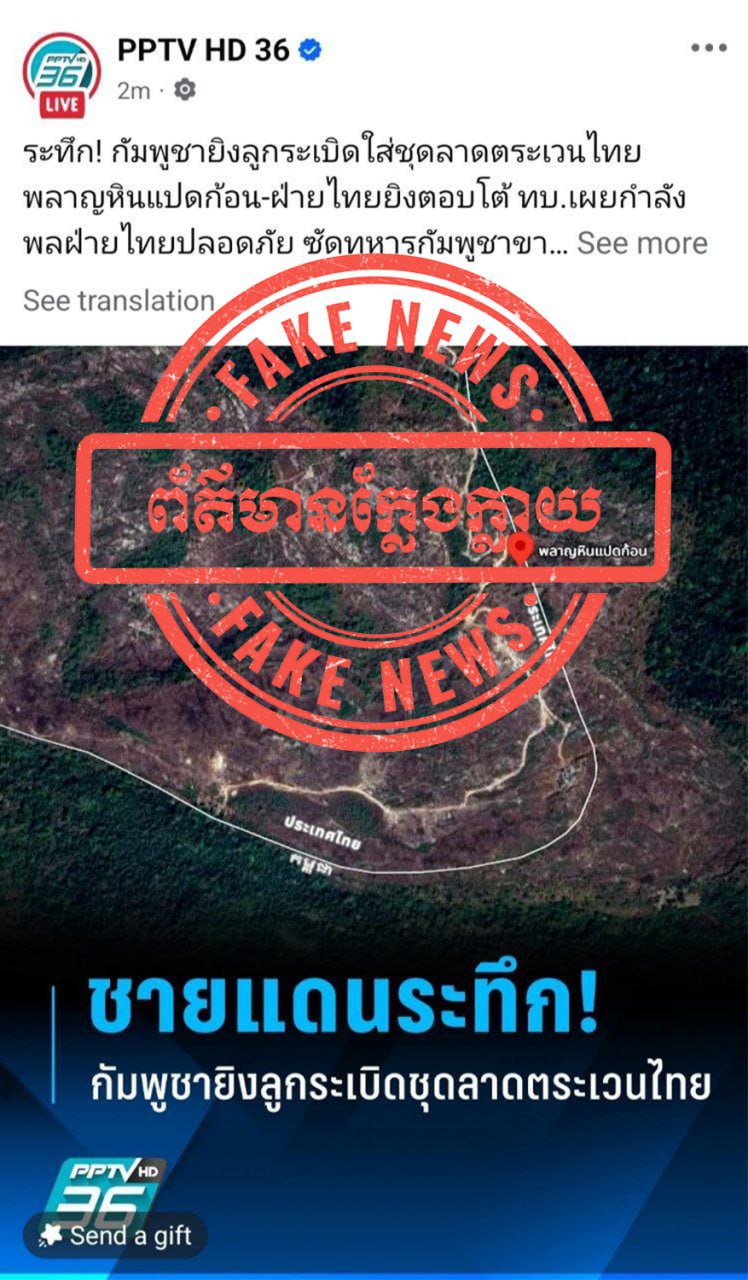 ជាមួយគ្នានេះ ក្រសួងការពារជាតិ បានអំពាវនាវដល់សាធារណជន និងអ្នកសារព័ត៌មានទាំងអស់ សូមកុំចែករំលែកនូវព័ត៌មានក្លែងក្លាយដែលបានផ្សព្វផ្សាយដោយសារព័ត៌មានថៃខាងលើ ដោយតាមដាន និងទទួលយកតែព័ត៌មានដែលមានប្រភពច្បាស់លាស់ ត្រឹមត្រូវ និងជឿទុកចិត្តបាន ជាពិសេសការផ្តល់ជូនព័ត៌មានដោយរាជរដ្ឋាភិបាល ទំព័រផ្លូវការរបស់ថ្នាក់ដឹកនាំ ក្រសួង និងអង្គភាពពាក់ព័ន្ធរបស់យើង។