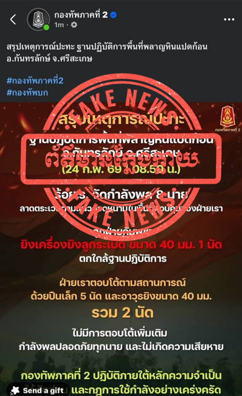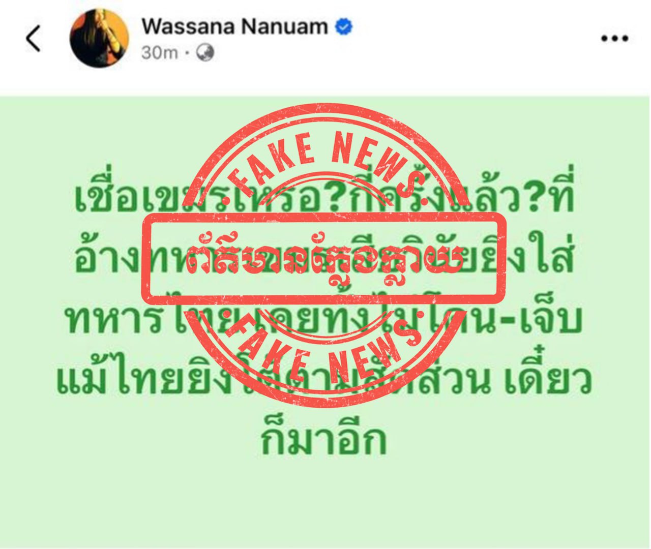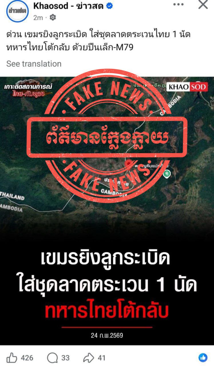 ជាមួយគ្នានេះ ក្រសួងការពារជាតិ បានអំពាវនាវដល់សាធារណជន និងអ្នកសារព័ត៌មានទាំងអស់ សូមកុំចែករំលែកនូវព័ត៌មានក្លែងក្លាយដែលបានផ្សព្វផ្សាយដោយសារព័ត៌មានថៃខាងលើ ដោយតាមដាន និងទទួលយកតែព័ត៌មានដែលមានប្រភពច្បាស់លាស់ ត្រឹមត្រូវ និងជឿទុកចិត្តបាន ជាពិសេសការផ្តល់ជូនព័ត៌មានដោយរាជរដ្ឋាភិបាល ទំព័រផ្លូវការរបស់ថ្នាក់ដឹកនាំ ក្រសួង និងអង្គភាពពាក់ព័ន្ធរបស់យើង។
