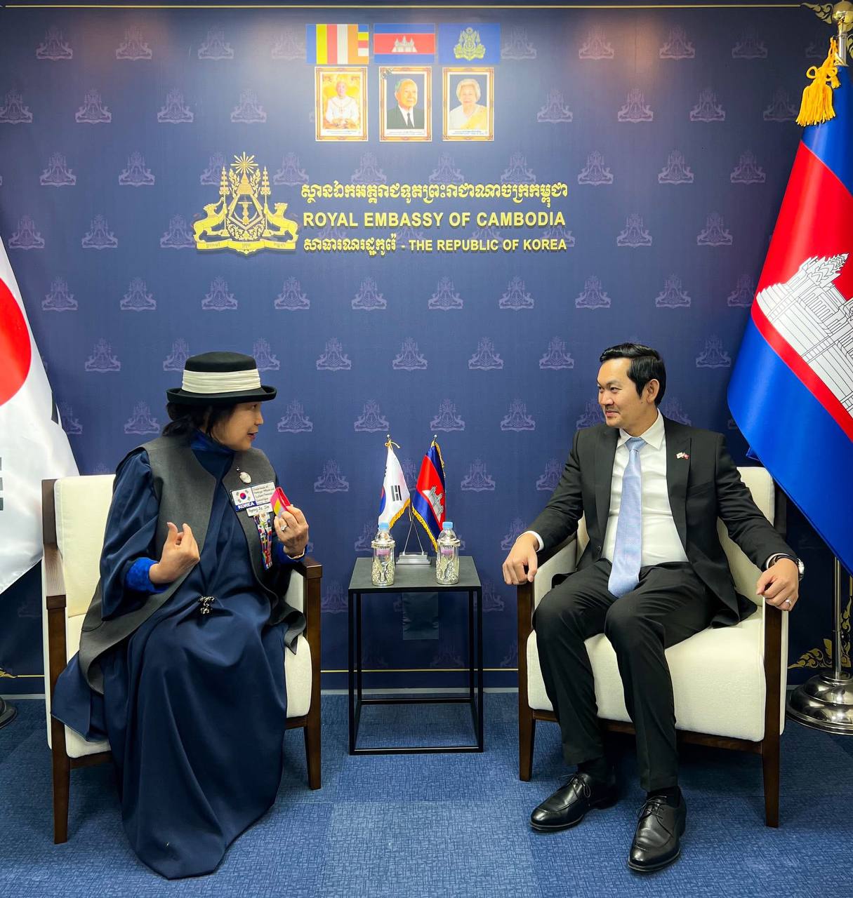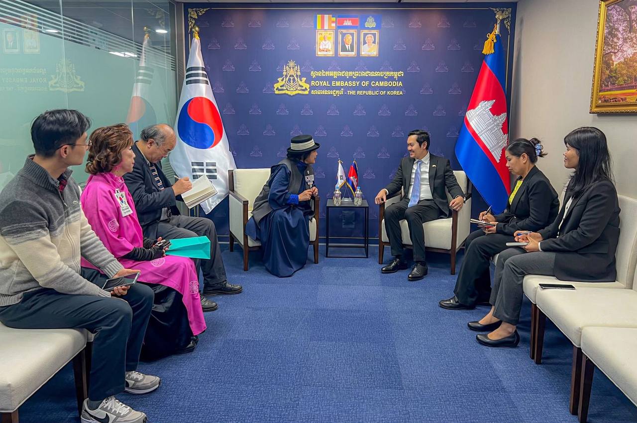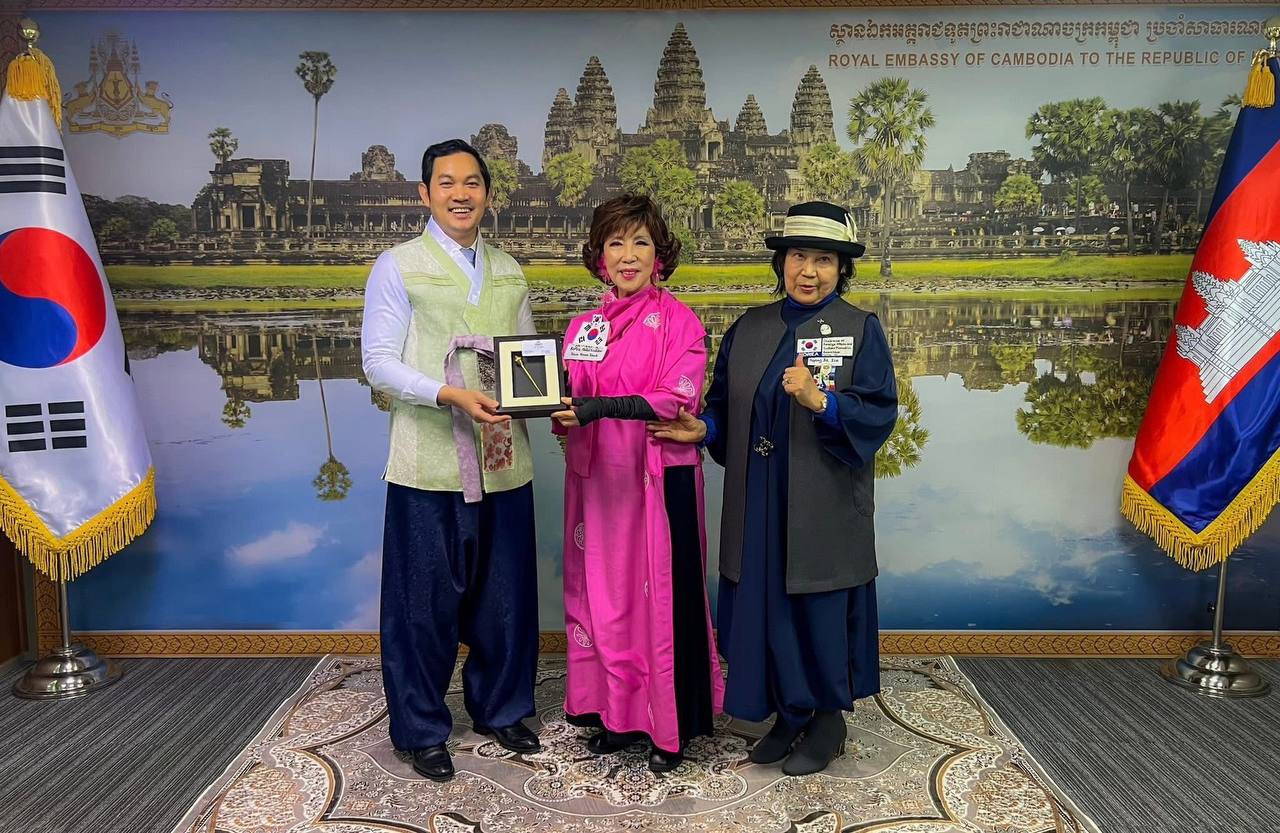 (ភ្នំពេញ)៖ លោក ឃួន ផុនរតនៈ ឯកអគ្គរាជទូតកម្ពុជាប្រចាំសាធារណរដ្ឋកូរ៉េ បានទទួលជួបសម្តែងការគួរសម និងសំណេះសំណាលការងារជាមួយលោកស្រី Jin Hyang-Ja ប្រធានក្រុមប្រឹក្សាភិបាលនៃសមាគមហាន់ប៊ុកកូរ៉េ (Korea Hanbok Association) នៅថ្ងៃទី ២៣ ខែកុម្ភៈ ឆ្នាំ២០២៦ នាស្ថានទូតកម្ពុជា ក្នុងទីក្រុងសេអ៊ូល។
