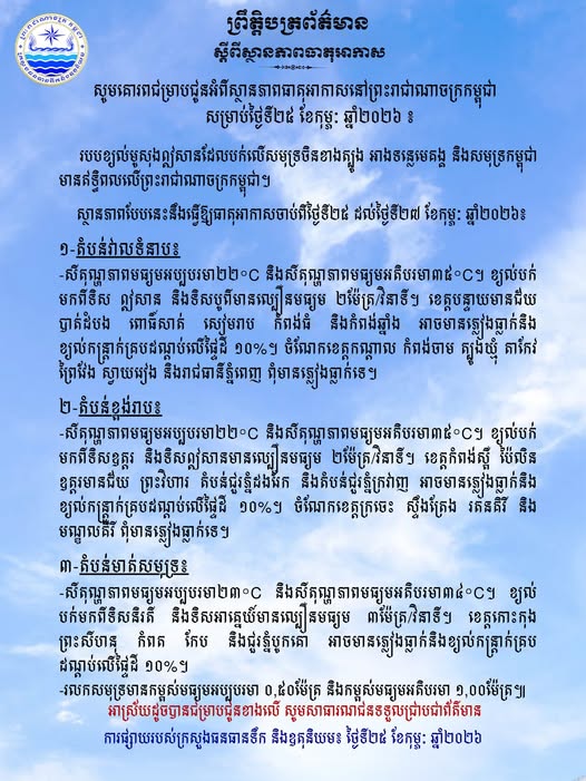 ក្រសួងធនធានទឹក ជូនដំណឹងអំពីស្ថានភាពធាតុអាកាសនៅកម្ពុជា សម្រាប់ថ្ងៃទី២៥ ខែកុម្ភៈ ឆ្នាំ២០២៦