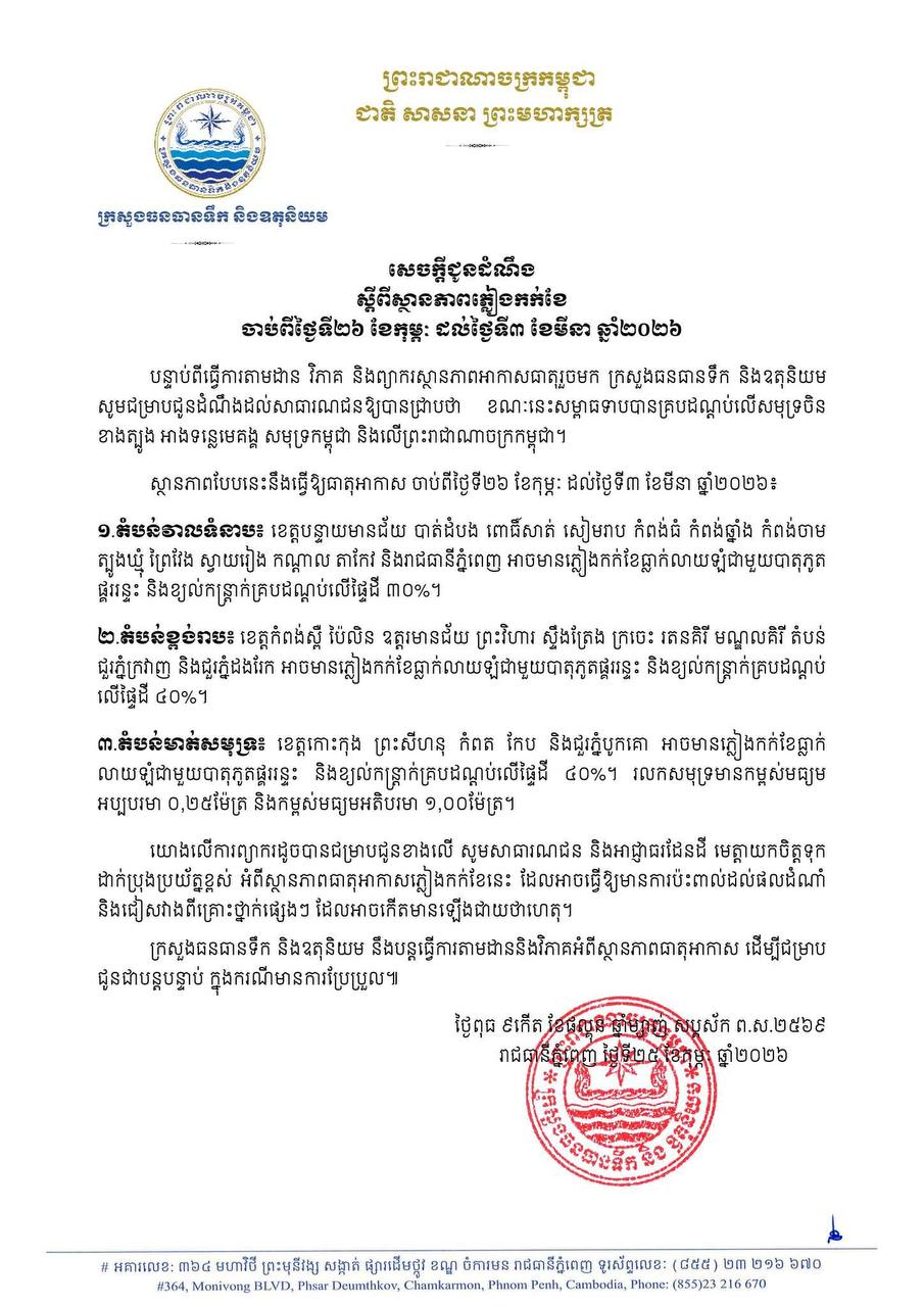 ក្រសួងធនធានទឹក និងឧតុនិយម ជូនដំណឹងដល់សាធារណជនស្តីពីស្ថានភាពភ្លៀងកក់ខែ ចាប់ពីថ្ងៃទី២៦ ខែកុម្ភៈ ដល់ថ្ងៃទី៣ ខែមីនា ឆ្នាំ២០២៦។