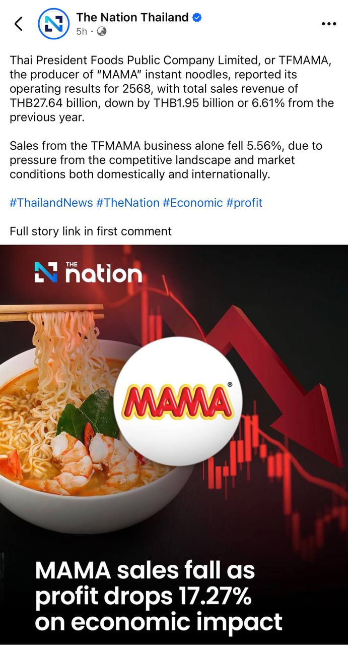 ក្រុមហ៊ុន Thai President Foods Public Company Limited ឬ TFMAMA ដែលជាក្រុមហ៊ុនផលិតមីកញ្ចប់ “MAMA” បានរាយការណ៍ពីលទ្ធផលប្រតិបត្តិការរបស់ខ្លួនសម្រាប់ឆ្នាំ 2568 ជាមួយនឹងប្រាក់ចំណូលសរុបពីការលក់ចំនួន 27.64 ពាន់លានបាត ធ្លាក់ចុះ 1.95 ពាន់លានបាត ឬ 6.61% ពីឆ្នាំមុន។