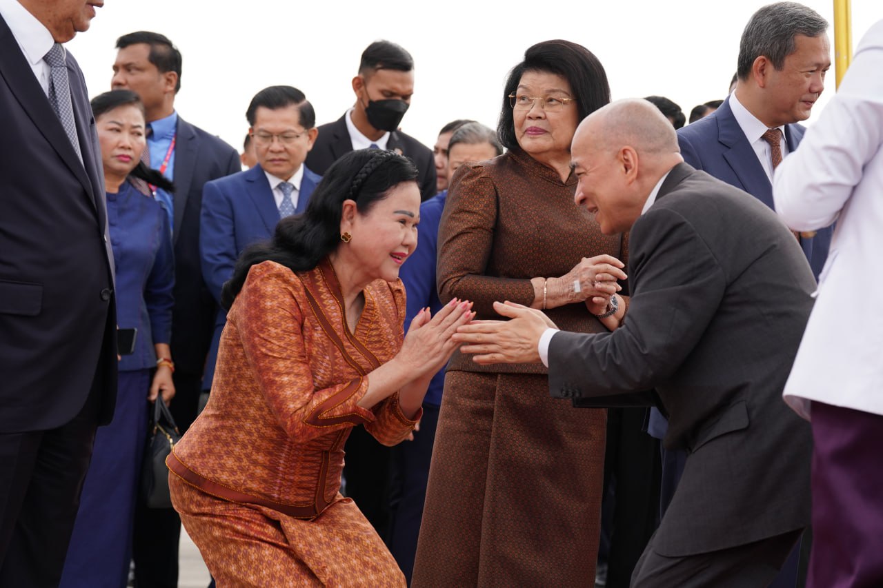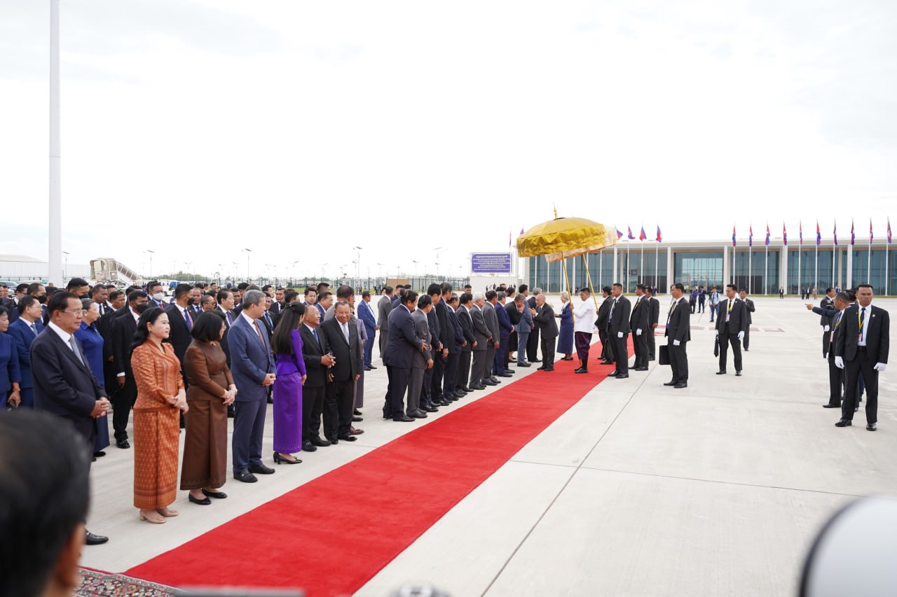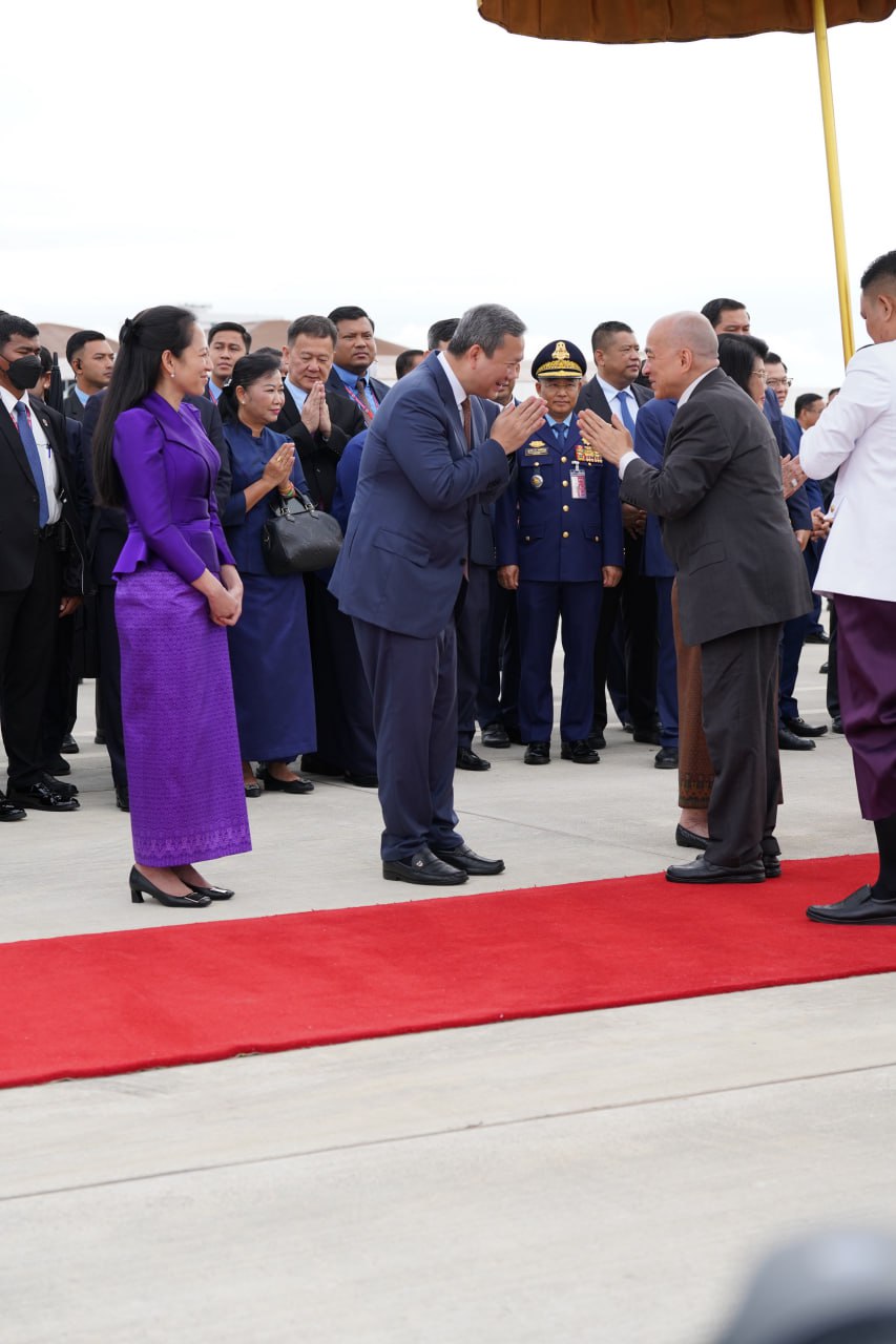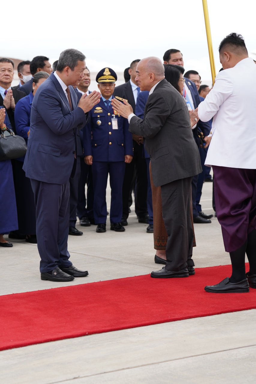 យាង និងអញ្ជើញថ្វាយព្រះរាជដំណើរព្រះអង្គទាំងទ្វេ នៅអាកាសយានដ្ឋានអន្តរជាតិតេជោ មានវត្តមាន សម្ដេចអគ្គមហាសេនាបតីតេជោ ហ៊ុន សែន ប្រធានក្រុមឧត្ដមប្រឹក្សាផ្ទាល់ព្រះមហាក្សត្រ និងជាប្រធានព្រឹទ្ធសភានៃព្រះរាជាណាចក្រកម្ពុជា និងសម្ដេចកិត្តិព្រឹទ្ធបណ្ឌិត ប៊ុន រ៉ានី ហ៊ុនសែន សម្ដេចមហារដ្ឋសភាធិការធិបតី ឃួន សុដារី ប្រធានរដ្ឋសភា សម្ដេចមហាបវរធិបតី ហ៊ុន ម៉ាណែត នាយករដ្ឋមន្ត្រីនៃព្រះរាជាណាចក្រកម្ពុជា និងលោកជំទាវបណ្ឌិត ព្រមទាំងសម្ដេច ឯកឧត្ដម លោកជំទាវ ជាសមាជិកសមាជិកាឧត្ដមប្រឹក្សាផ្ទាល់ព្រះមហាក្សត្រ ព្រះរាជវង្សានុវង្ស និងឯកឧត្តម Wang Wenbin ឯកអគ្គរដ្ឋទូតសាធារណរដ្ឋប្រជាមានិតចិន ប្រចាំនៅកម្ពុជាផងដែរ។