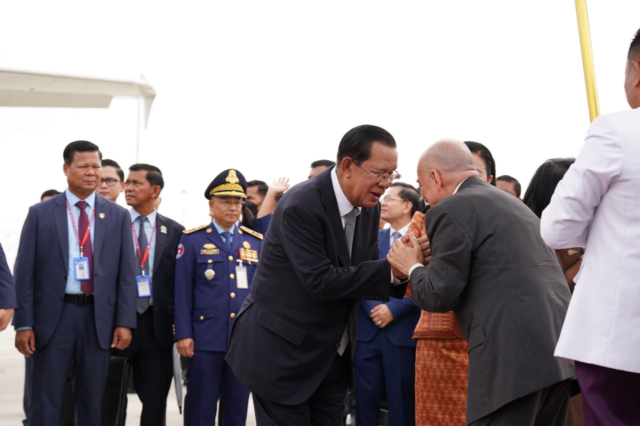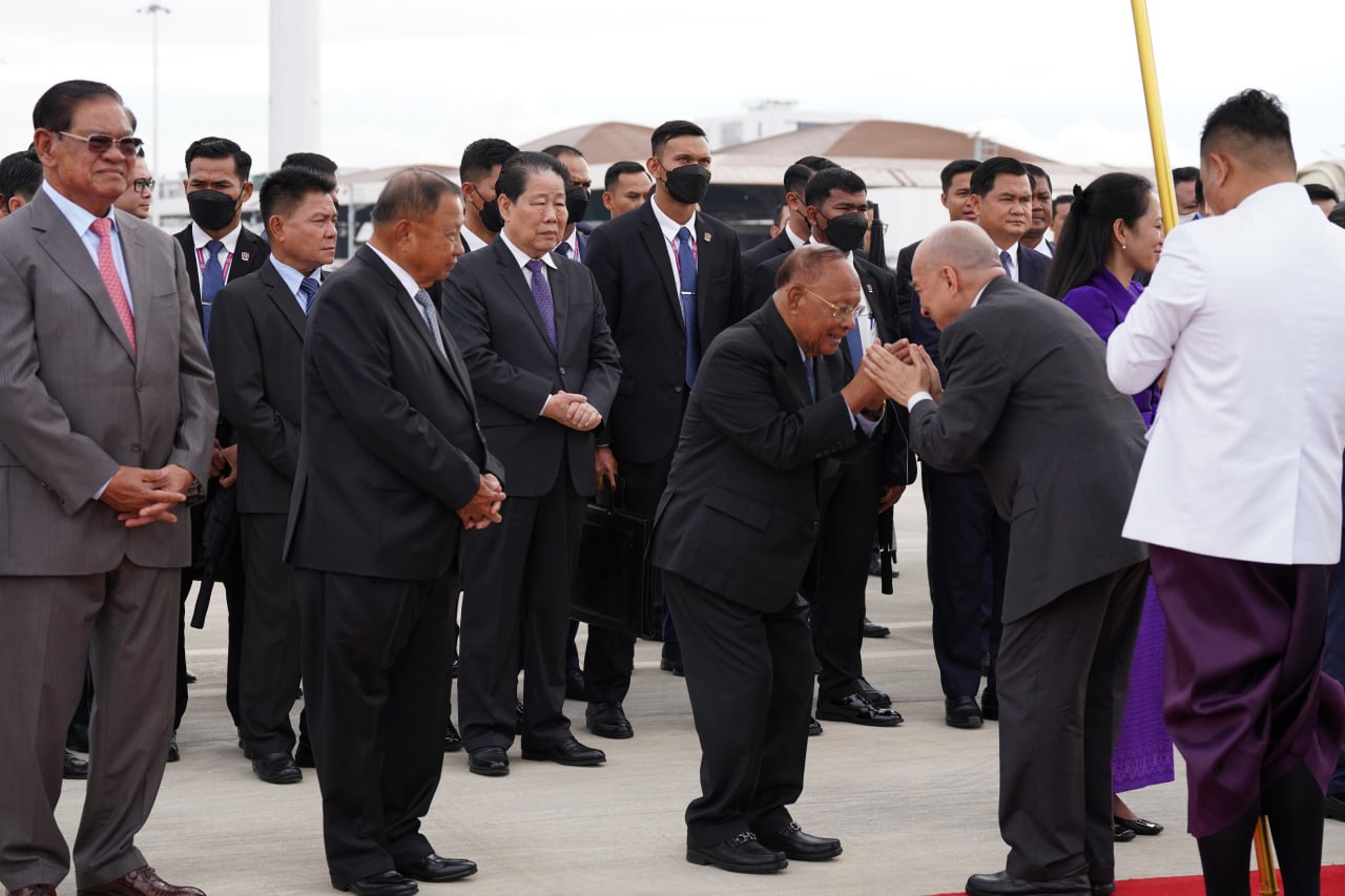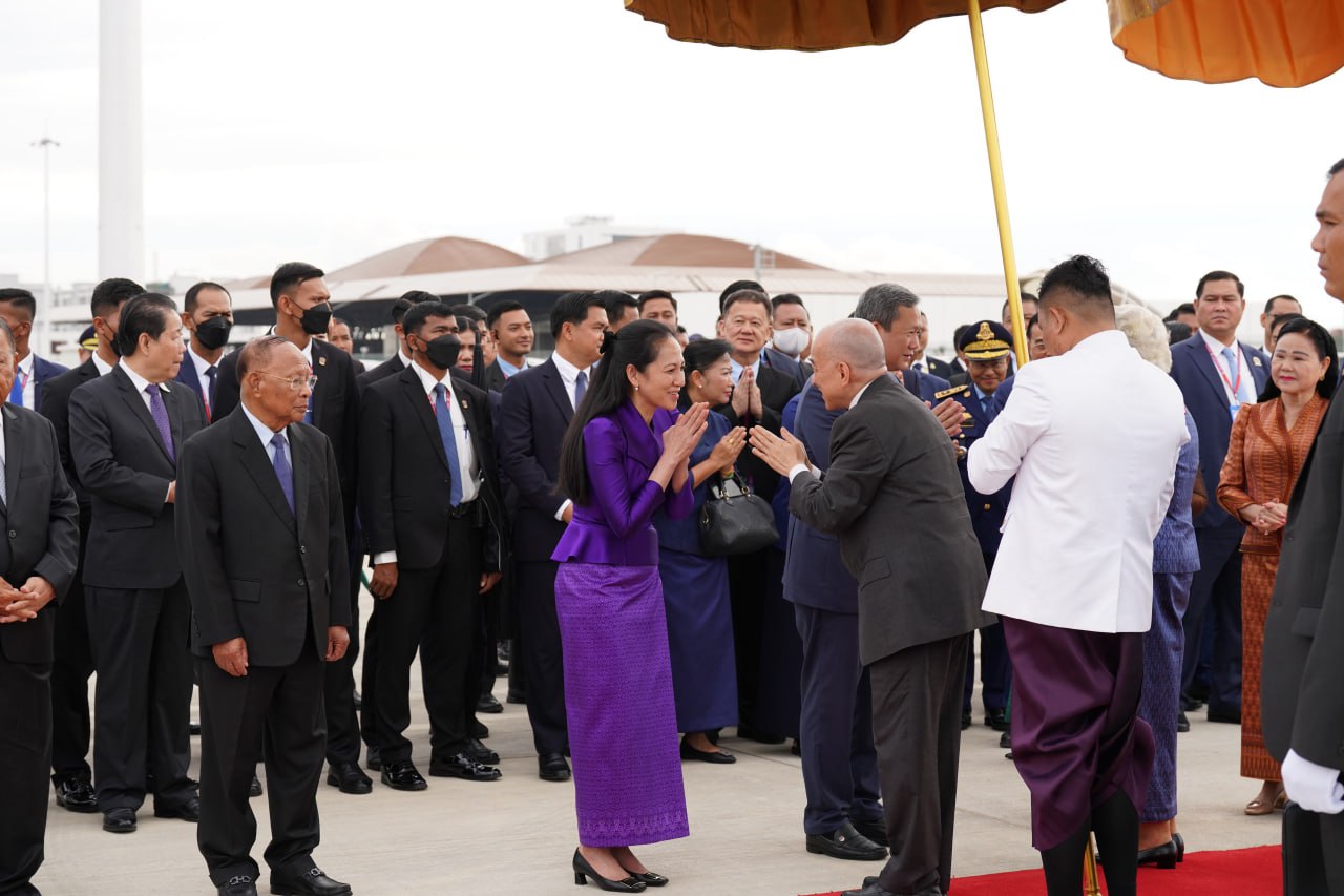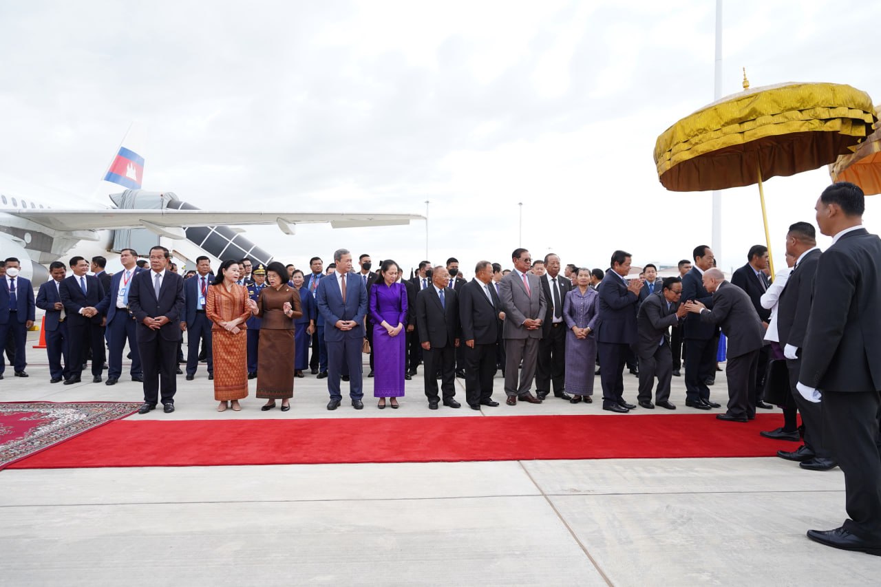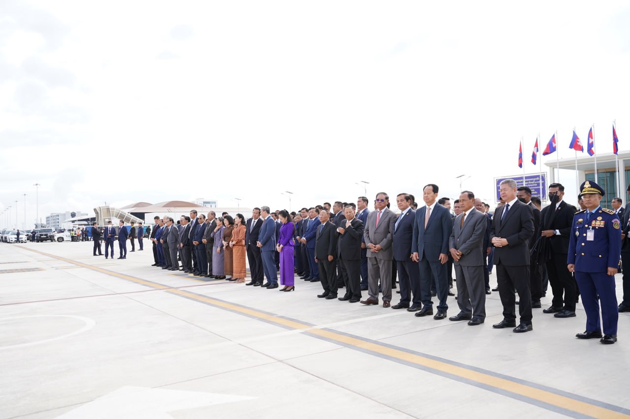 យាង និងអញ្ជើញថ្វាយព្រះរាជដំណើរព្រះអង្គទាំងទ្វេ នៅអាកាសយានដ្ឋានអន្តរជាតិតេជោ មានវត្តមាន សម្ដេចអគ្គមហាសេនាបតីតេជោ ហ៊ុន សែន ប្រធានក្រុមឧត្ដមប្រឹក្សាផ្ទាល់ព្រះមហាក្សត្រ និងជាប្រធានព្រឹទ្ធសភានៃព្រះរាជាណាចក្រកម្ពុជា និងសម្ដេចកិត្តិព្រឹទ្ធបណ្ឌិត ប៊ុន រ៉ានី ហ៊ុនសែន សម្ដេចមហារដ្ឋសភាធិការធិបតី ឃួន សុដារី ប្រធានរដ្ឋសភា សម្ដេចមហាបវរធិបតី ហ៊ុន ម៉ាណែត នាយករដ្ឋមន្ត្រីនៃព្រះរាជាណាចក្រកម្ពុជា និងលោកជំទាវបណ្ឌិត ព្រមទាំងសម្ដេច ឯកឧត្ដម លោកជំទាវ ជាសមាជិកសមាជិកាឧត្ដមប្រឹក្សាផ្ទាល់ព្រះមហាក្សត្រ ព្រះរាជវង្សានុវង្ស និងឯកឧត្តម Wang Wenbin ឯកអគ្គរដ្ឋទូតសាធារណរដ្ឋប្រជាមានិតចិន ប្រចាំនៅកម្ពុជាផងដែរ។