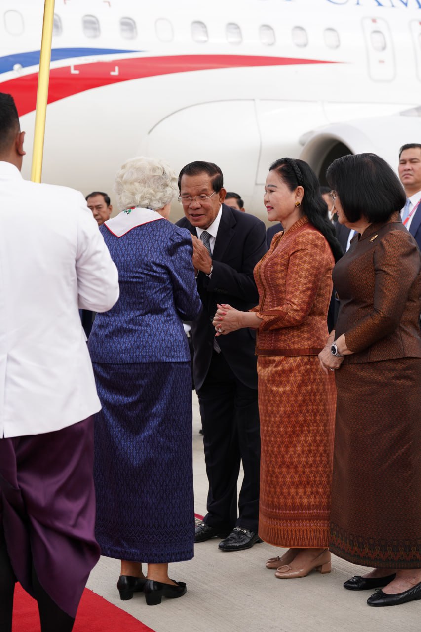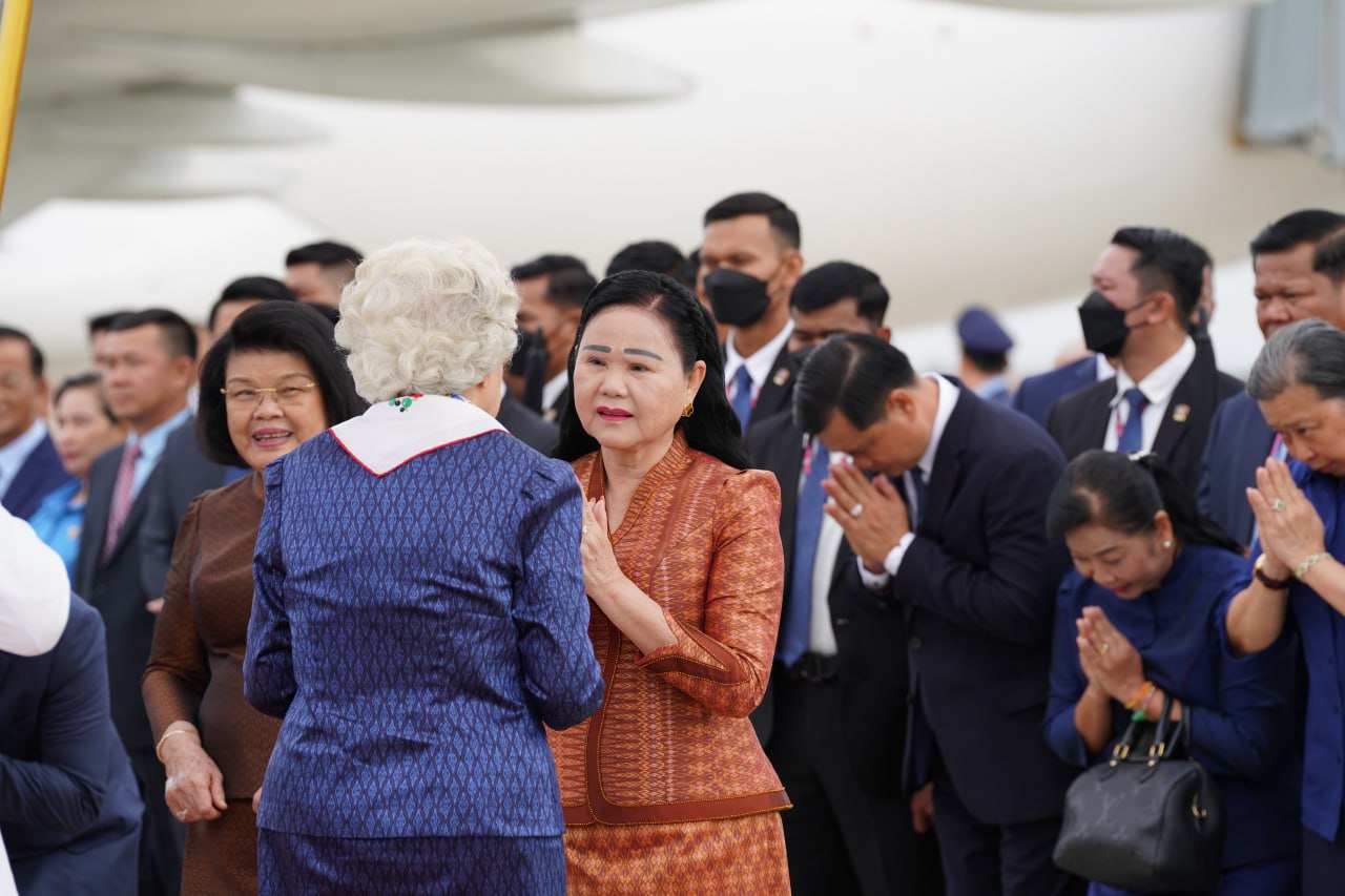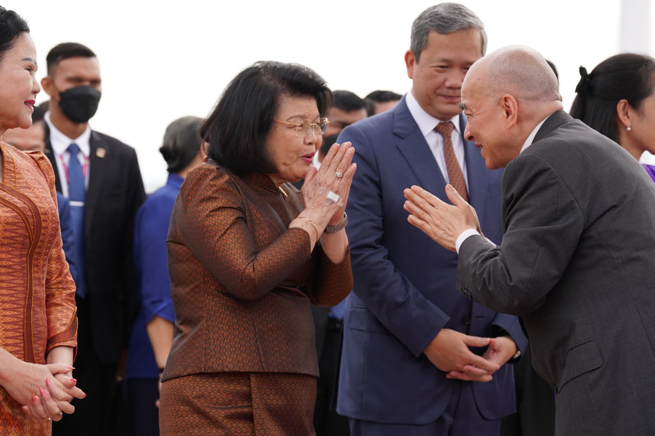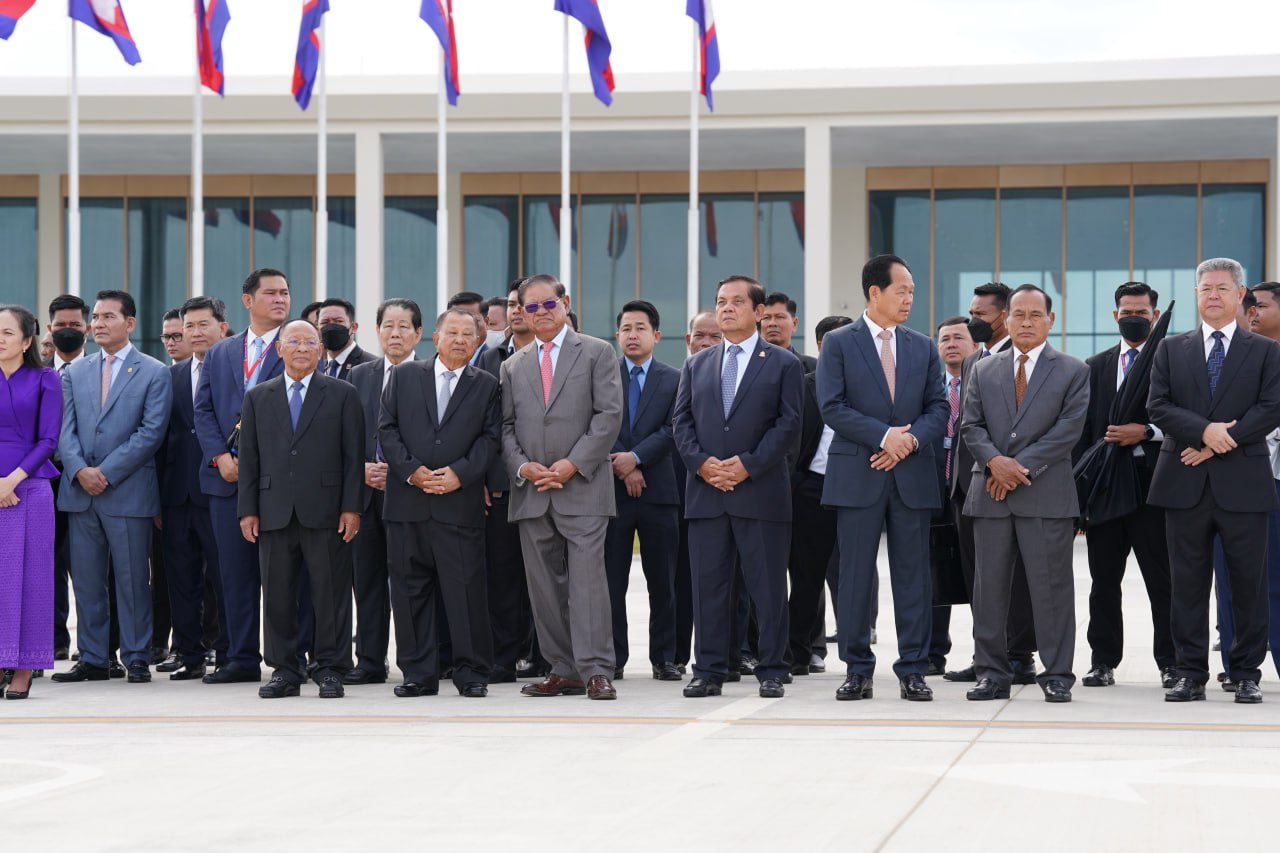 យាង និងអញ្ជើញថ្វាយព្រះរាជដំណើរព្រះអង្គទាំងទ្វេ នៅអាកាសយានដ្ឋានអន្តរជាតិតេជោ មានវត្តមាន សម្ដេចអគ្គមហាសេនាបតីតេជោ ហ៊ុន សែន ប្រធានក្រុមឧត្ដមប្រឹក្សាផ្ទាល់ព្រះមហាក្សត្រ និងជាប្រធានព្រឹទ្ធសភានៃព្រះរាជាណាចក្រកម្ពុជា និងសម្ដេចកិត្តិព្រឹទ្ធបណ្ឌិត ប៊ុន រ៉ានី ហ៊ុនសែន សម្ដេចមហារដ្ឋសភាធិការធិបតី ឃួន សុដារី ប្រធានរដ្ឋសភា សម្ដេចមហាបវរធិបតី ហ៊ុន ម៉ាណែត នាយករដ្ឋមន្ត្រីនៃព្រះរាជាណាចក្រកម្ពុជា និងលោកជំទាវបណ្ឌិត ព្រមទាំងសម្ដេច ឯកឧត្ដម លោកជំទាវ ជាសមាជិកសមាជិកាឧត្ដមប្រឹក្សាផ្ទាល់ព្រះមហាក្សត្រ ព្រះរាជវង្សានុវង្ស និងឯកឧត្តម Wang Wenbin ឯកអគ្គរដ្ឋទូតសាធារណរដ្ឋប្រជាមានិតចិន ប្រចាំនៅកម្ពុជាផងដែរ។