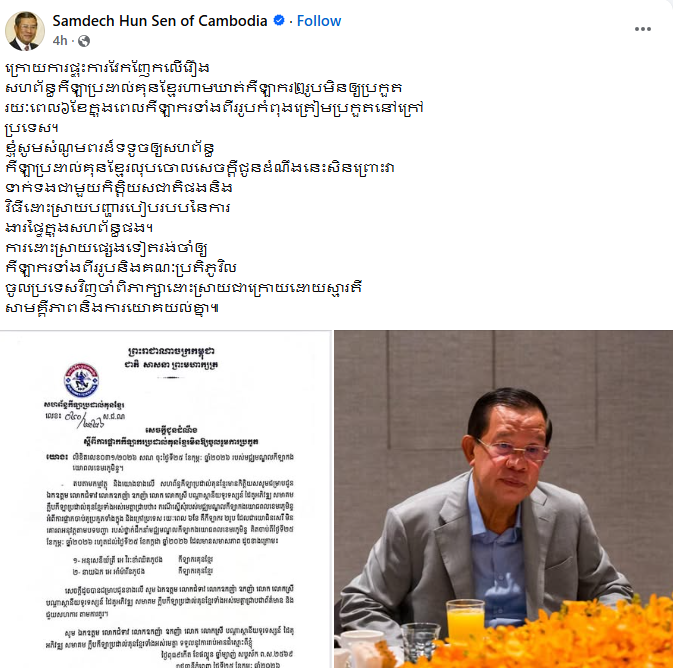 ក្រោយមានការស្នើរបស់សម្តេចតេជោ ហ៊ុន សែន, សហព័ន្ធកីឡាប្រដាល់គុនខ្មែរ សម្រេចលុបសេចក្តីជូនដំណឹង ដែលហាមកីឡាករត្រកូល «អេ» ២រូប មិនឲ្យប្រកួតរយៈពេល៦ខែ