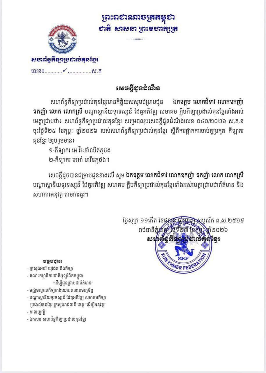 (ភ្នំពេញ)៖ សហព័ន្ធកីឡាប្រដាល់គុនខ្មែរ សម្រេចលុបសេចក្តីជូនដំណឹងលេខ ០៤០/២០២៦ ស.គ.ខ ចុះថ្ងៃទី២៥ ខែកុម្ភៈ ឆ្នាំ២០២៦ របស់សហព័ន្ធកីឡាប្រដាល់គុនខ្មែរ ស្តីពីការផ្អាកការចាប់គូប្រកួត កីឡាករ គុនខ្មែរ ២រូប រួមមាន ១៖ កីឡាករ អេ វិរៈខាំឈិតភូថង និង២៖ កីឡាករ អេអាំ ម៉ារីនភូថង។