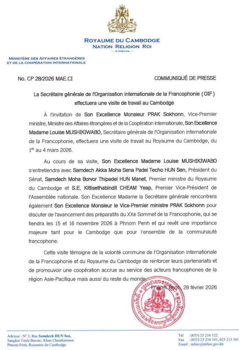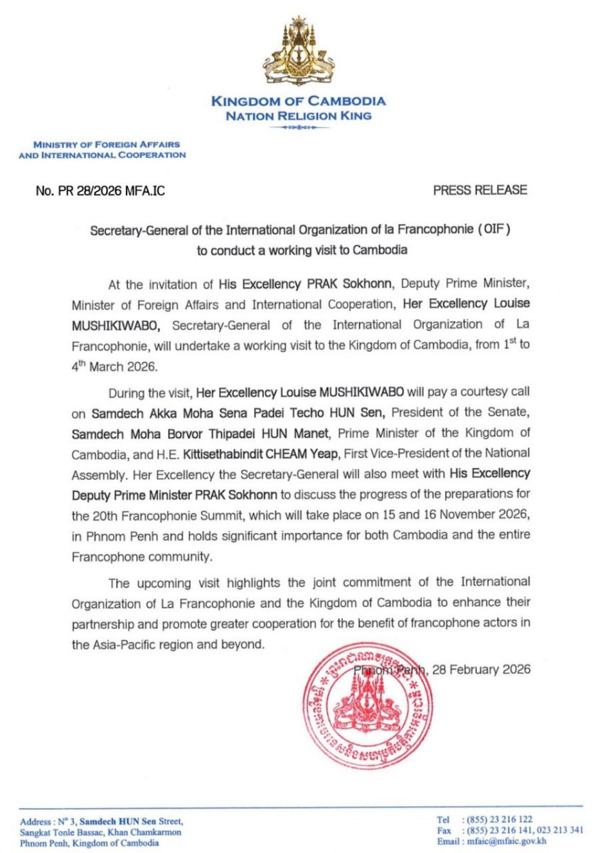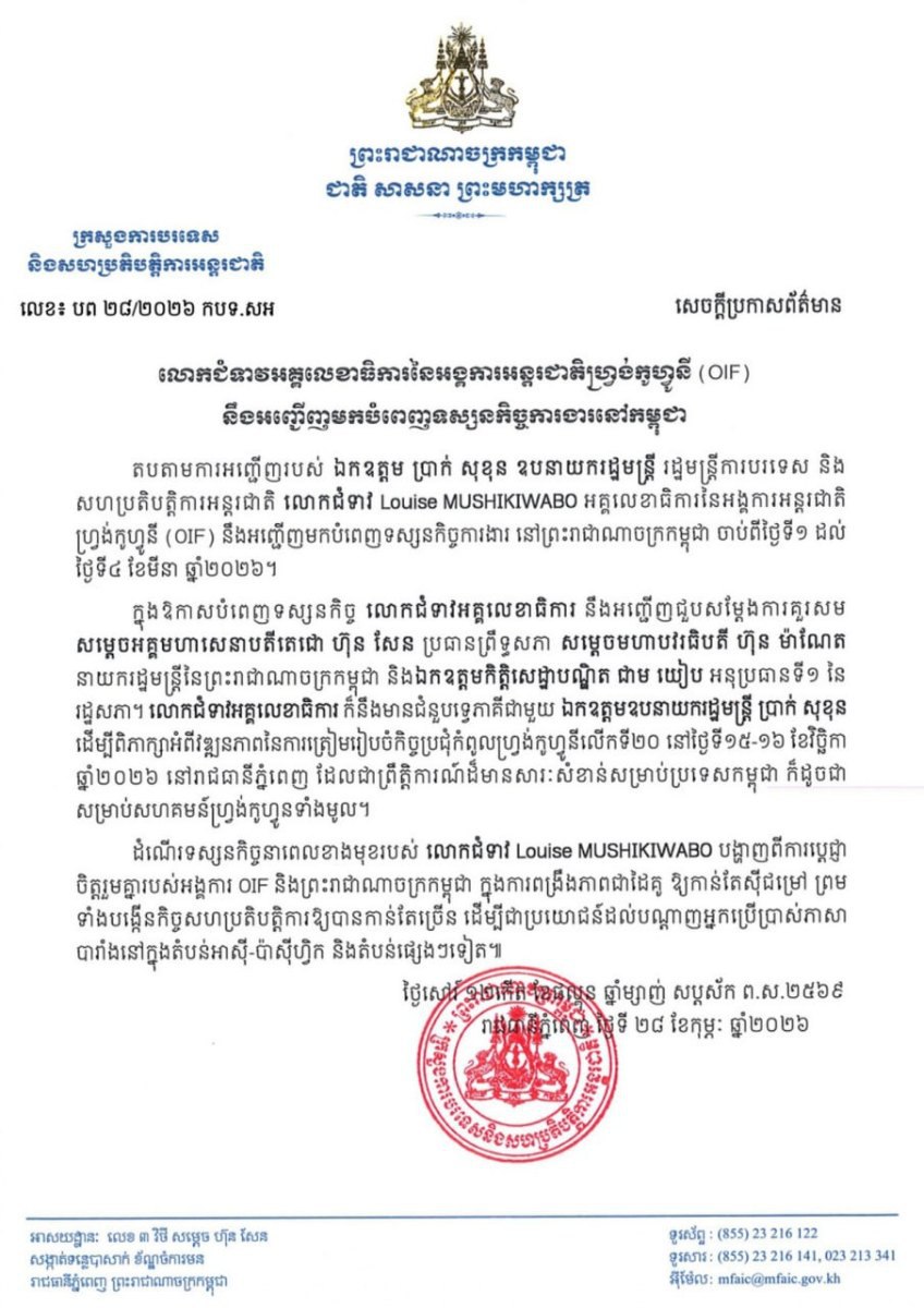 តបតាមការអញ្ជើញរបស់ឯកឧត្តម ប្រាក់ សុខុន ឧបនាយករដ្ឋមន្ត្រី រដ្ឋមន្ត្រីការបរទេស និង សហប្រតិបត្តិការអន្តរជាតិ លោកជំទាវ Louise MUSHIKIWABO អគ្គលេខាធិការនៃអង្គការអន្តរជាតិ ហ្វ្រង់កូហ្វូនី (OIF) នឹងអញ្ជើញមកបំពេញទស្សនកិច្ចការងារ នៅព្រះរាជាណាចក្រកម្ពុជា ចាប់ពីថ្ងៃទី១ ដល់ ថ្ងៃទី៤ ខែមីនា ឆ្នាំ២០២៦។
