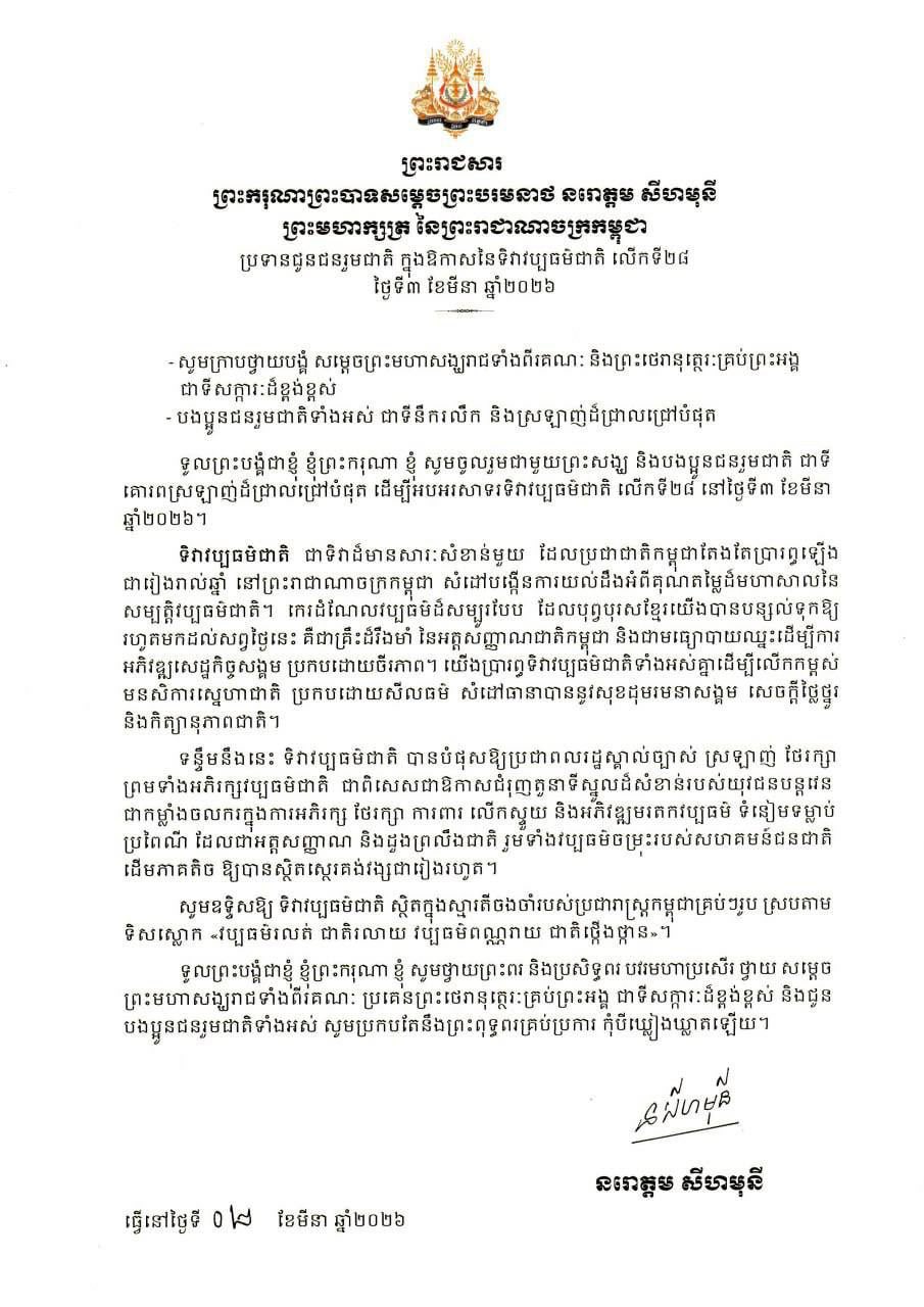 ព្រះមហាក្សត្រ ចេញព្រះរាជសារផ្ញើជូនជនរួមជាតិ ក្នុងឱកាសនៃទិវាវប្បធម៌ជាតិ លើកទី២៨ ថ្ងៃទី៣ ខែមីនា ឆ្នាំ២០២៦