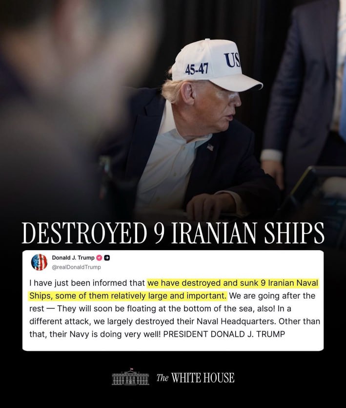 លោក ត្រាំ នៅក្នុងការបង្ហោះលើបណ្ដាញទំនាក់ទំនងសង្គម Truth Social បានសរសេរថា «ខ្ញុំទើបតែទទួលបានព័ត៌មានថាយើងបានបំផ្លាញ និងពន្លិចនាវាចម្បាំង៩គ្រឿងរបស់ អ៉ីរ៉ង់…នៅក្នុងការវាយប្រហារផ្សេងមួយទៀត យើងបានកម្ទេចទីស្នាក់ការកងទ័ពជើងទឹករបស់ពួកគេមួយផ្នែកធំ»។