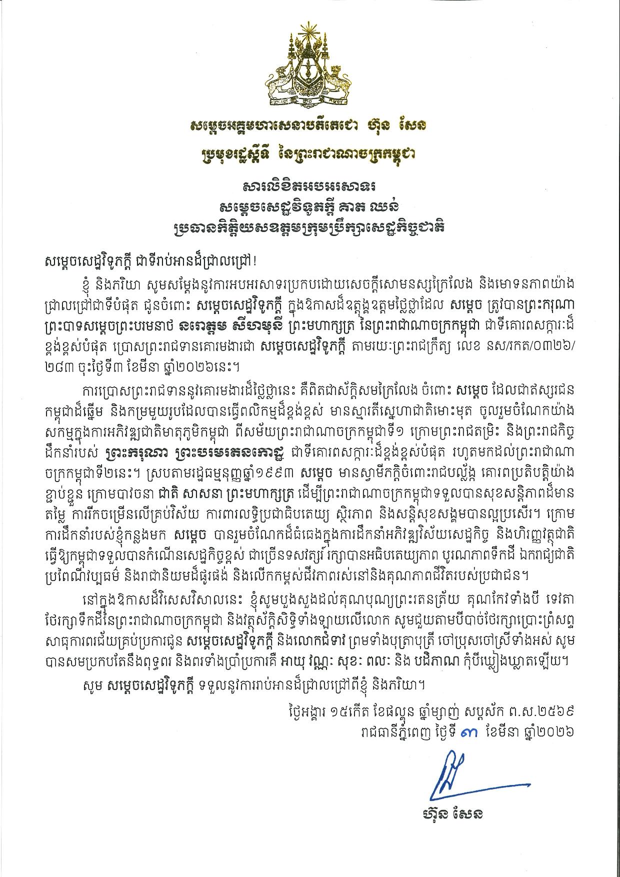 ក្នុងសារលិខិតអបអរសាទរ របស់សម្ដេចតេជោ ហ៊ុន សែន បានសរសេរថា «ខ្ញុំ និងភរិយា សូមសម្តែងនូវការអបអរសាទរ ប្រកបដោយសេចក្តីសោមនស្សក្រៃលែង និងមោទនភាពយ៉ាង ជ្រាលជ្រៅជាទីបំផុត ជូនចំពោះ សម្តេចសេដ្ឋវិទូភក្តី ក្នុងឱកាសដ៏ឧត្តុង្គឧត្តមថ្លៃថ្លាដែល សម្តេច ត្រូវបានព្រះករុណា ព្រះបាទសម្តេចព្រះបរមនាថ នរោត្តម សីហមុនី ព្រះមហាក្សត្រ នៃព្រះរាជាណាចក្រកម្ពុជា ជាទីគោរពសក្ការៈដ៏ខ្ពង់ខ្ពស់បំផុត ប្រោសព្រះរាជទានគោរមងារជា សម្តេចសេដ្ឋវិទូភក្តី តាមរយៈព្រះរាជក្រឹត្យ លេខ នស/រកត/០៣២៦/២៨៣ ចុះថ្ងៃទី៣ ខែមីនា ឆ្នាំ២០២៦នេះ។