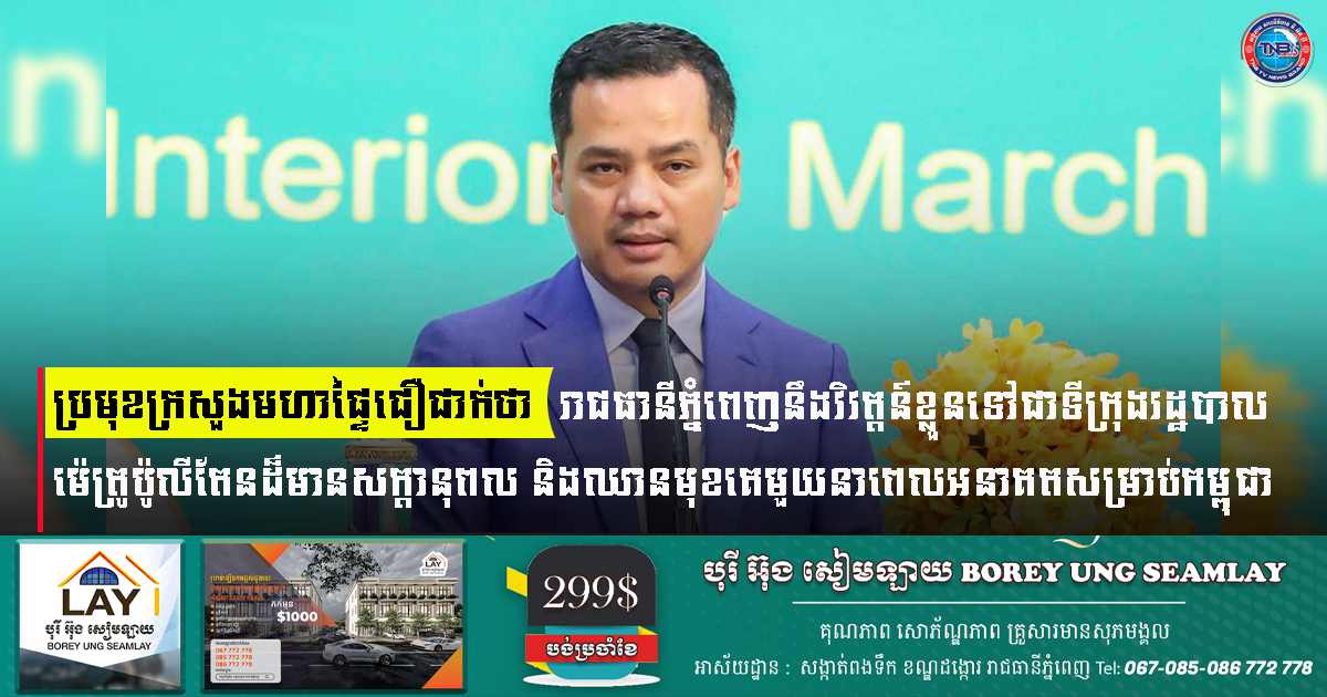 ប្រមុខក្រសួងមហាផ្ទៃជឿជាក់ថា រាជធានីភ្នំពេញនឹងវិវត្តន៍ខ្លួនទៅជាទីក្រុងរដ្ឋបាលម៉េត្រូប៉ូលីតែនដ៏មានសក្តានុពល និងឈានមុខគេមួយនាពេលអនាគតសម្រាប់កម្ពុជា